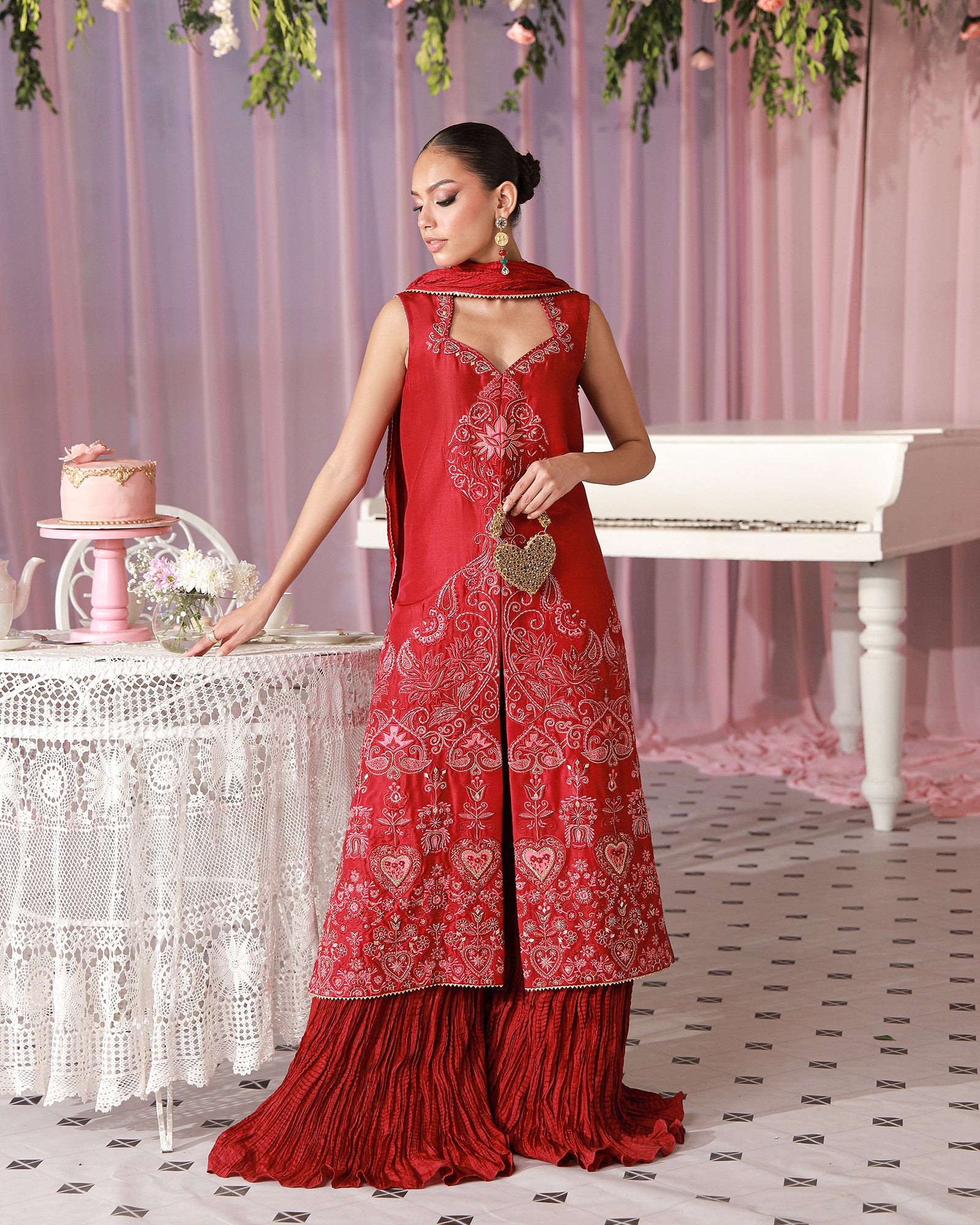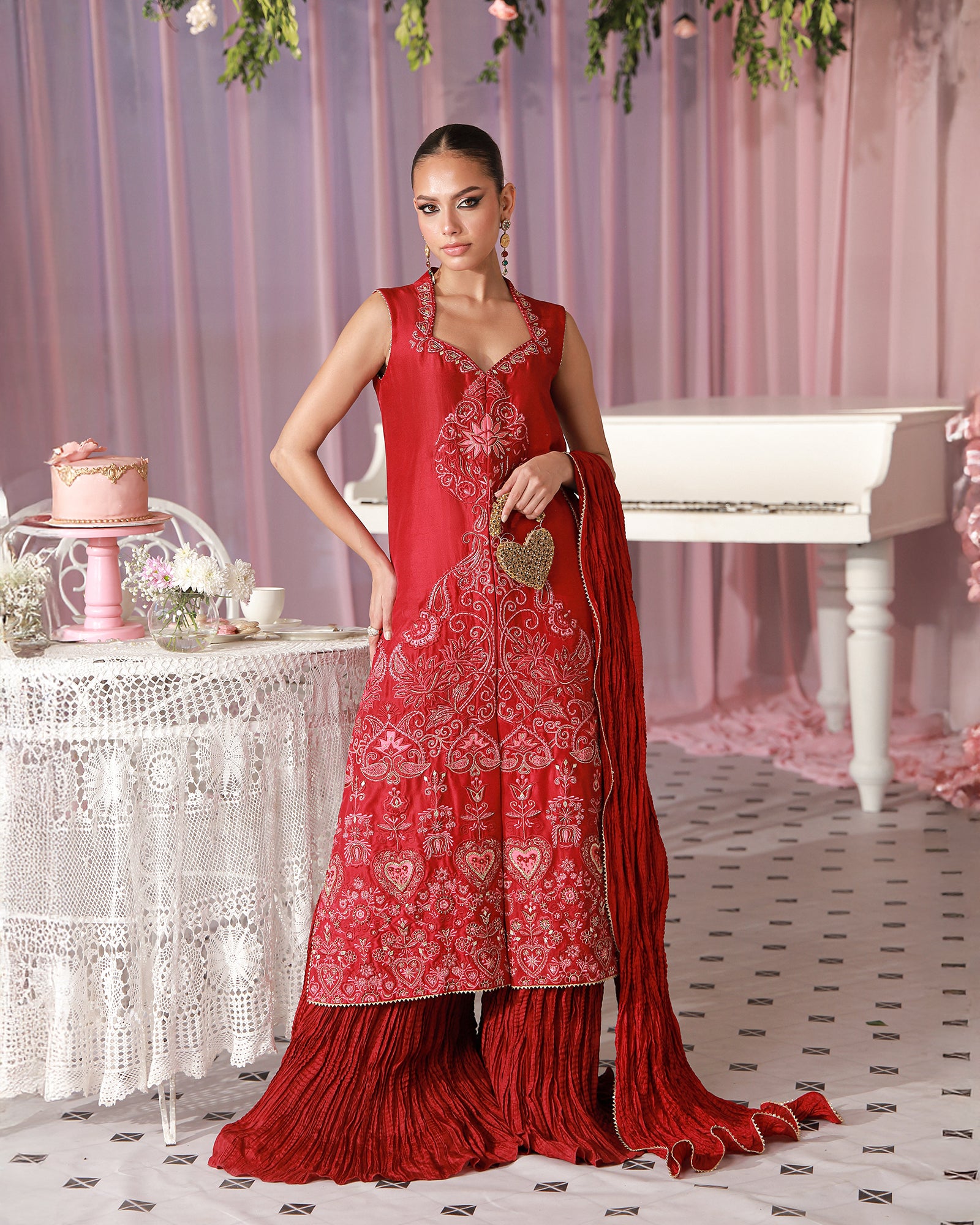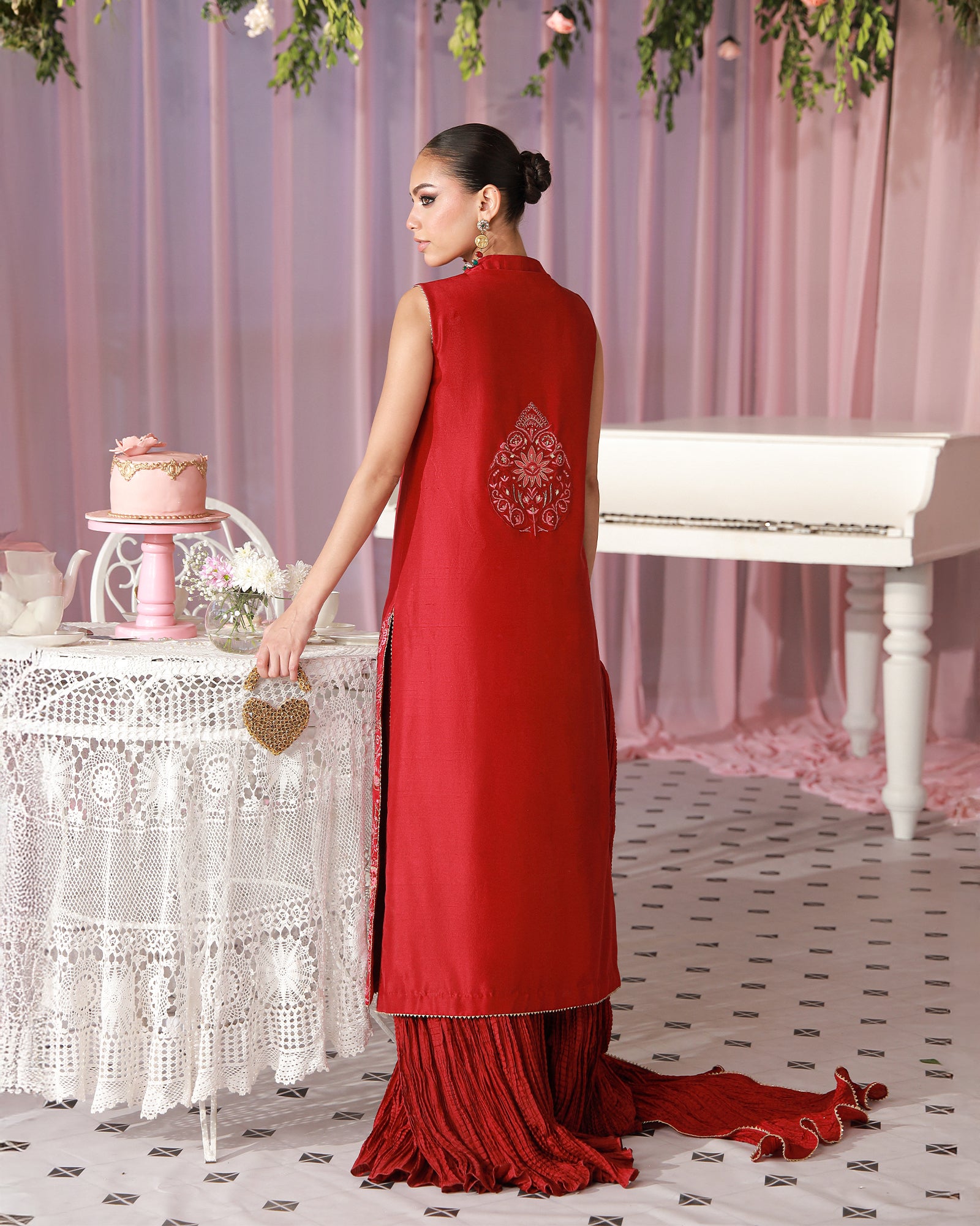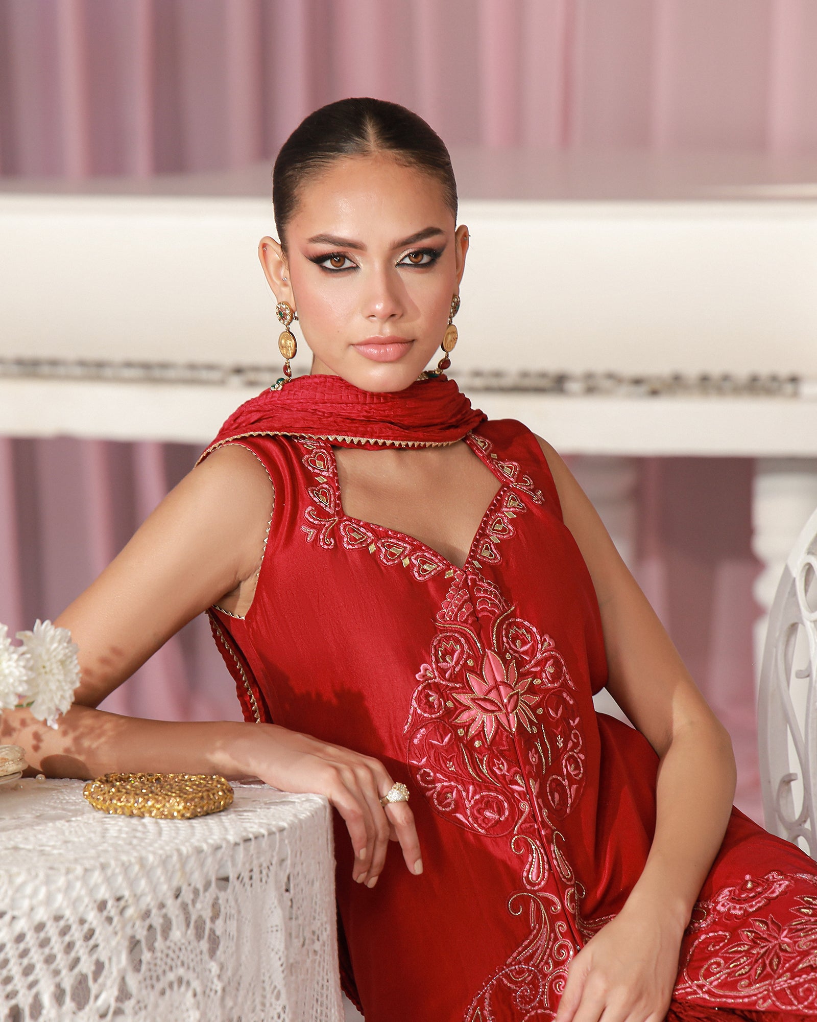Crafted from luxurious pure raw silk in a deep crimson hue, Arza embodies contemporary elegance with exquisite embroidery detailing. This modern silhouette combines refined texture with structured fluidity, celebrating feminine grace and timeless sophistication.