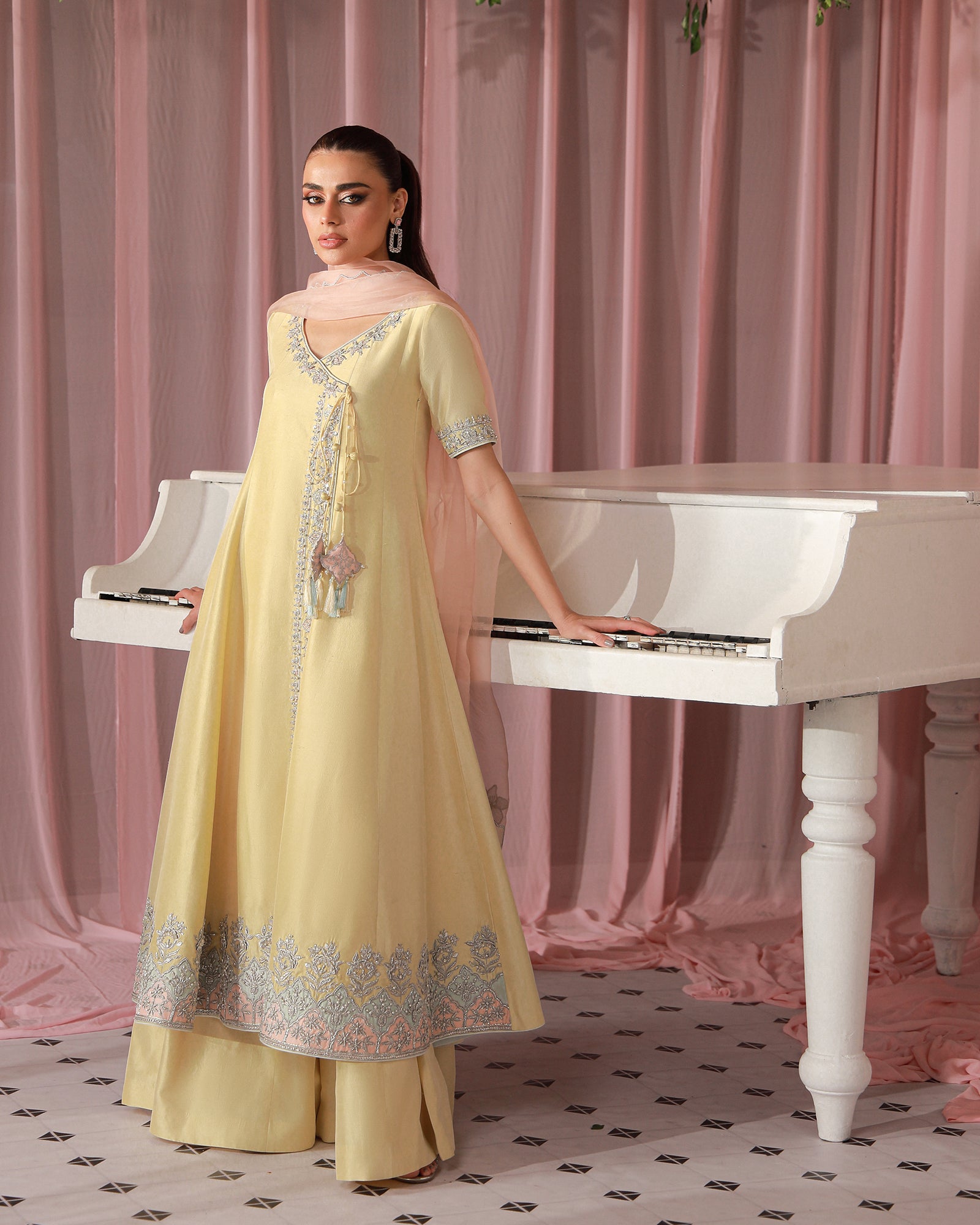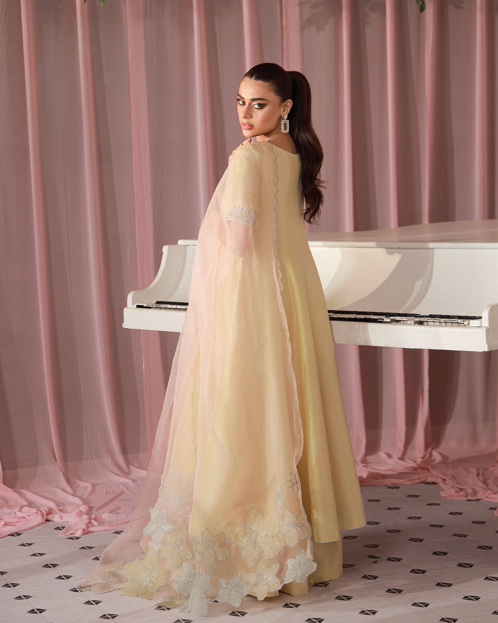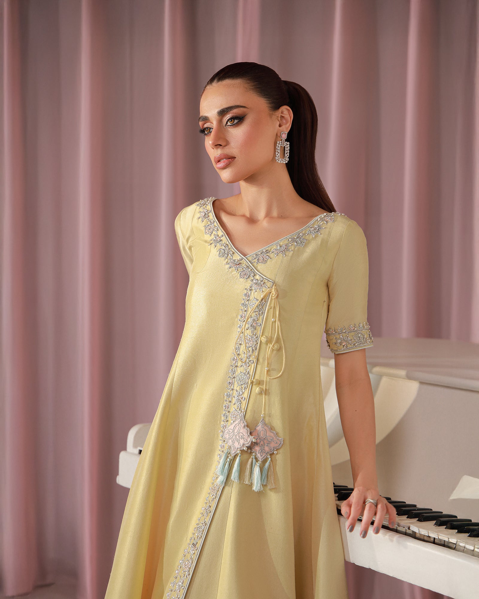 Crafted from pure raw silk in a soft butter-yellow hue, Auren reflects serene beauty and timeless poise. The pastel embroidery and flowing silhouette evoke subtle luxury, creating a perfect balance of warmth, refinement, and modern grace.