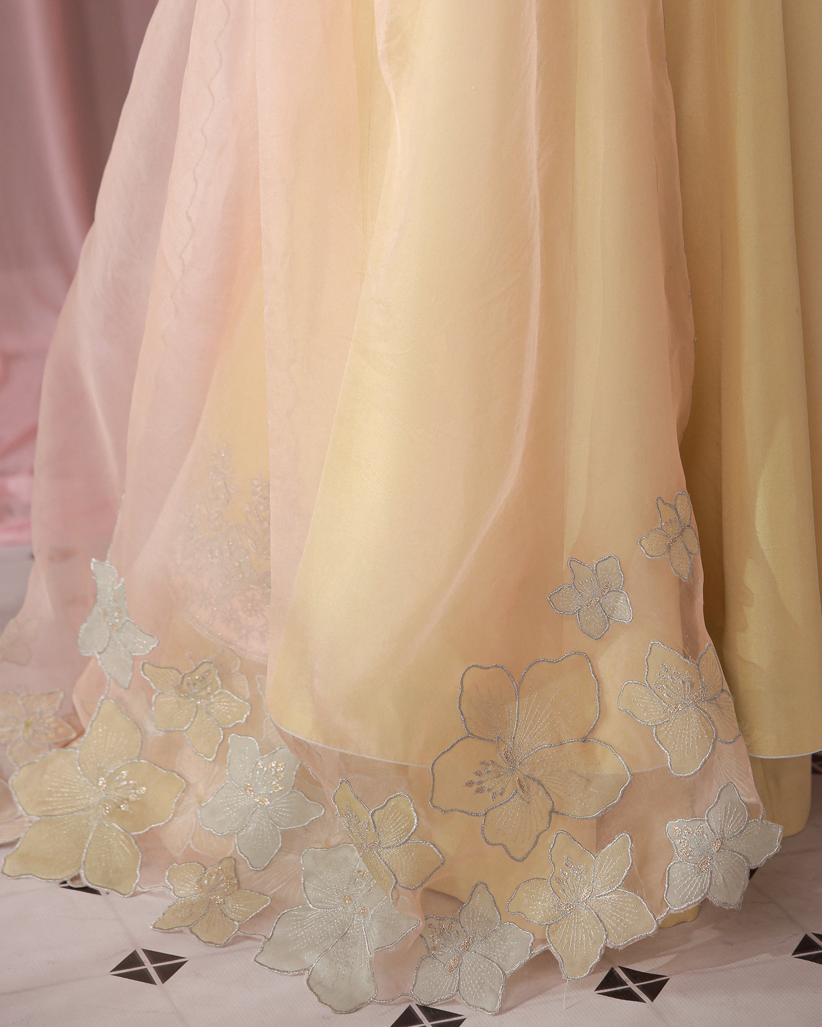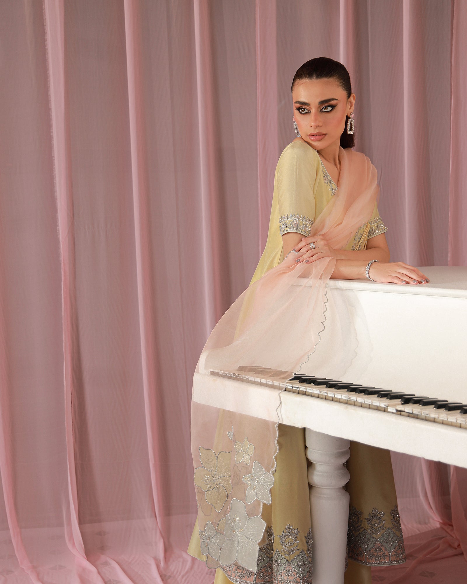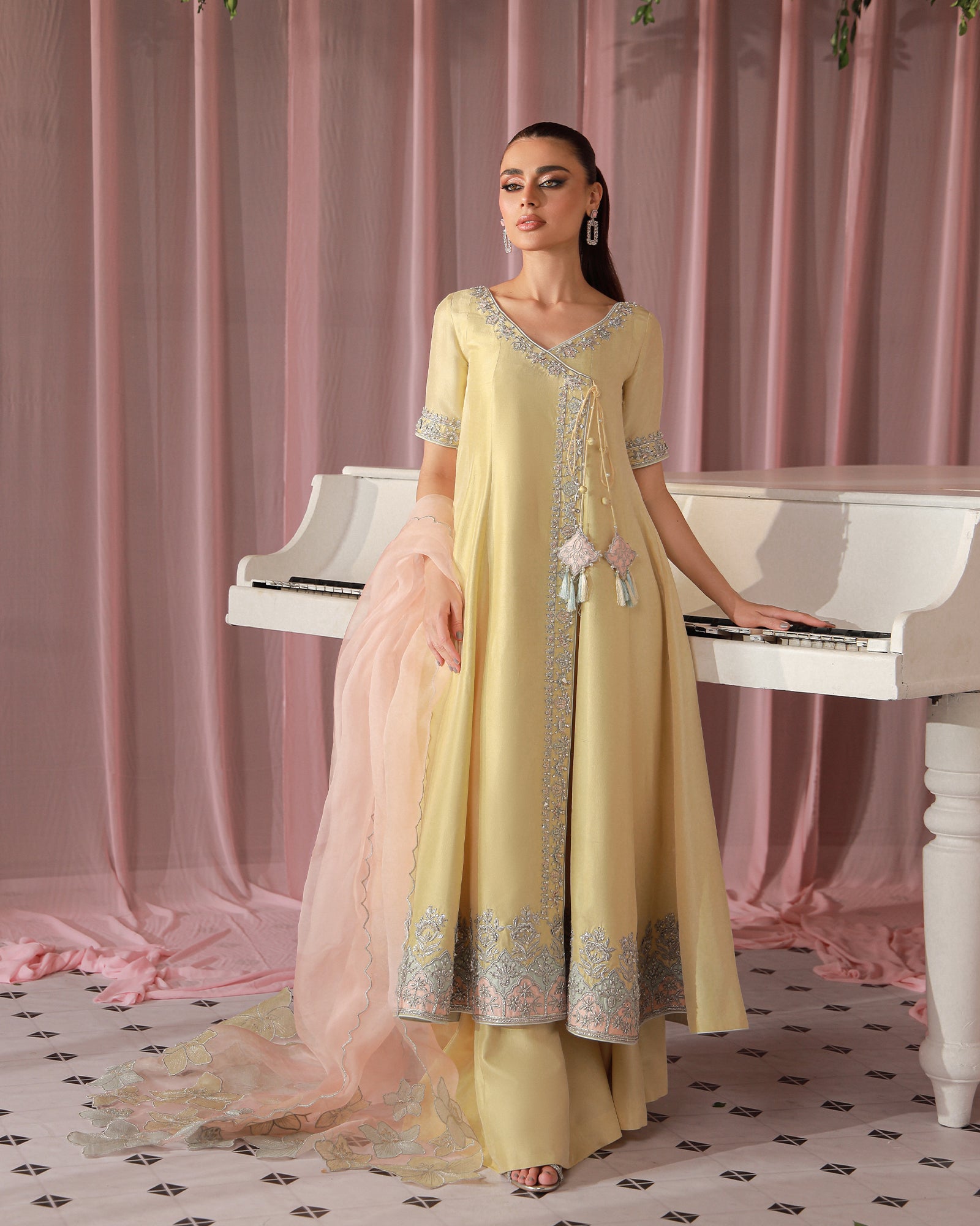 Crafted from pure raw silk in a soft butter-yellow hue, Auren reflects serene beauty and timeless poise. The pastel embroidery and flowing silhouette evoke subtle luxury, creating a perfect balance of warmth, refinement, and modern grace.