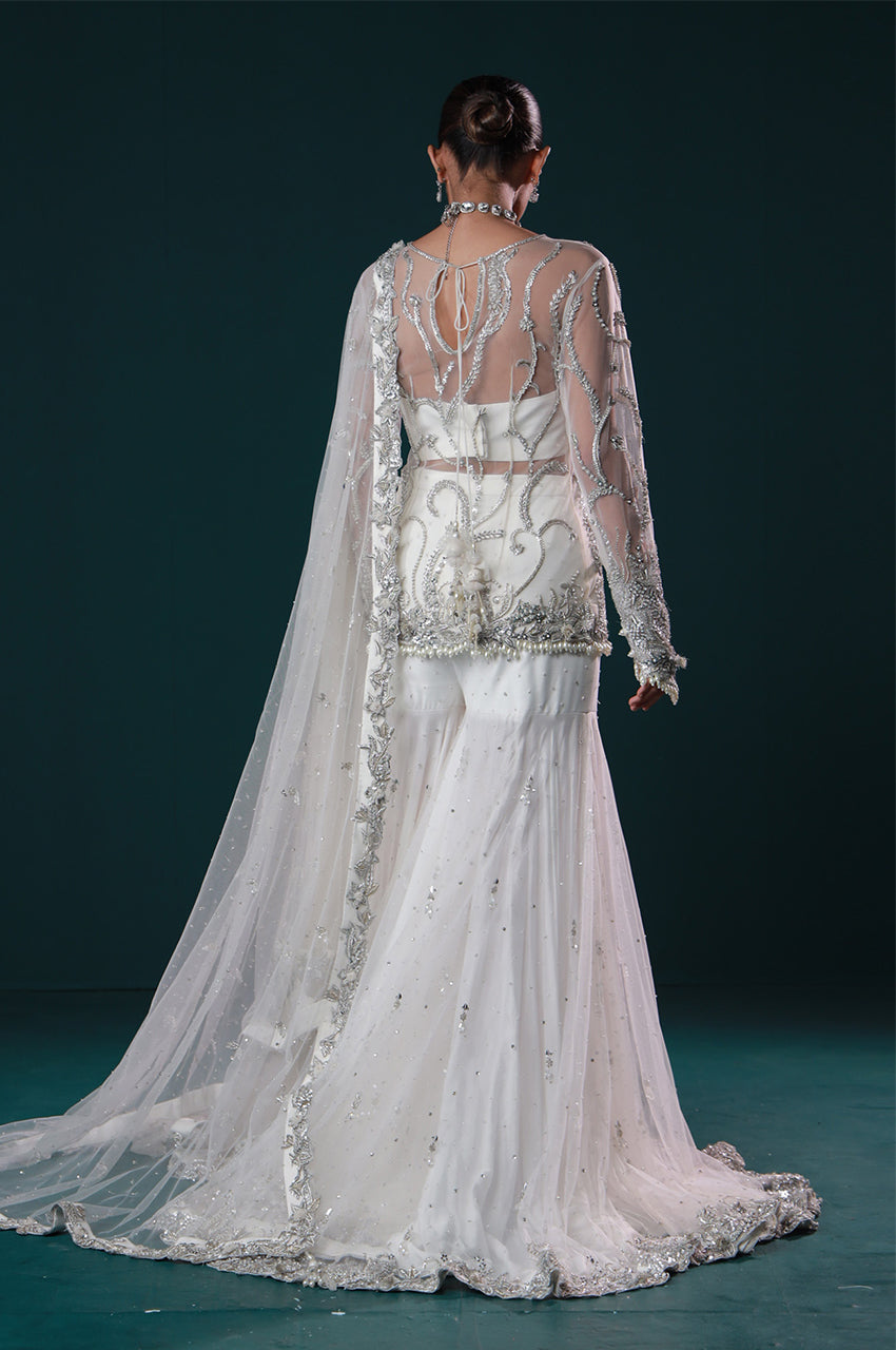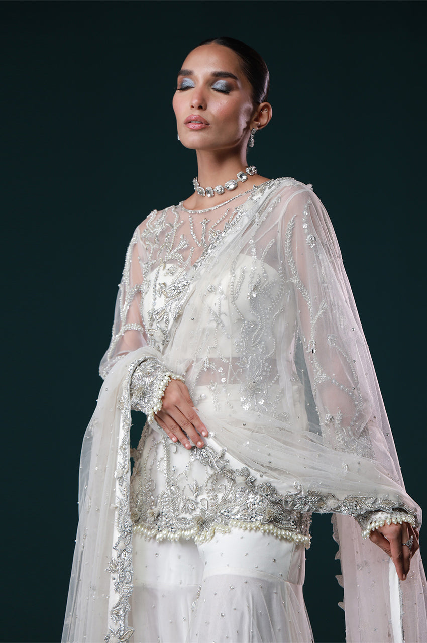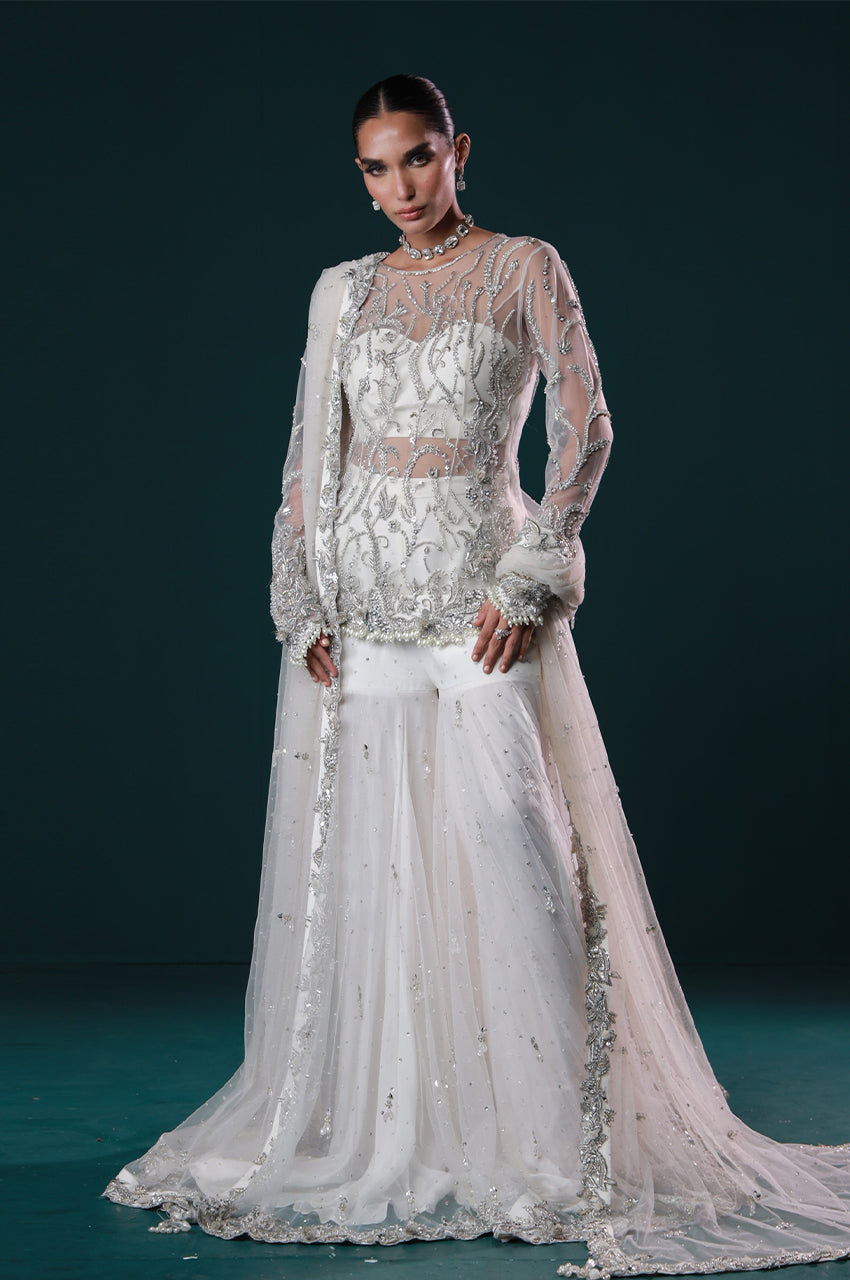 Ayel, a sculpted Gharara pants designed to make a luminous entrance. Adorned with intricate silver embellishments across a sheer shirt and bustier, this ensemble embodies contemporary bridal luxe, ethereal, refined, and made to mesmerize.