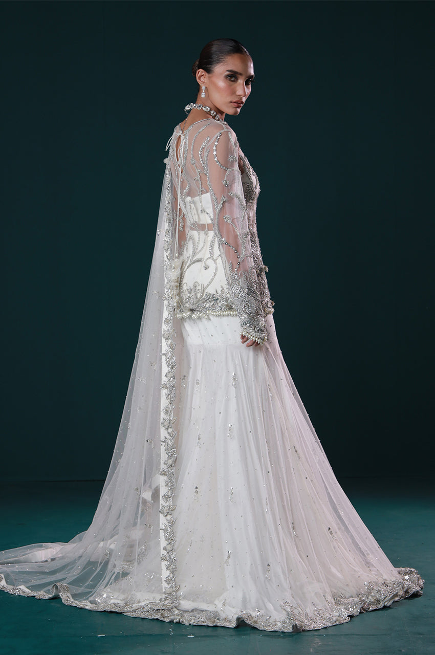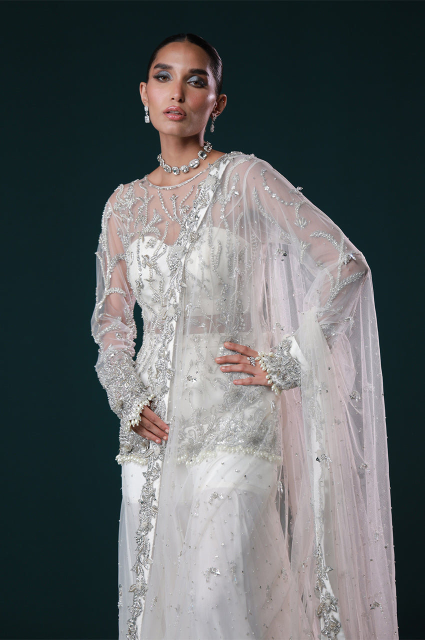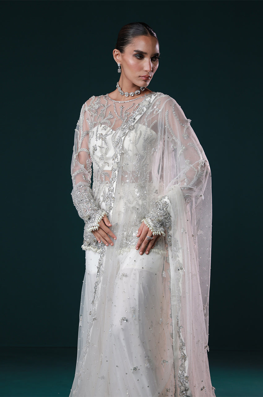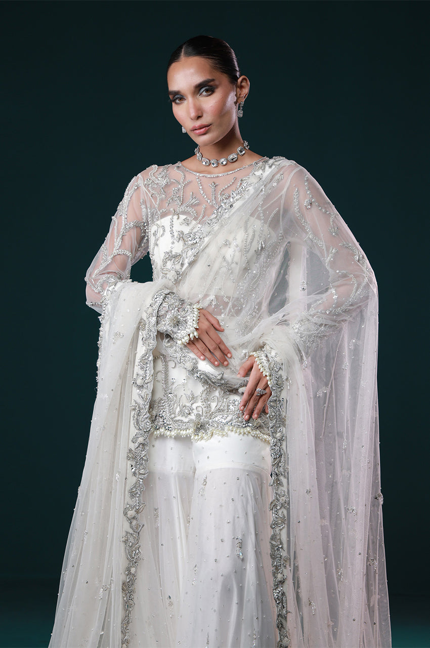 Ayel, a sculpted Gharara pants designed to make a luminous entrance. Adorned with intricate silver embellishments across a sheer shirt and bustier, this ensemble embodies contemporary bridal luxe, ethereal, refined, and made to mesmerize.