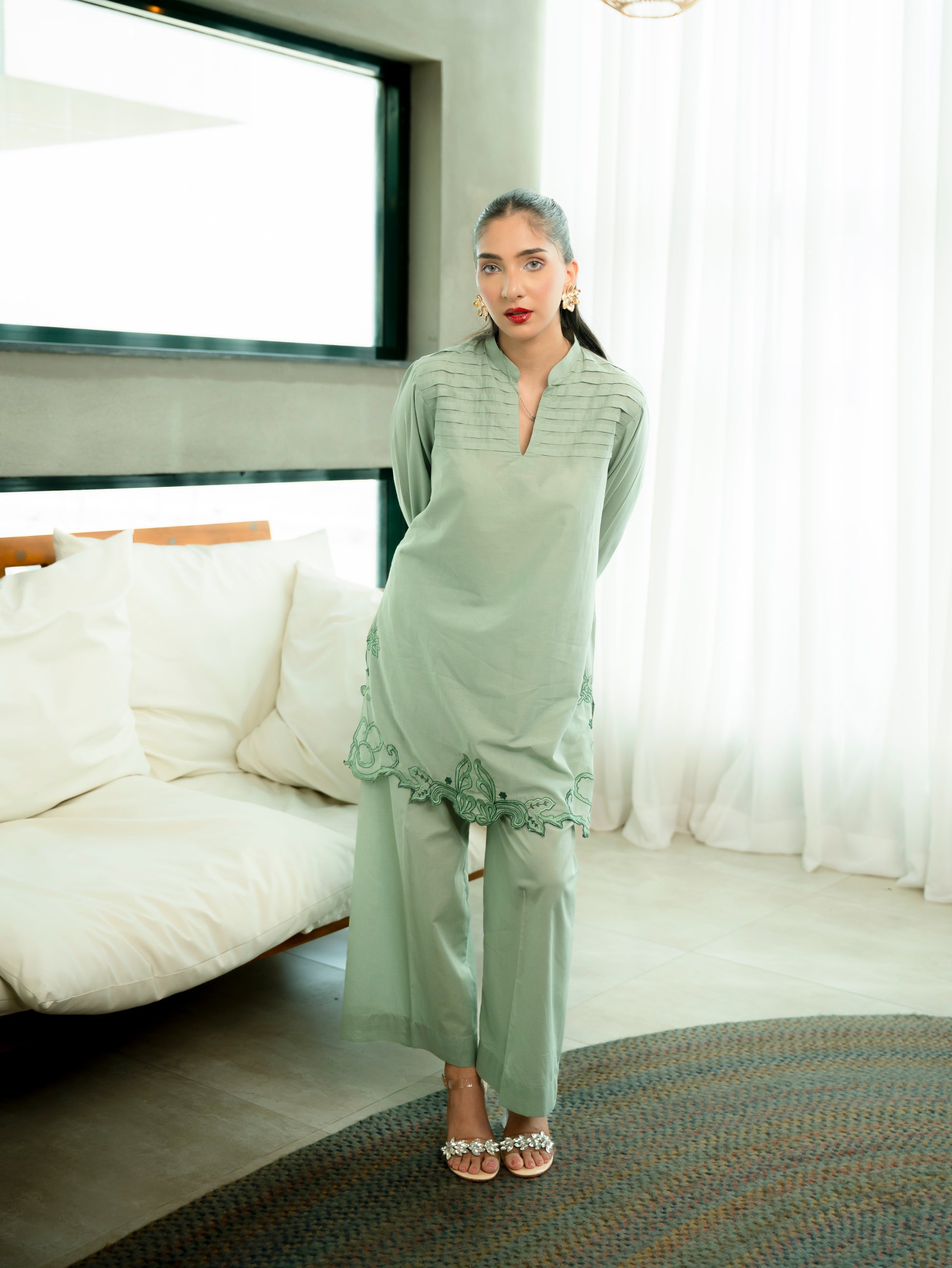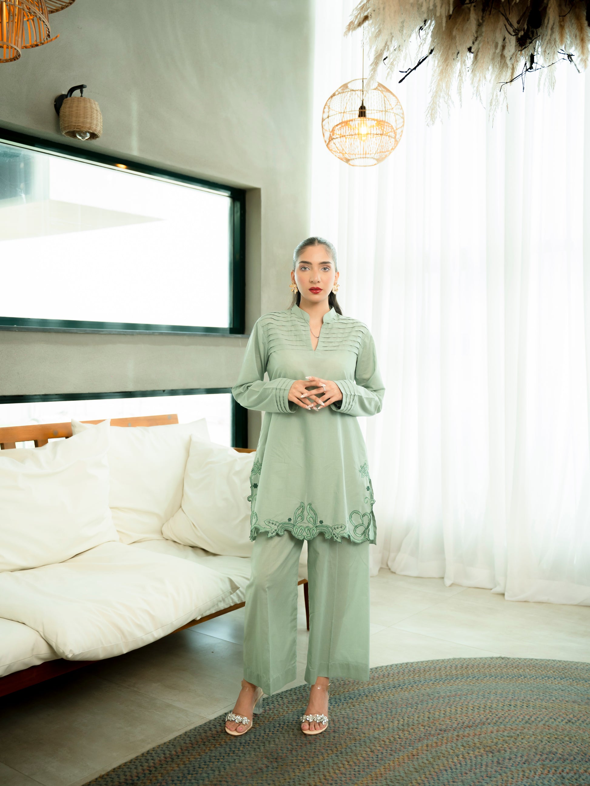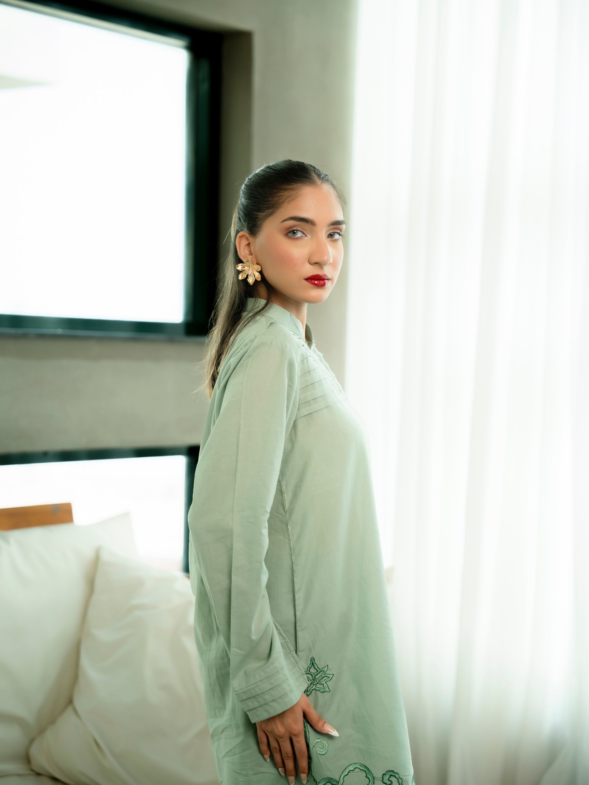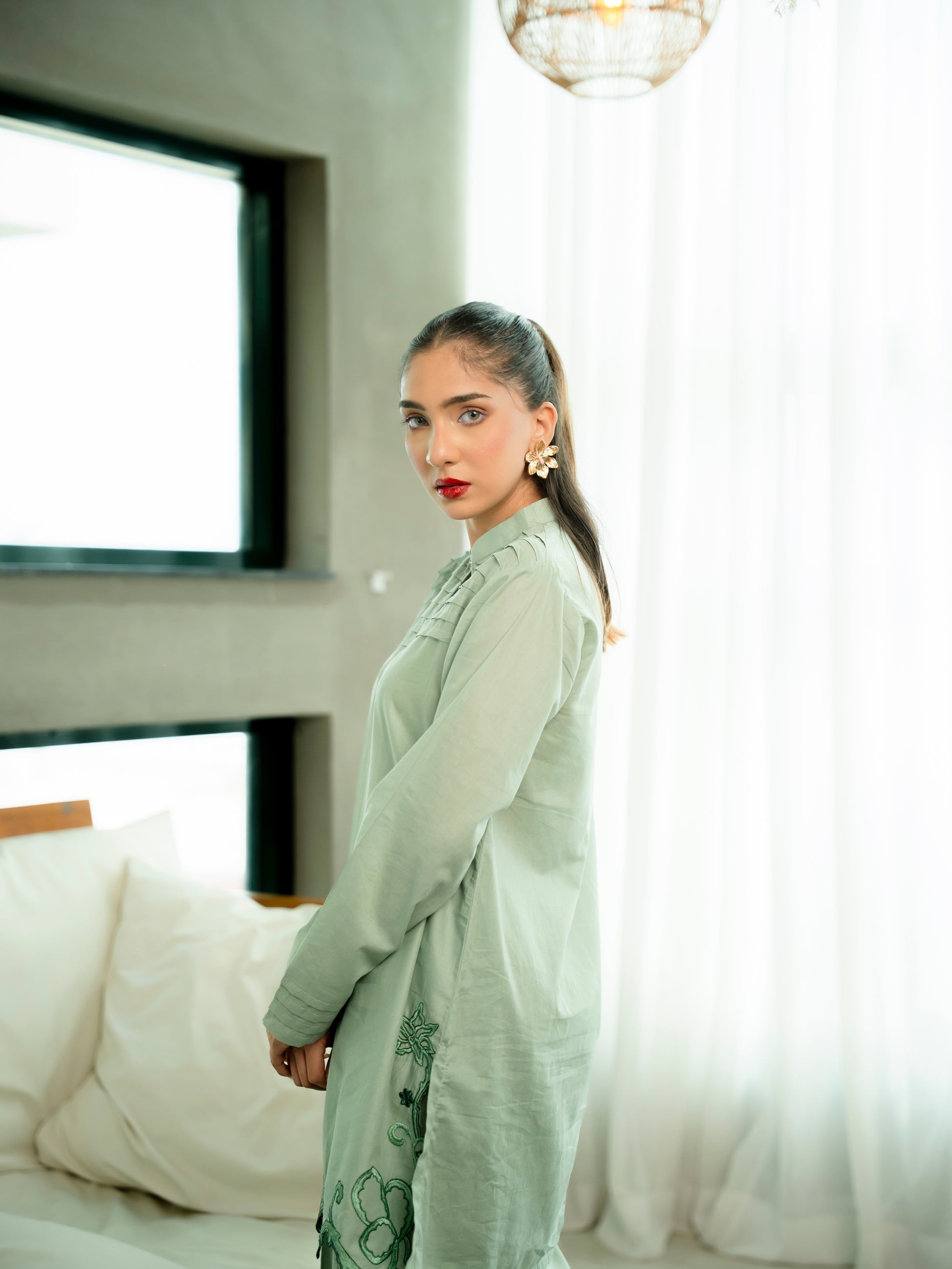 Ayra is grace in green—a clean, cool silhouette enriched with tonal embroidery that whispers elegance. designed for days that call for lightness, simplicity, and unmatched style.
