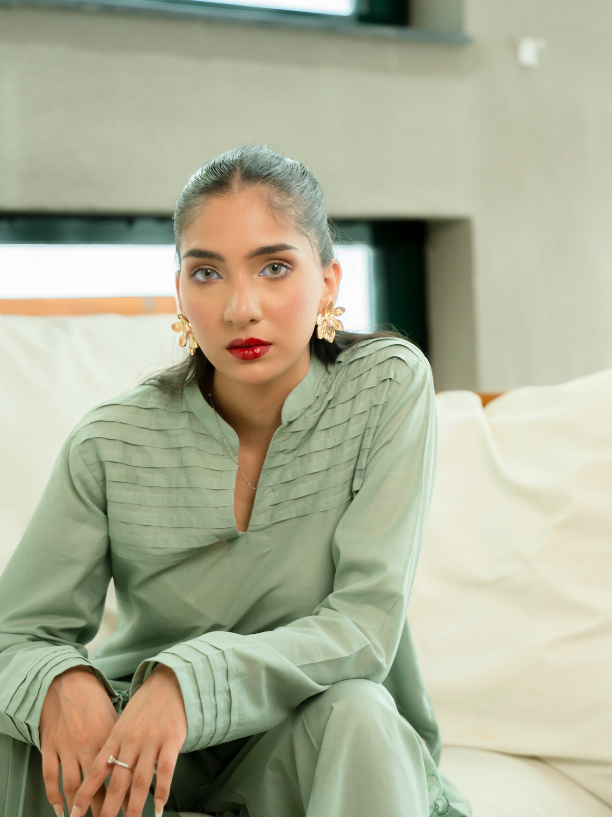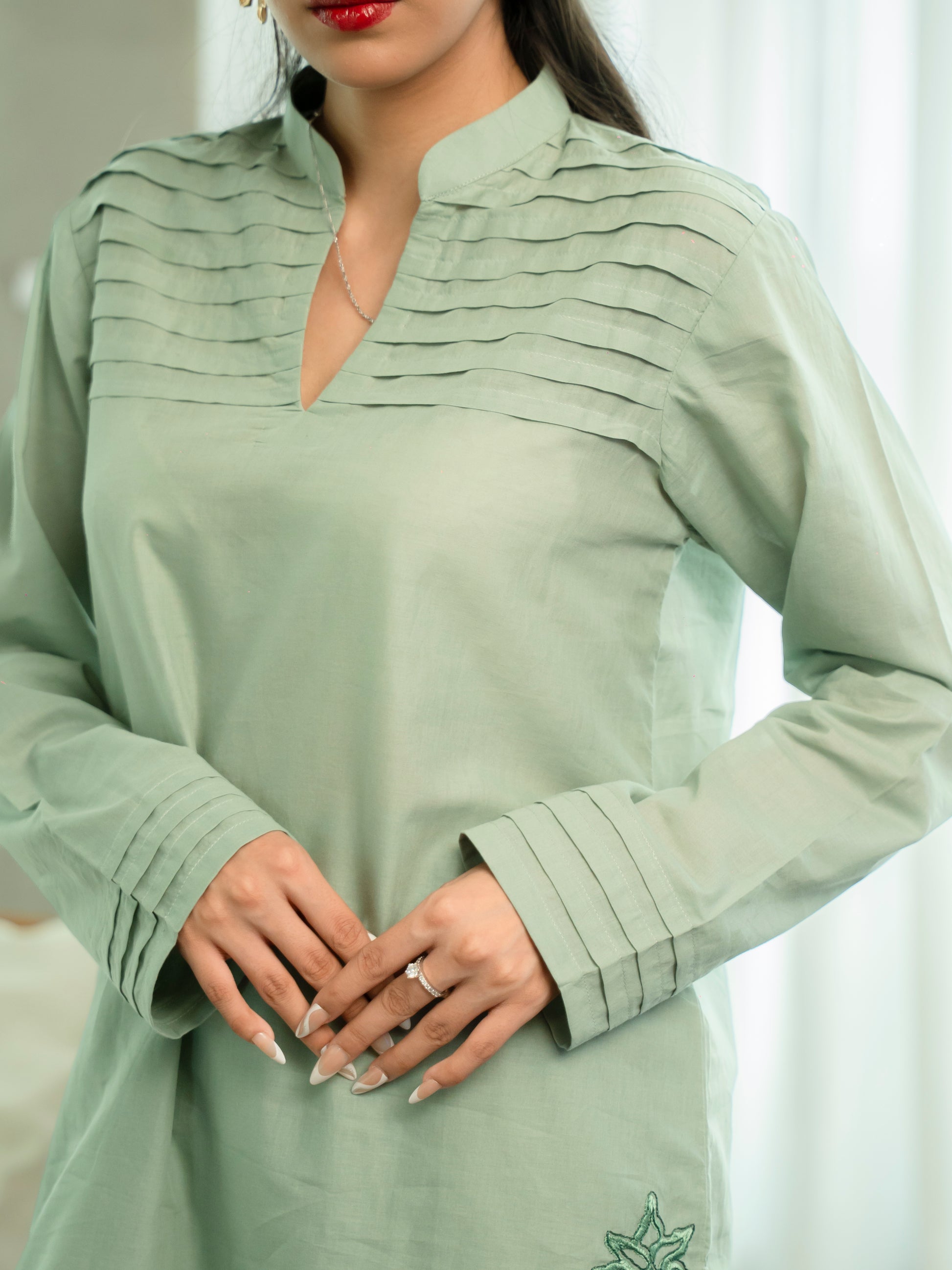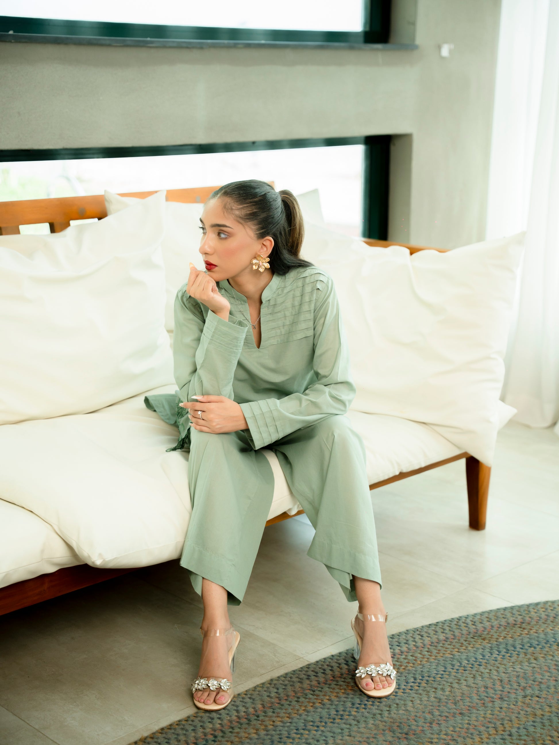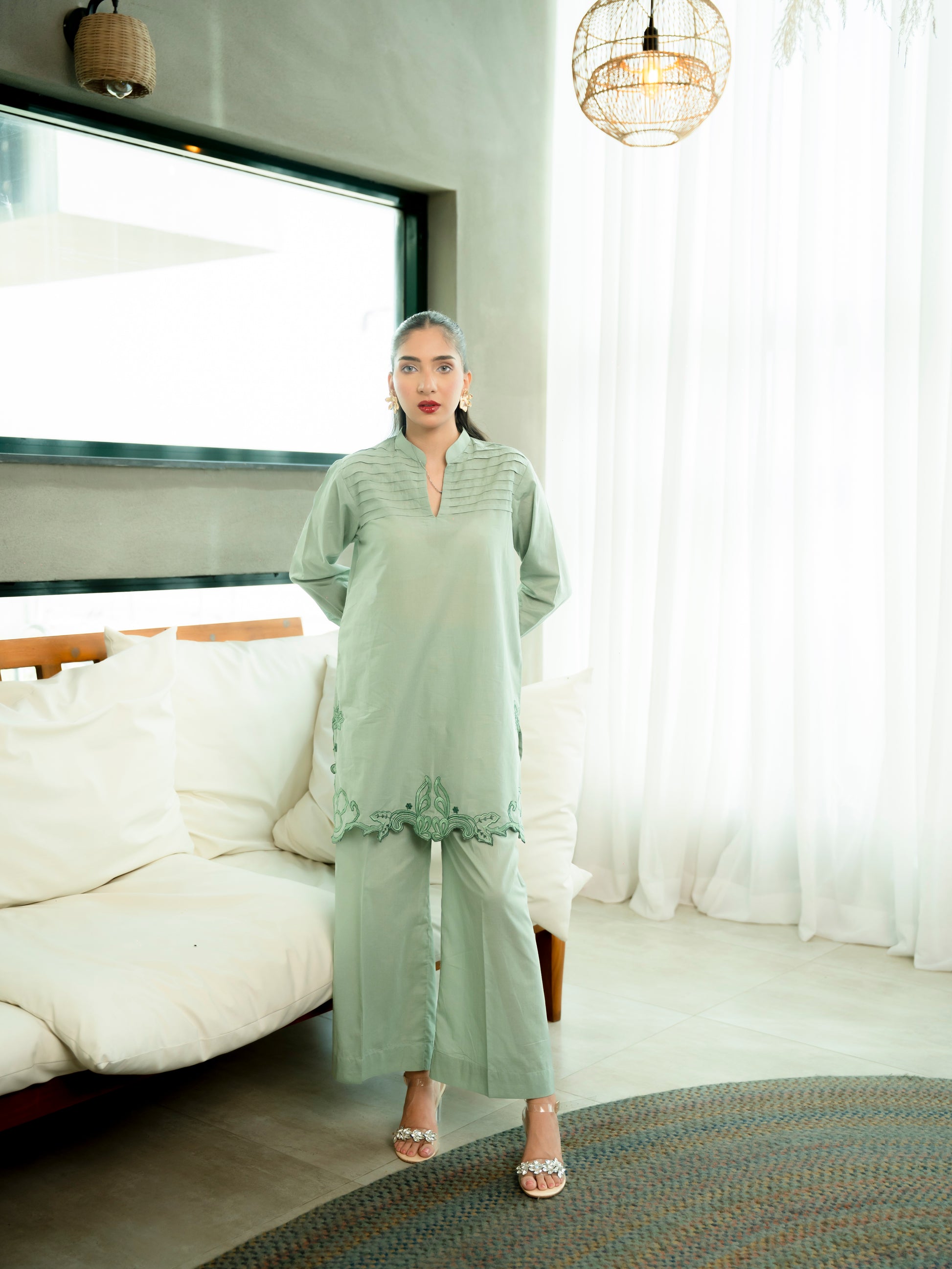Ayra is grace in green—a clean, cool silhouette enriched with tonal embroidery that whispers elegance. designed for days that call for lightness, simplicity, and unmatched style.