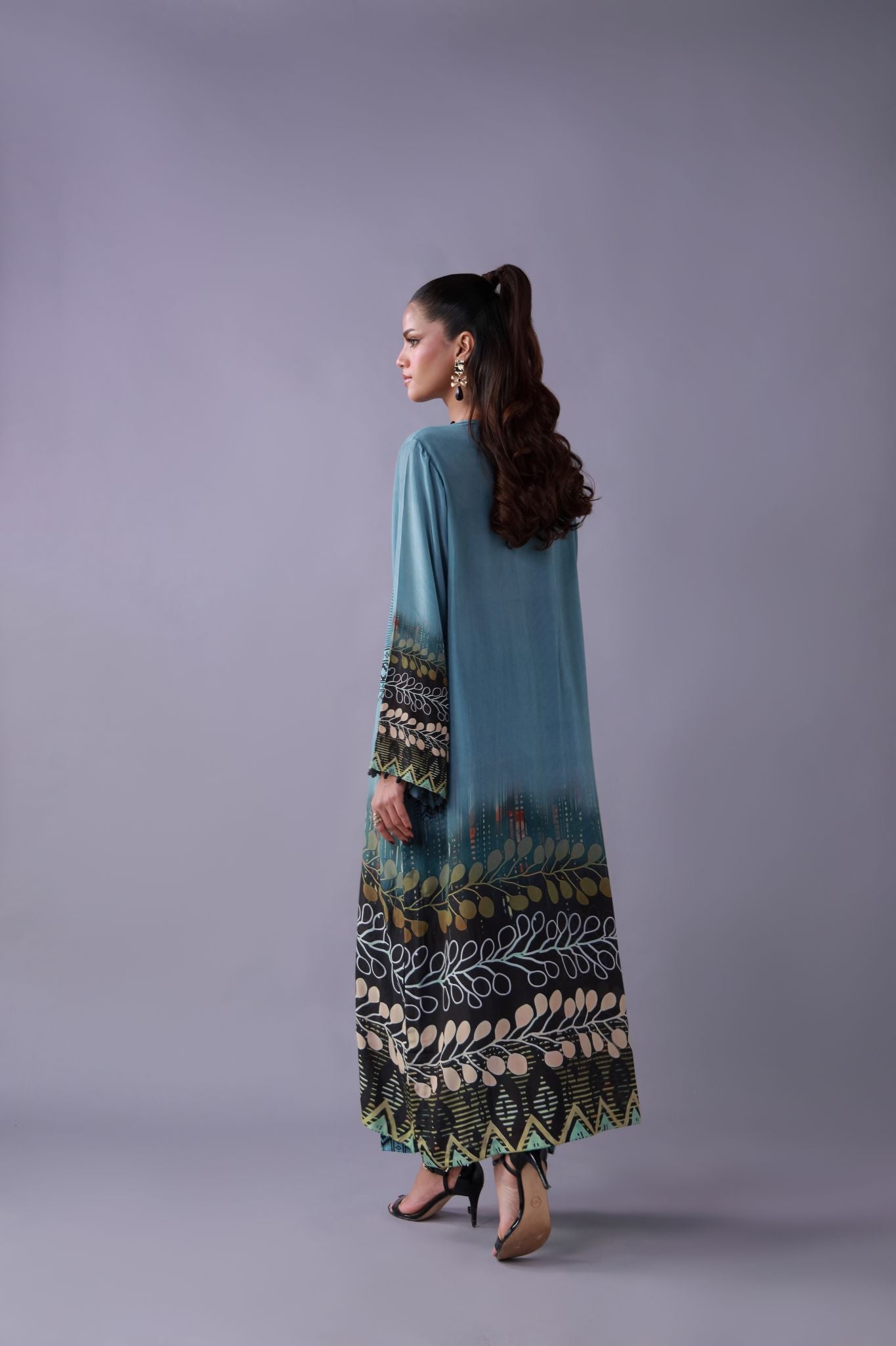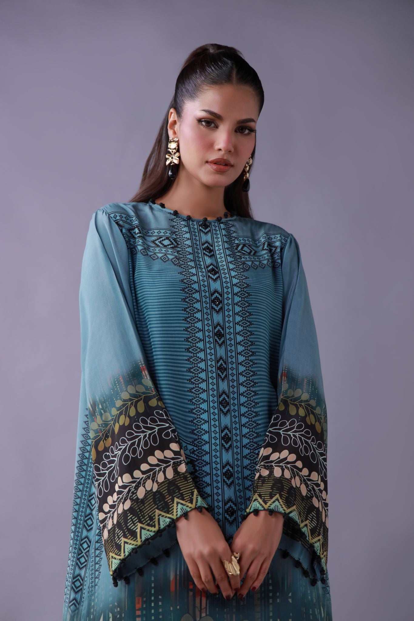 azura is a vision in teal tranquility, adorned with intricate tribal motifs and a leafwork border that echoes nature’s rhythm. the pure crape silk drape lends it movement and finesse — a serene standout for refined daywear.