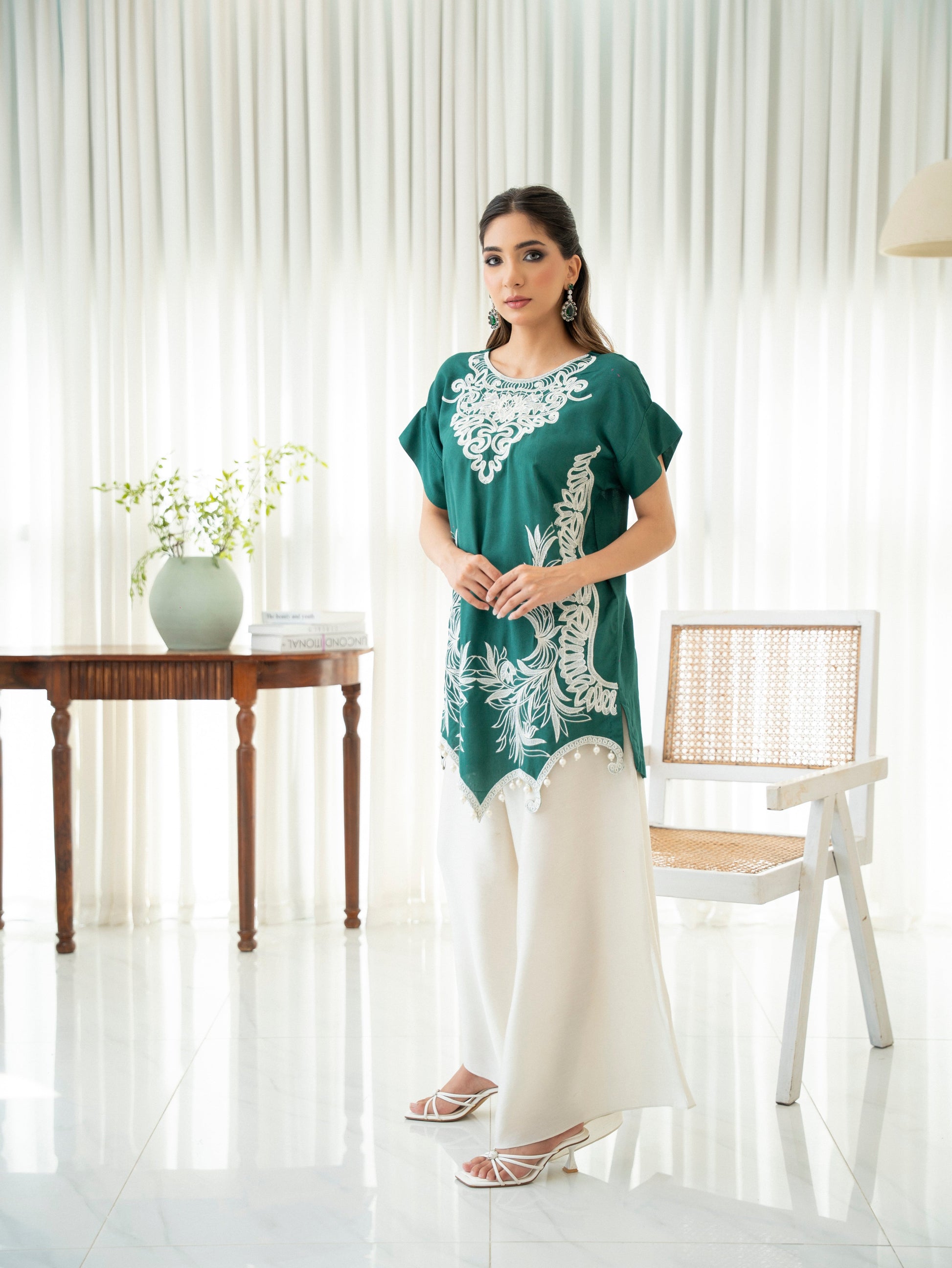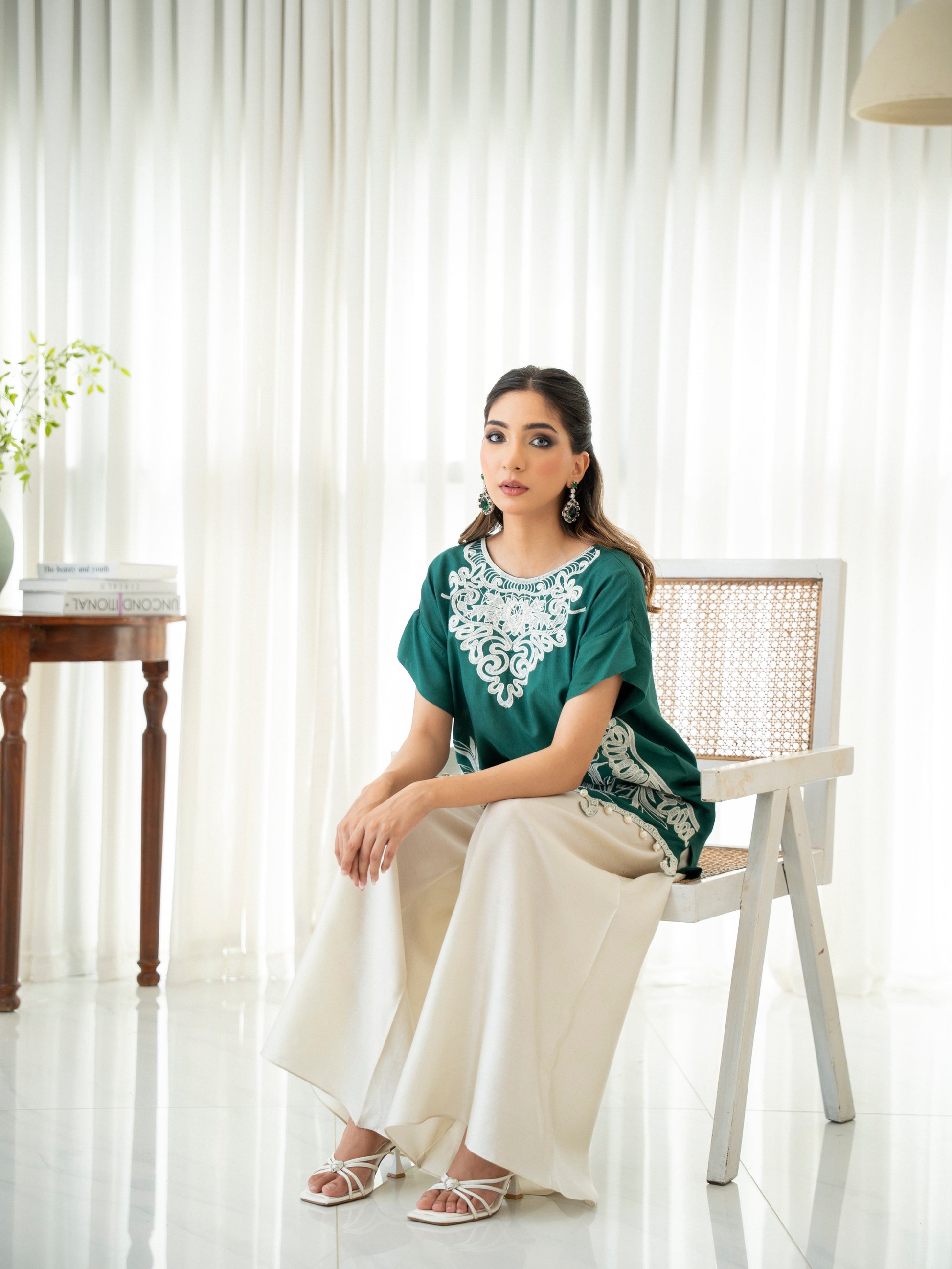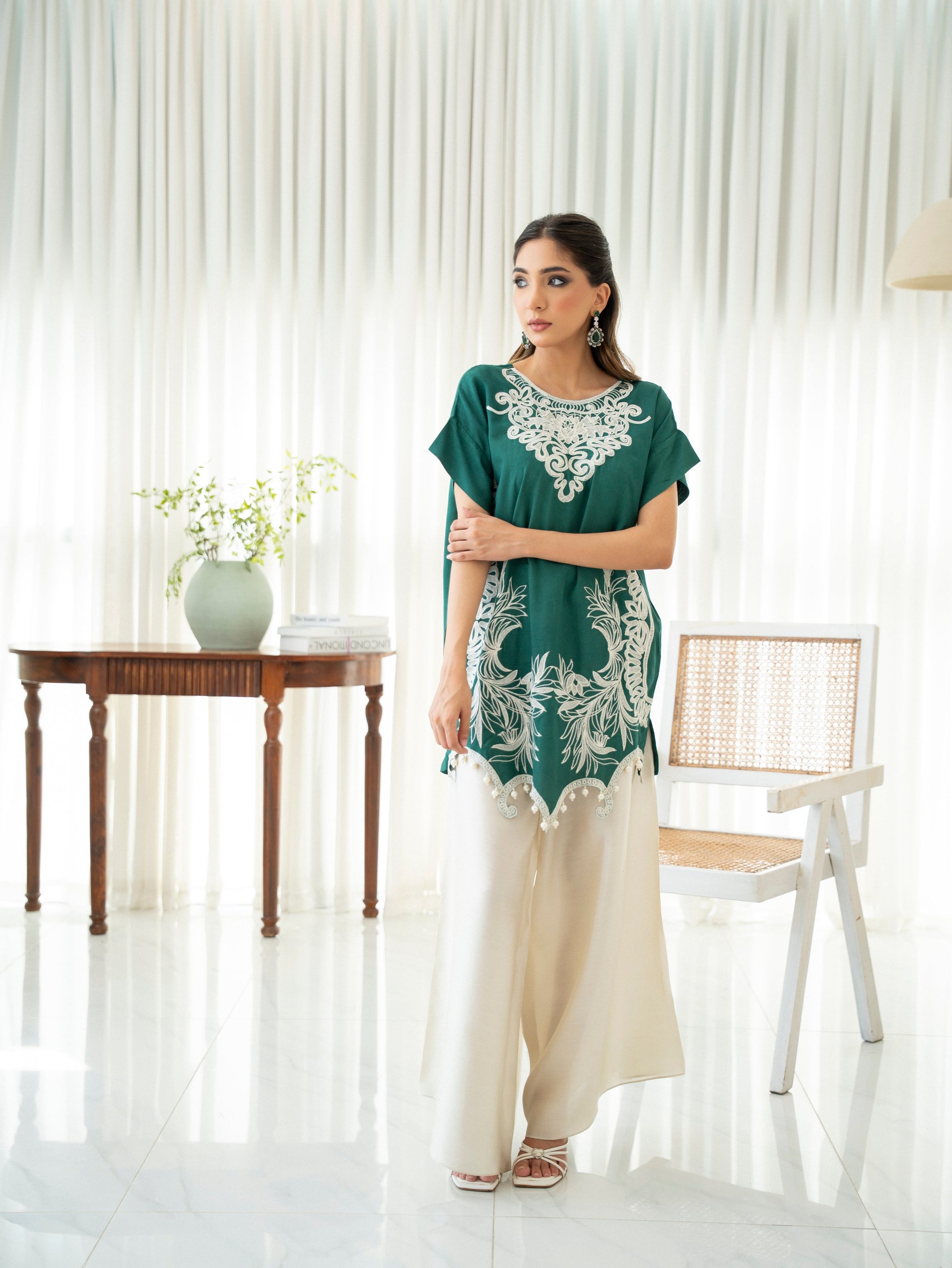 A chic 2-piece set in rich khaadi silk, Azure Crest features an elegant teal base adorned with intricate ivory embroidery. The scalloped hem with pearl accents adds a playful yet refined touch, perfectly paired with wide-leg ivory trousers for a fresh, modern silhouette.