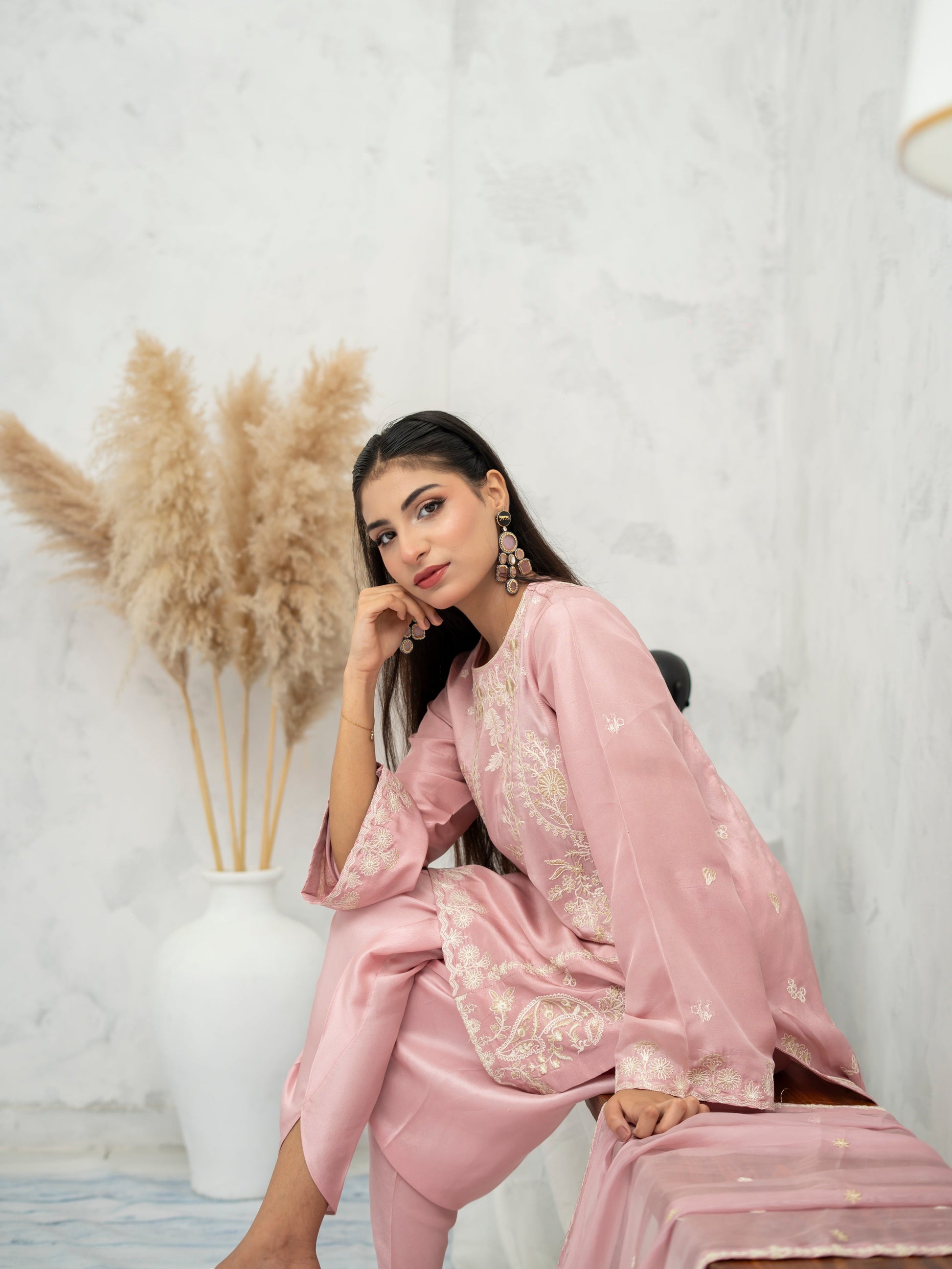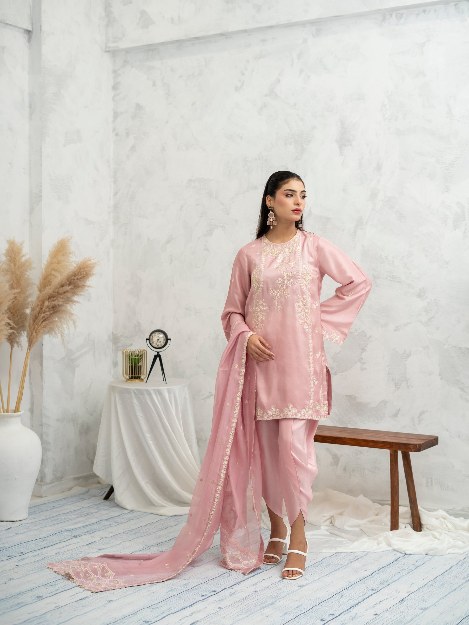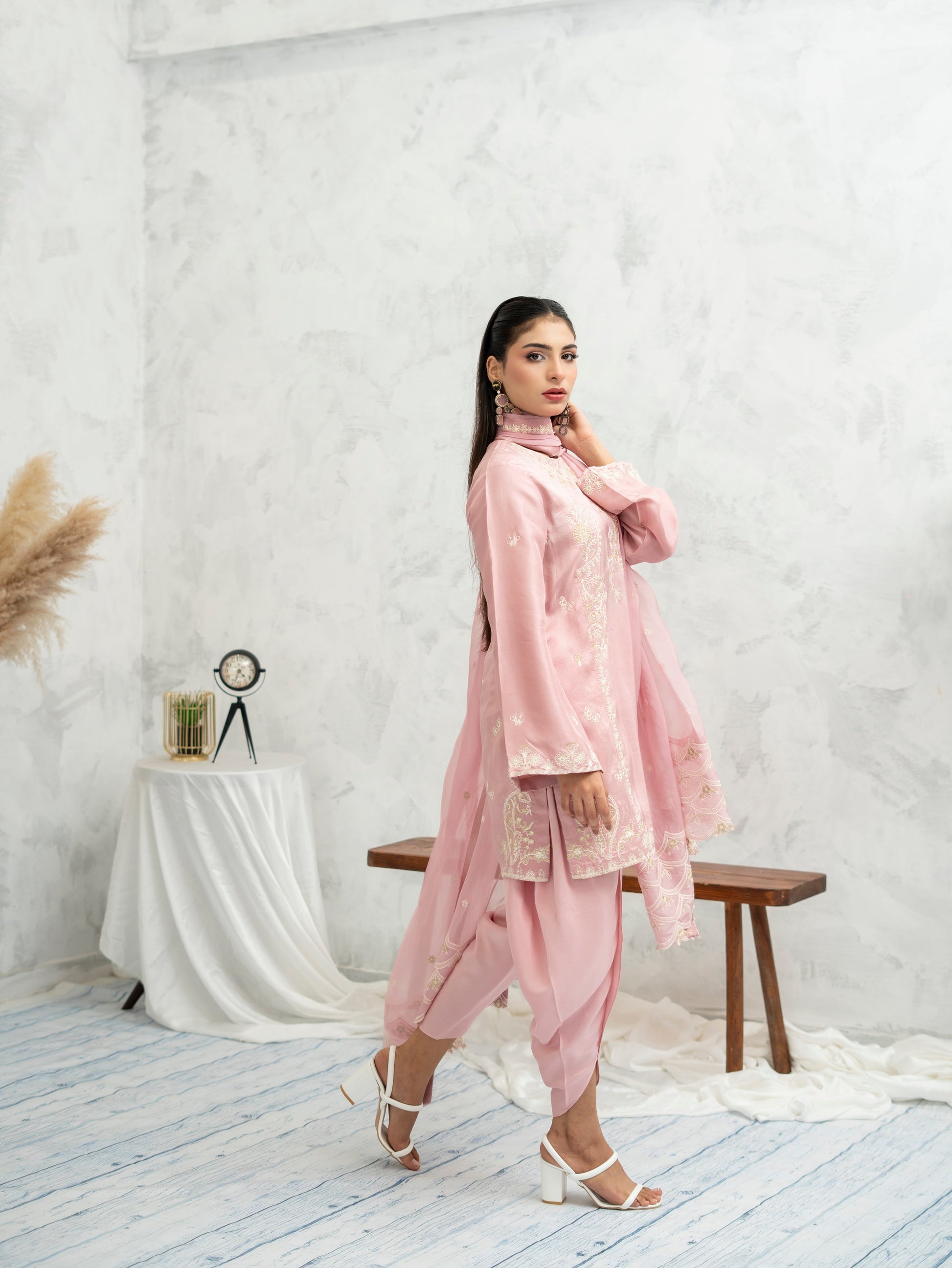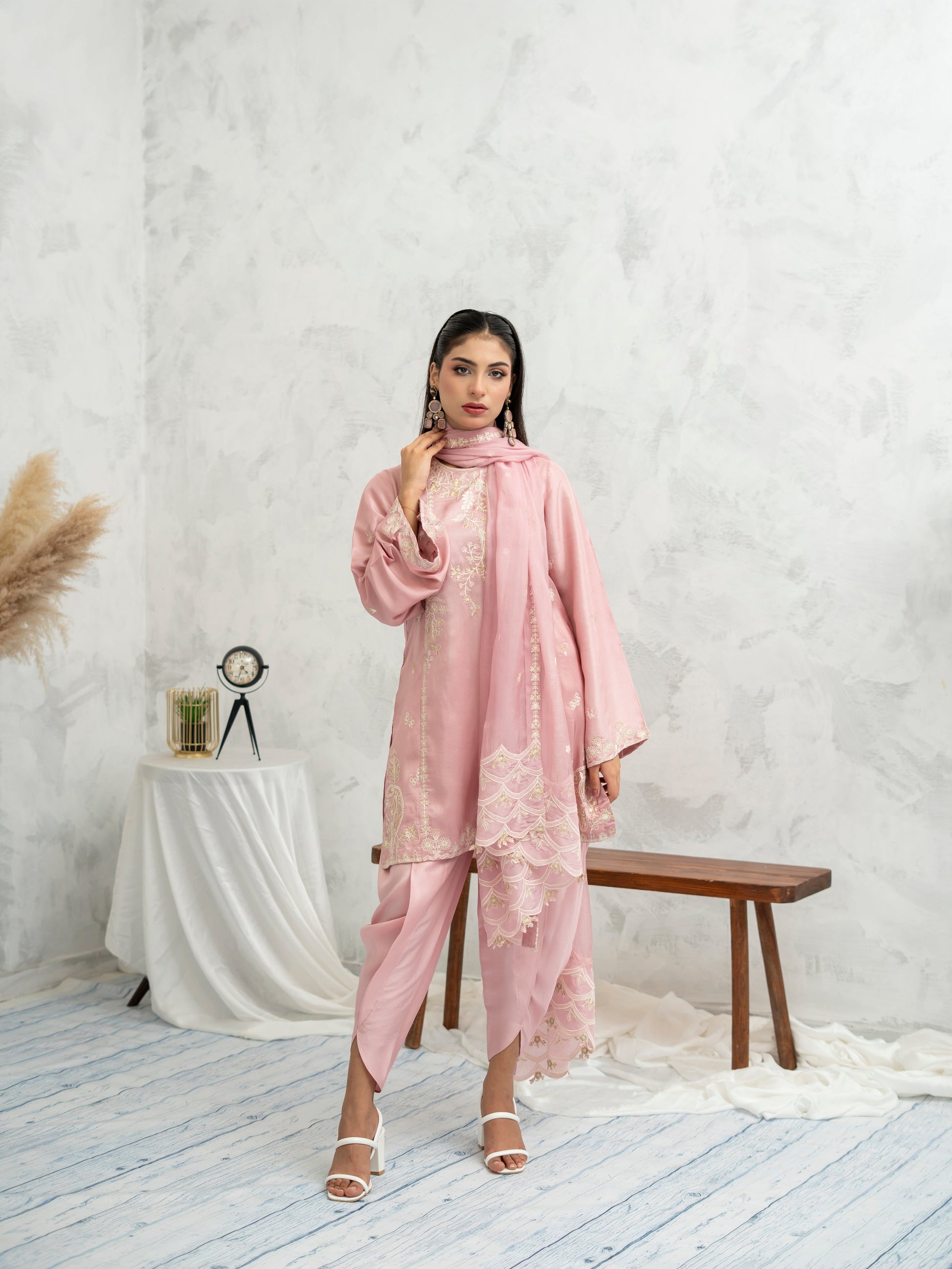 Soft as a whisper and delicately regal — Blush Reverie is an ode to timeless femininity. Crafted in a pastel pink hue, this ensemble is adorned with intricate ivory embroidery that dances across the shirt like lacework spun from dreams. The flowy silhouette paired with tapered trousers adds an element of refined charm, while the matching dupatta brings a light, romantic finish. Whether it’s a daytime celebration or a festive evening, Blush Reverie wraps you in grace, elegance, and effortless sophistication.