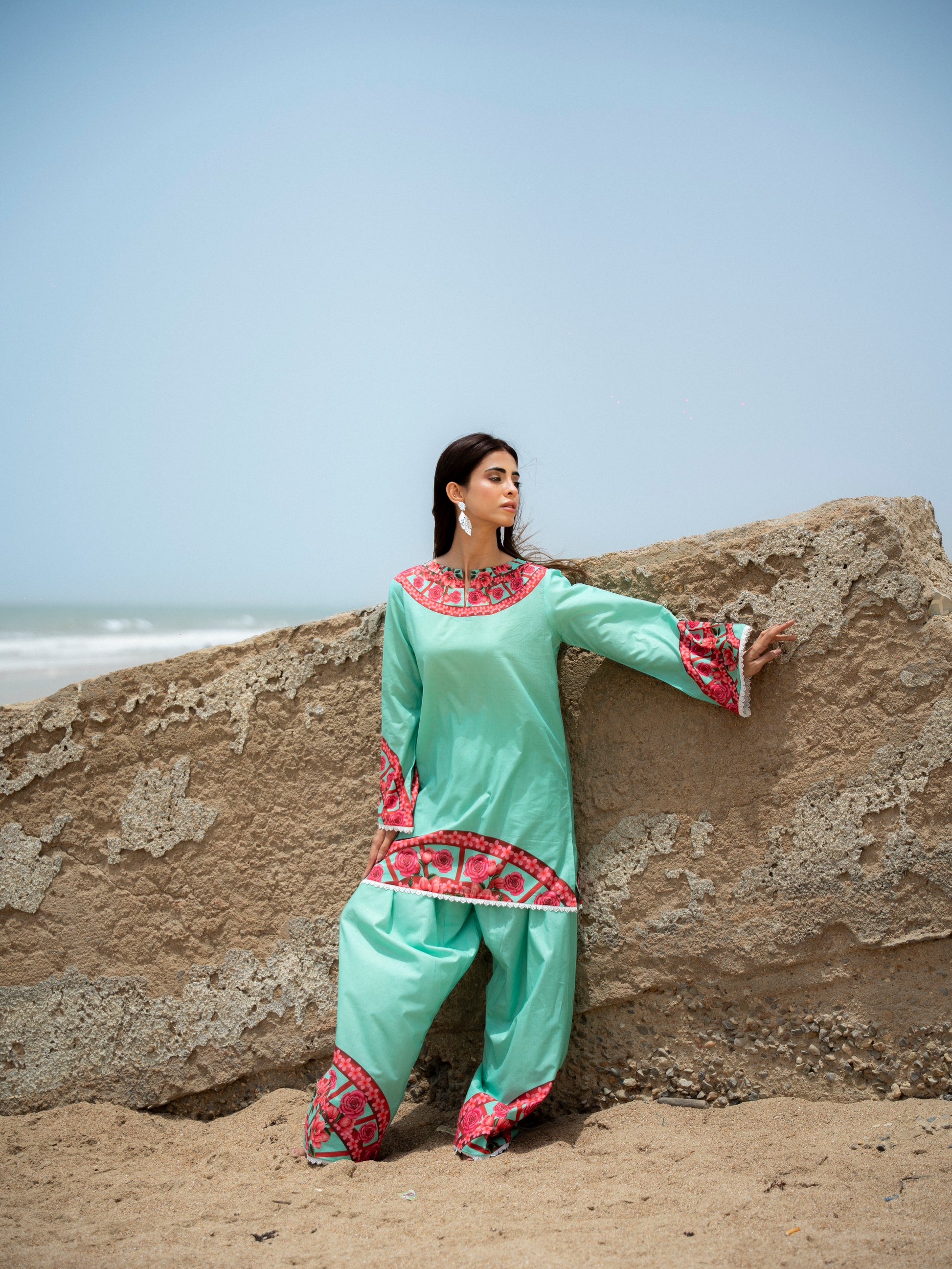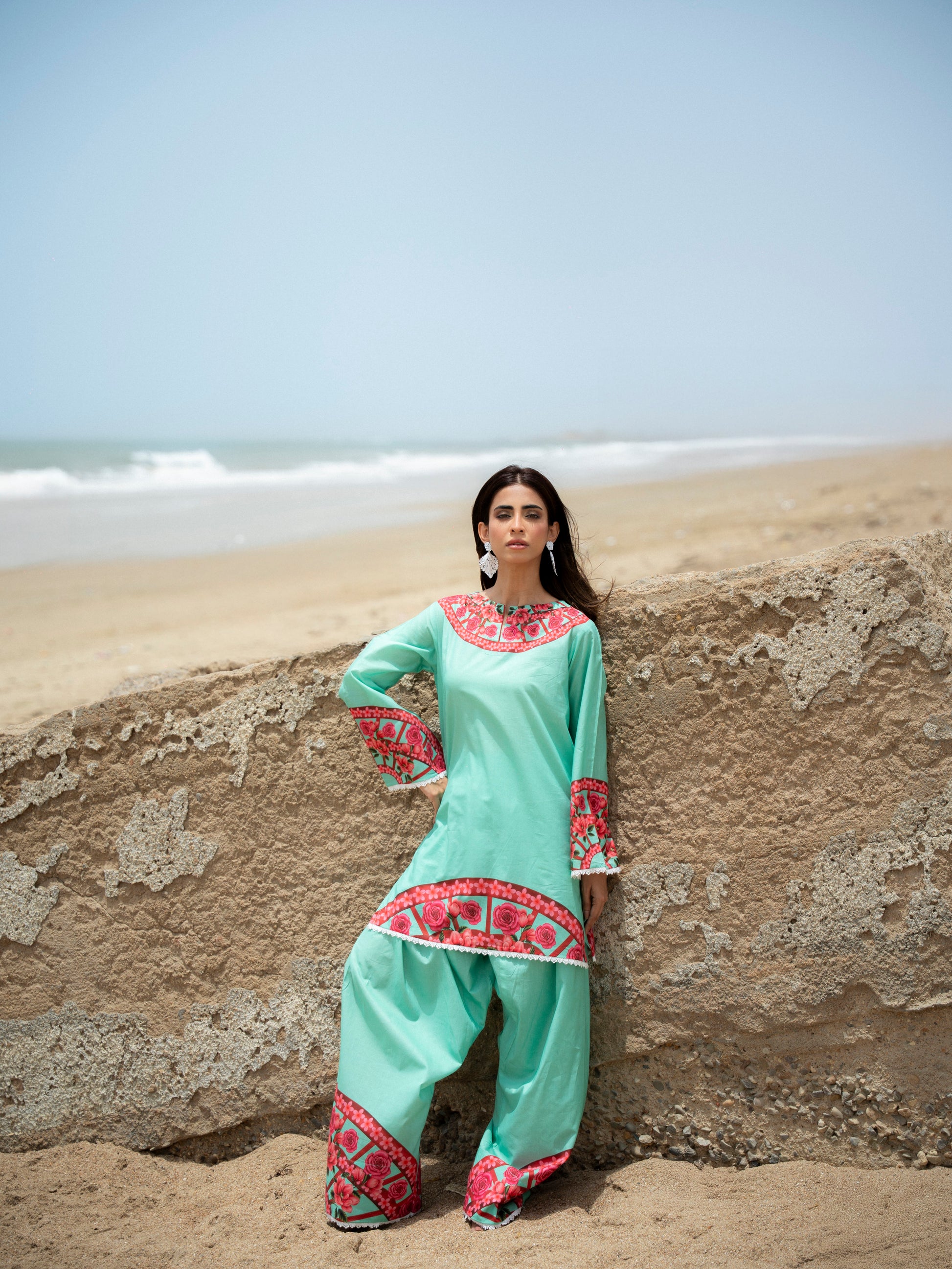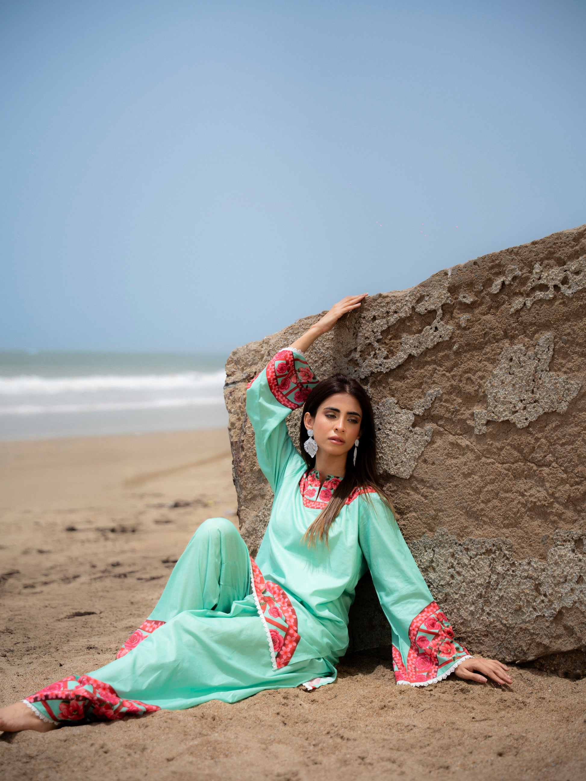 fresh like a sea breeze, ‘blushbay’ brings together soft mint tones with vibrant pink florals for a look that’s playful yet poised. crafted in airy lawn, it’s a summer essential that radiates joy and grace.