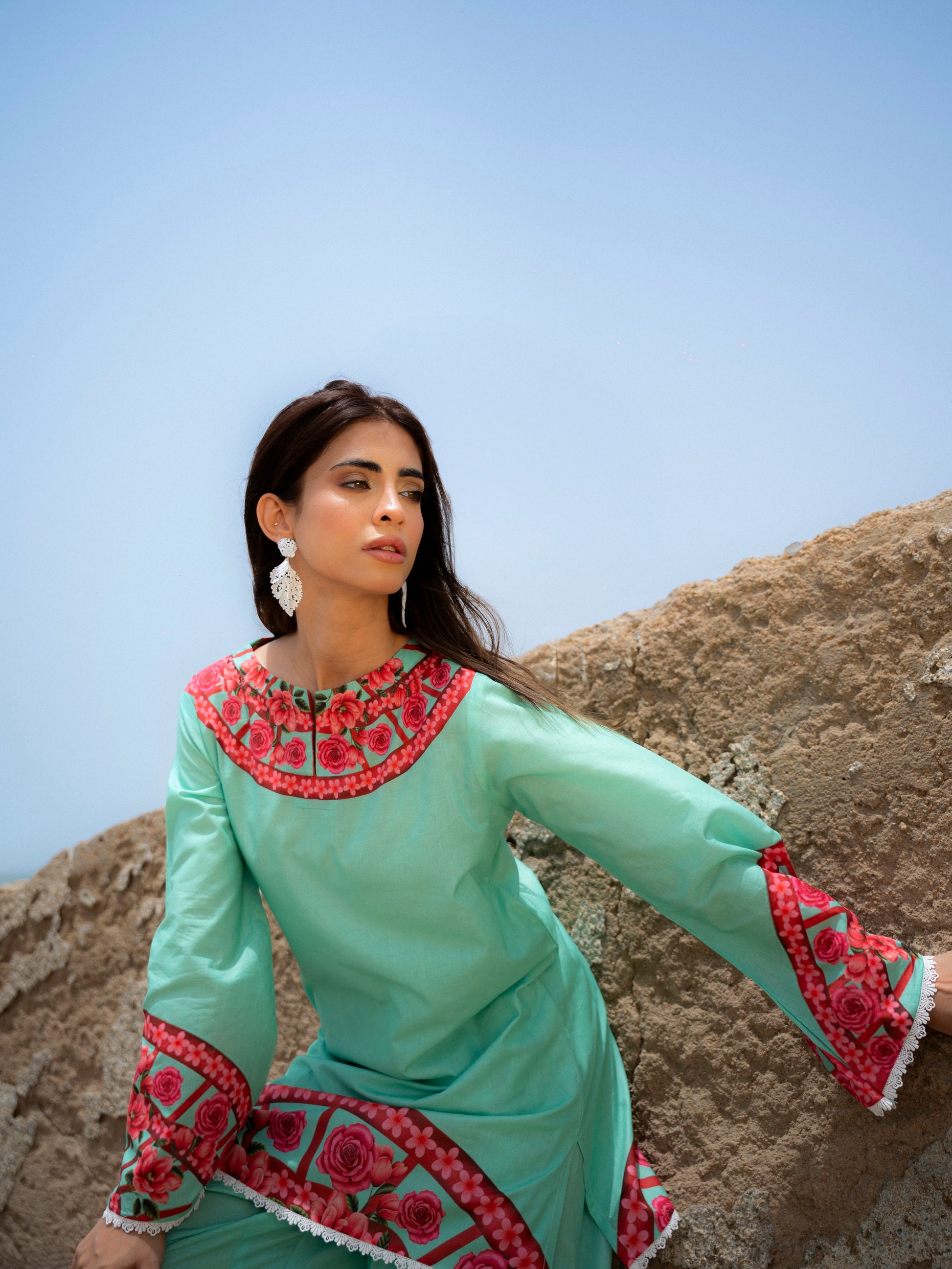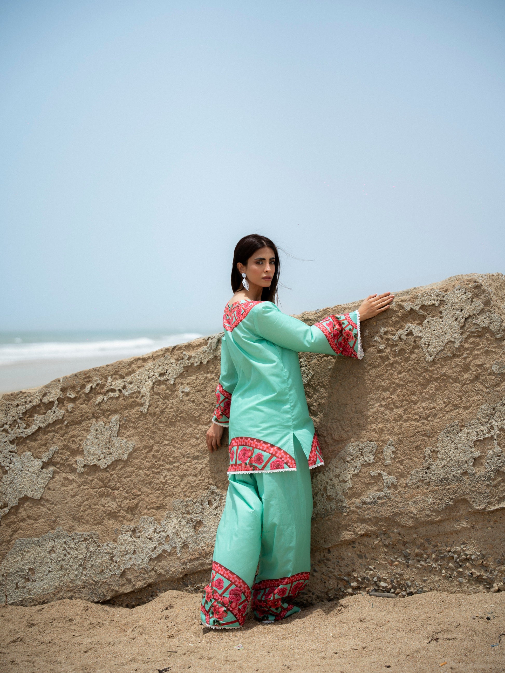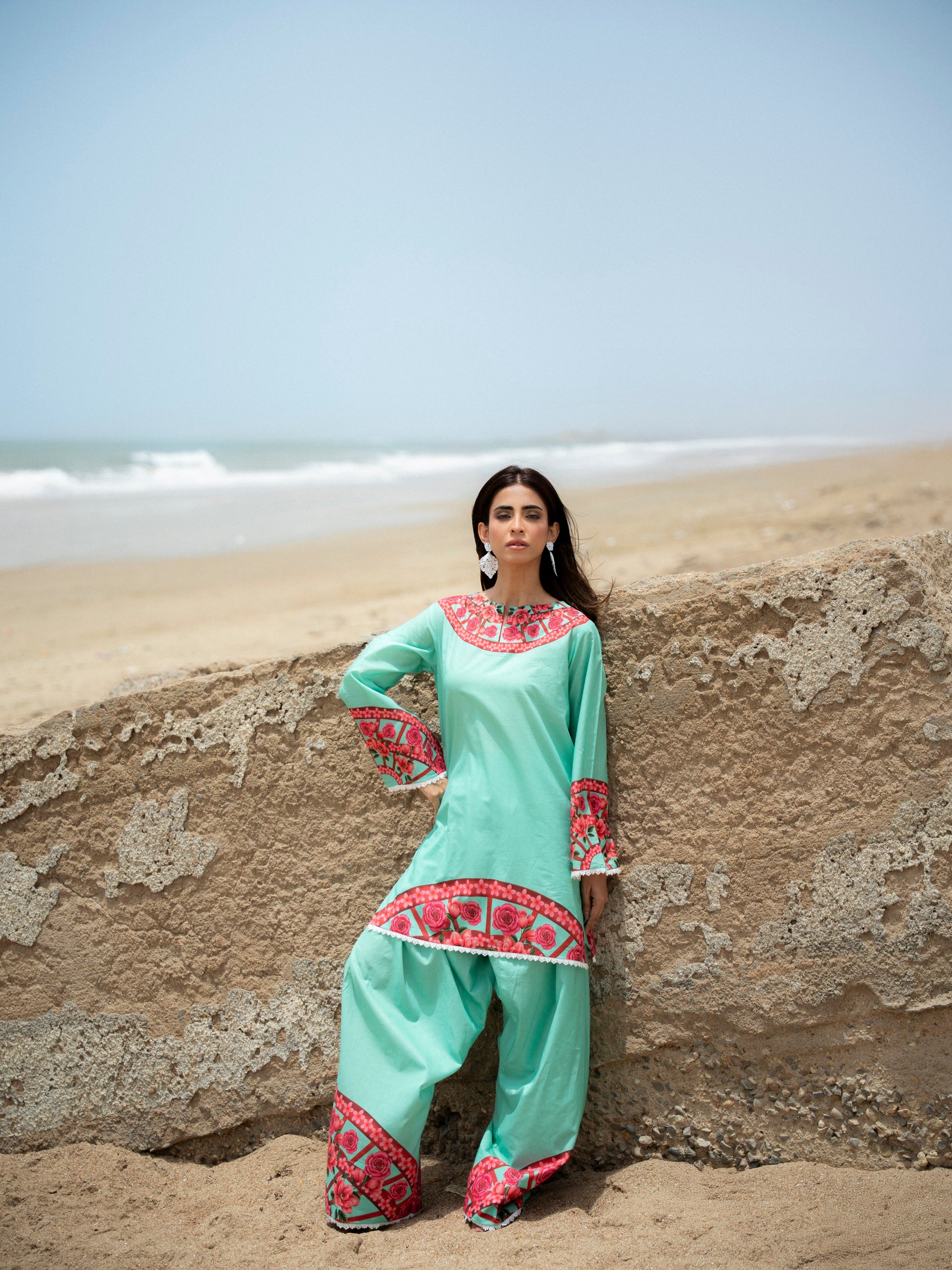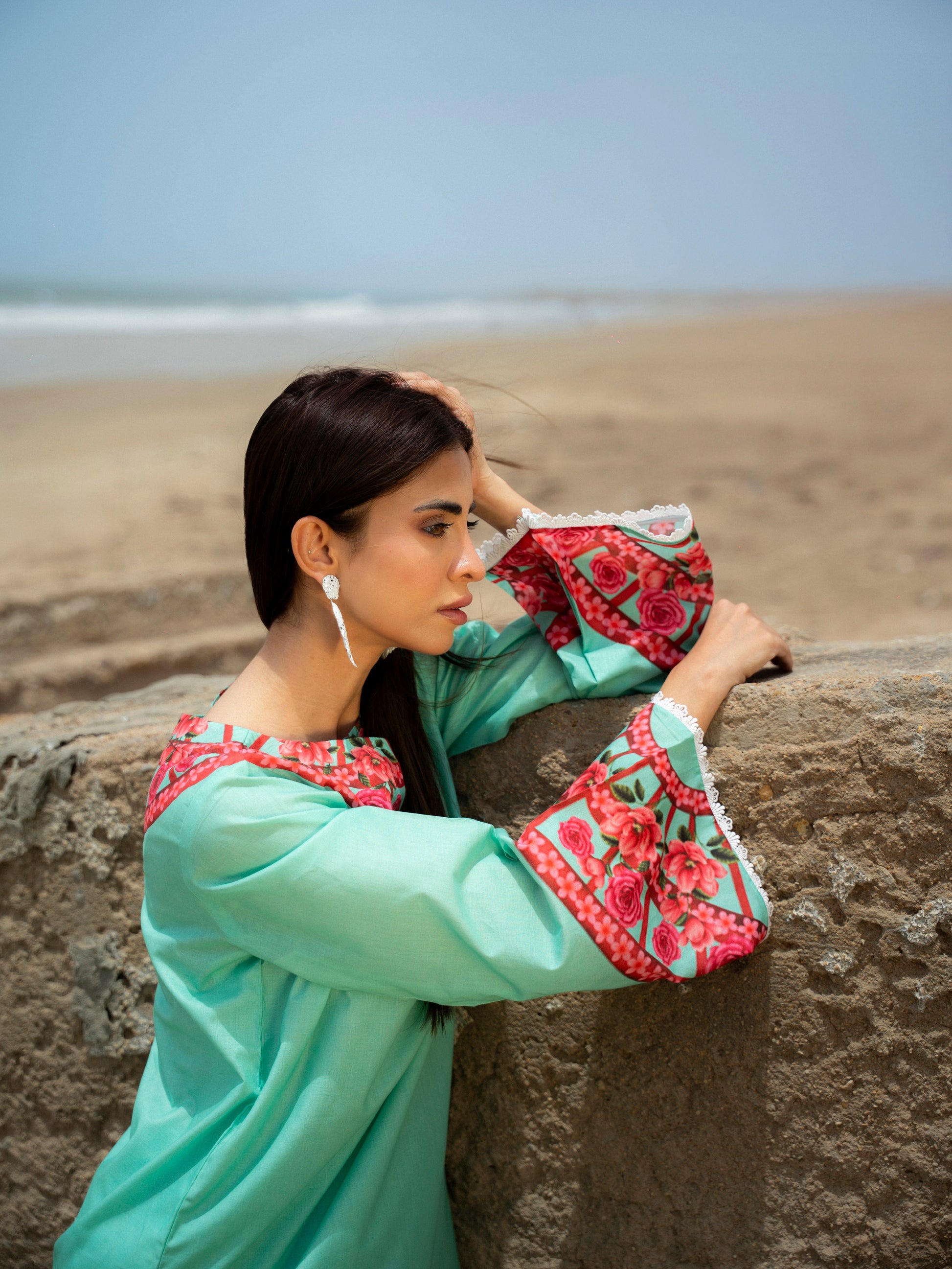 fresh like a sea breeze, ‘blushbay’ brings together soft mint tones with vibrant pink florals for a look that’s playful yet poised. crafted in airy lawn, it’s a summer essential that radiates joy and grace.