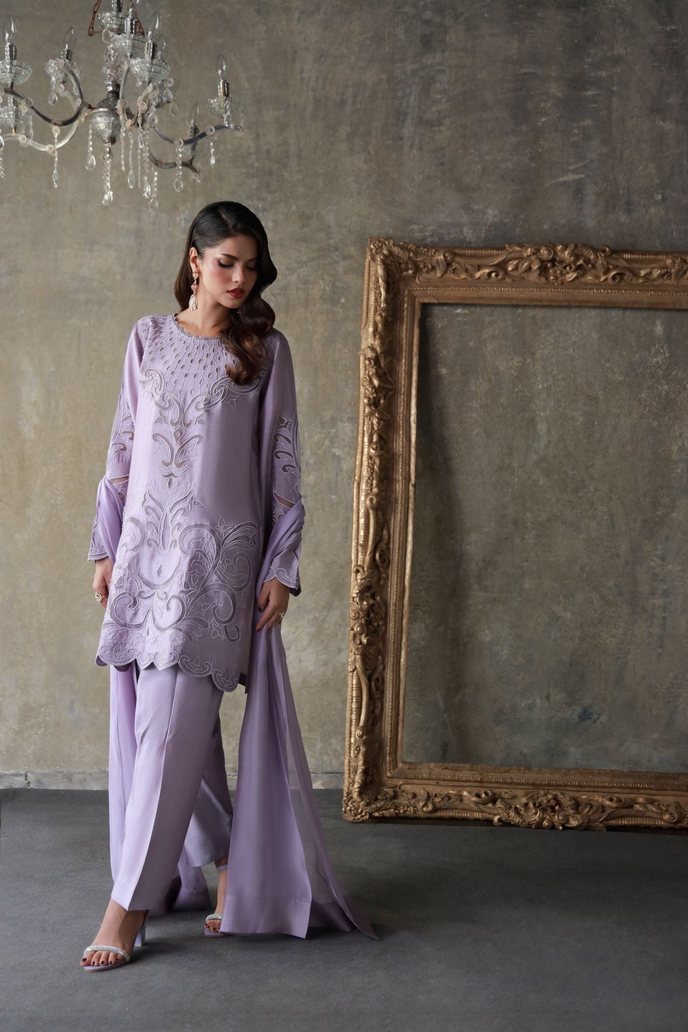 A luminous lilac ensemble crafted in sumptuous premium silk, gracefully adorned with delicate embroidery that glistens with every movement. Paired with a weightless organza dupatta, this 3-piece set radiates sophistication and fluid elegance. Where dreamy fluidity meets refined glamour — perfect for soirées, festivities, or moments meant to linger