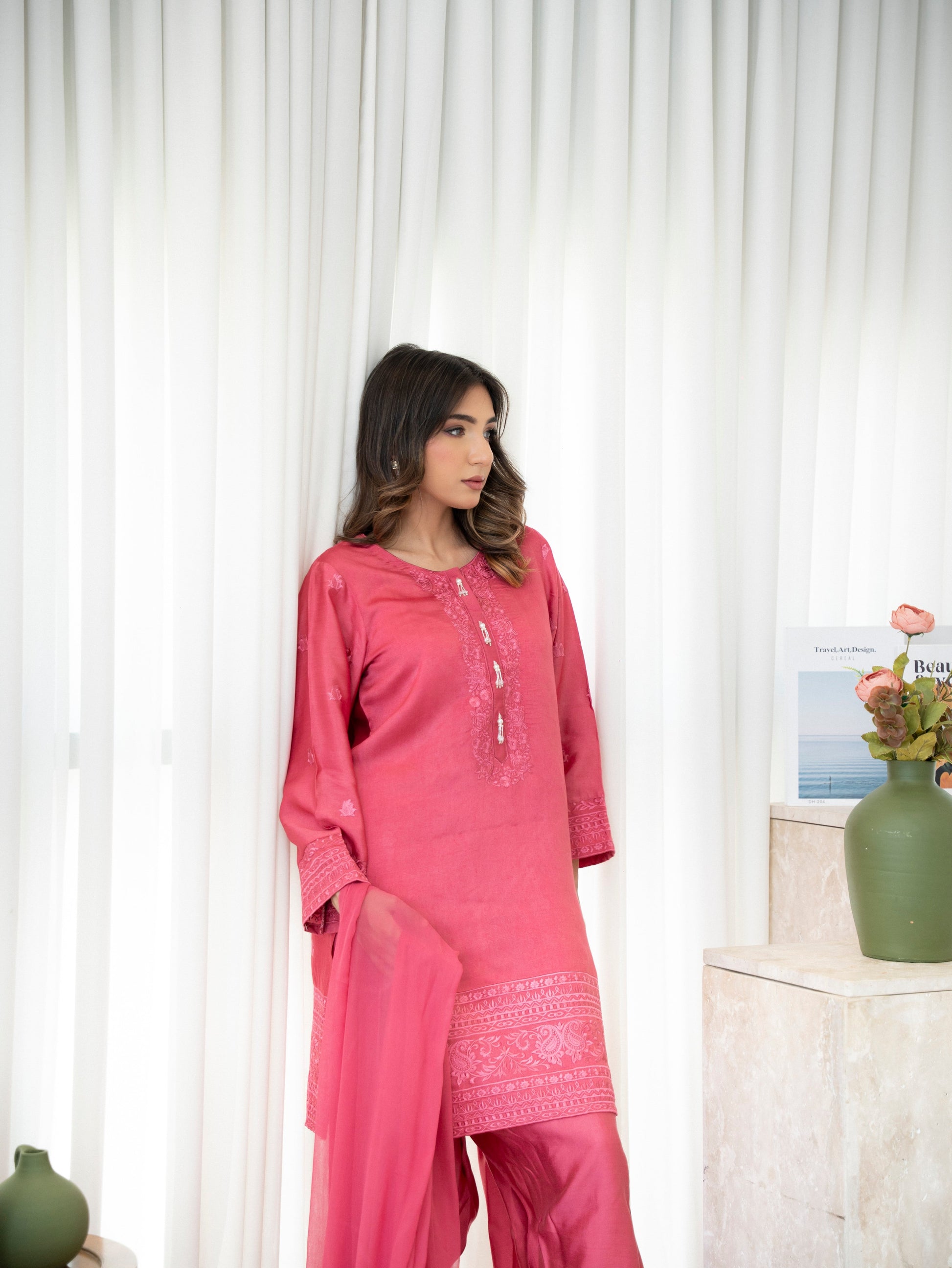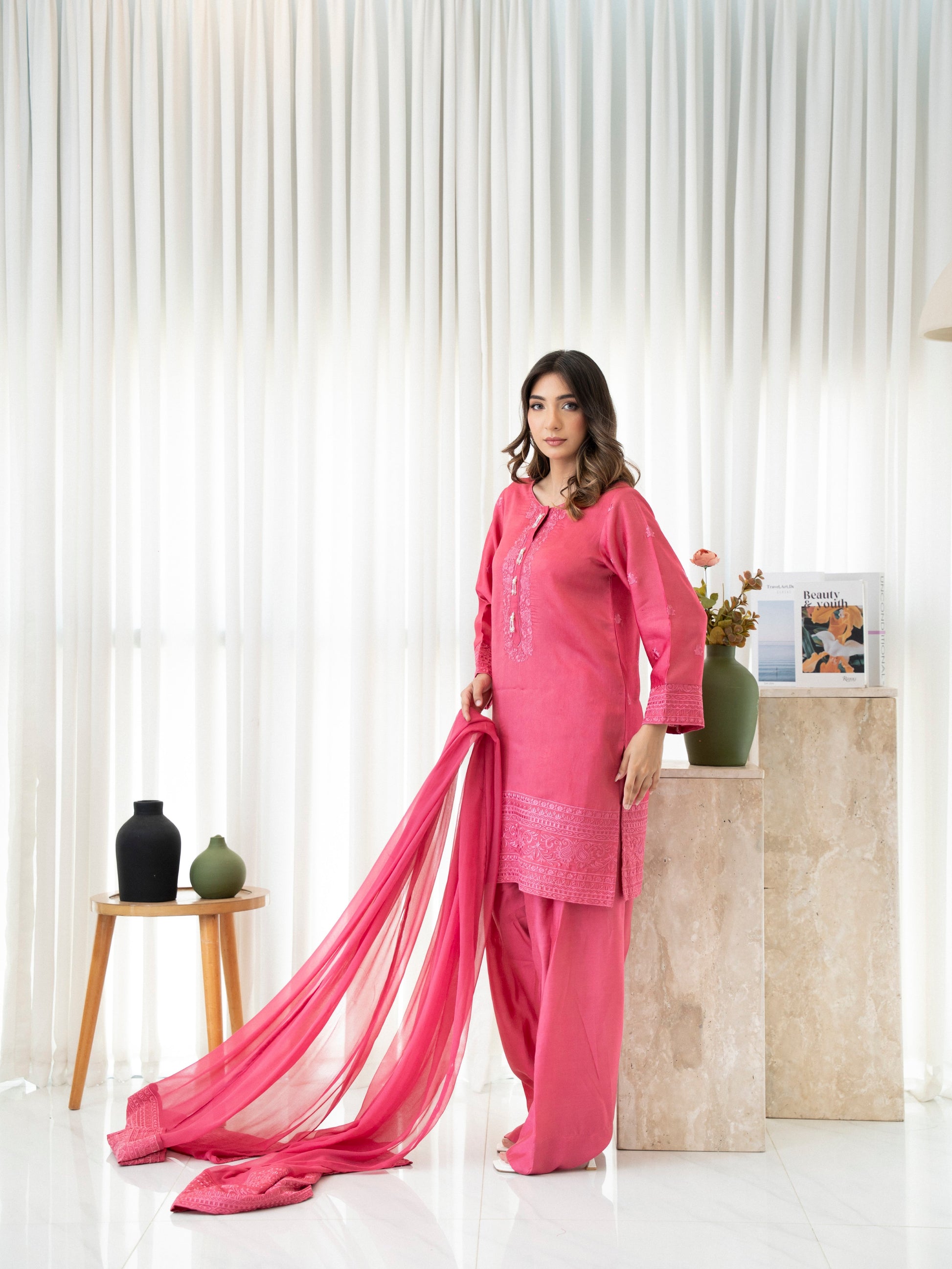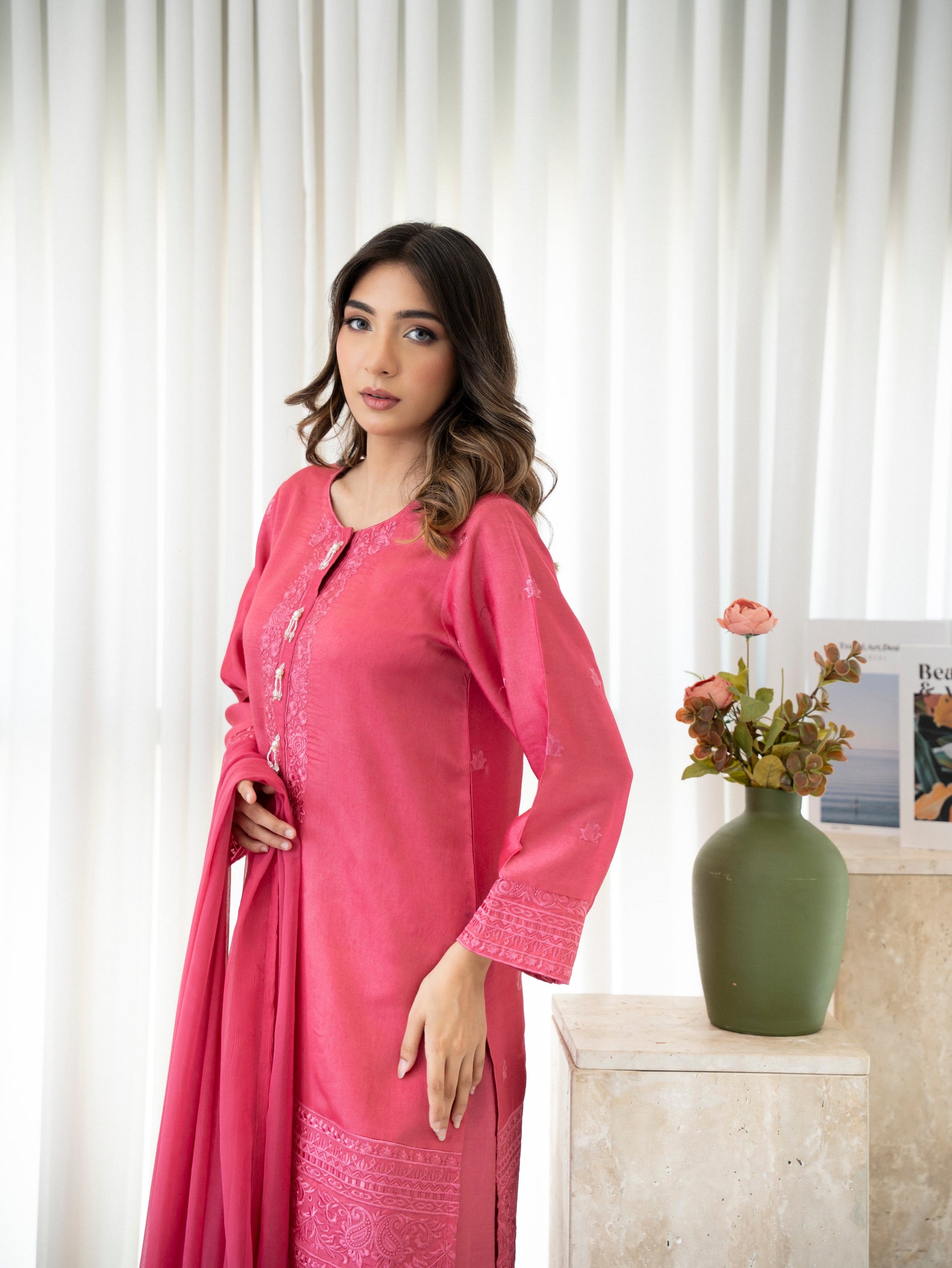 Clay Bloom is a vibrant statement in soft luxury—crafted from premium silk in a luscious pink hue and paired with a flowing pure chiffon dupatta. The delicate embroidery adds a touch of femininity and finesse, making this 3-piece ensemble ideal for summer soirées, festive brunches, or daytime celebrations. A refreshing blend of charm and grace in every thread.