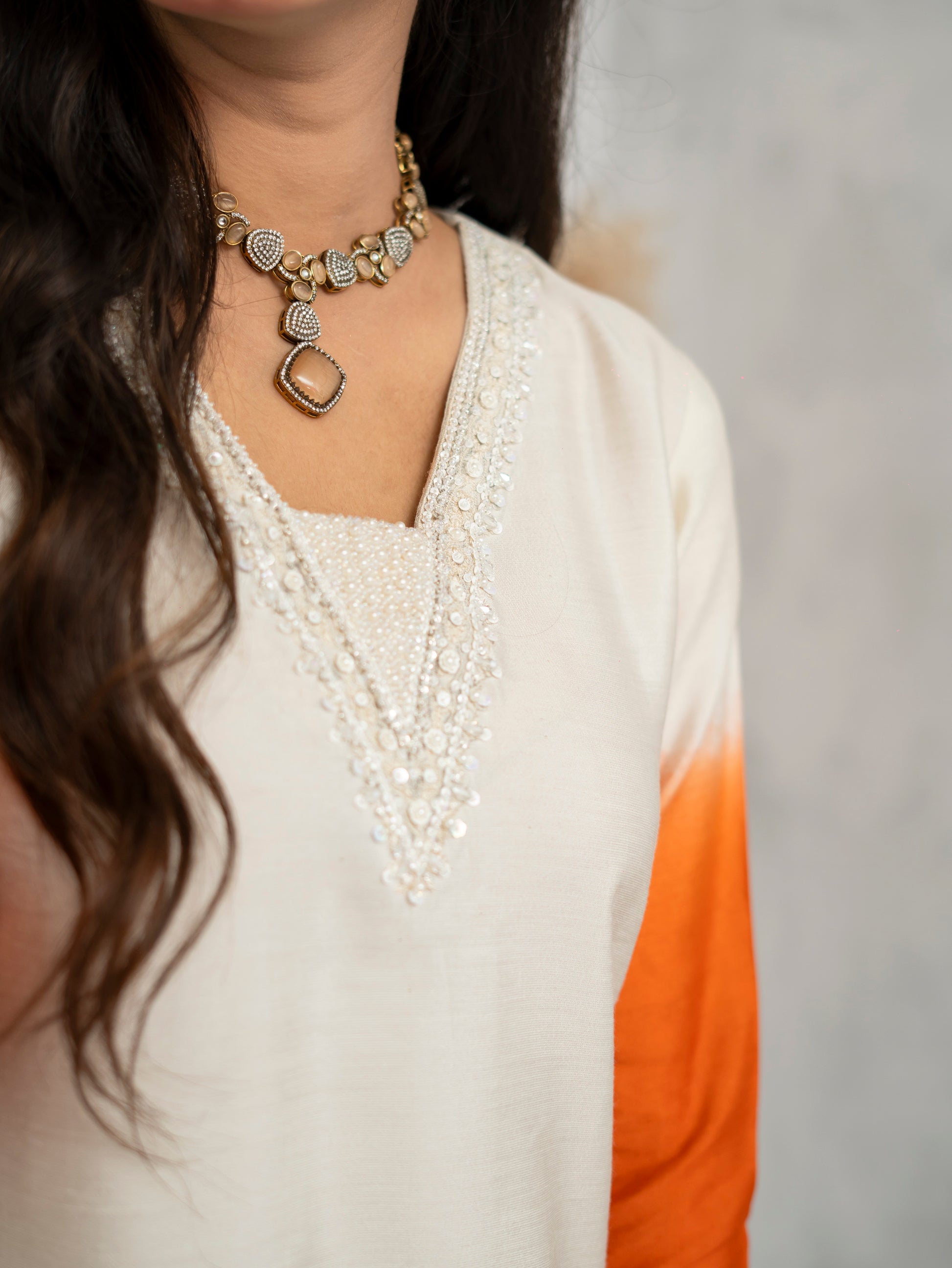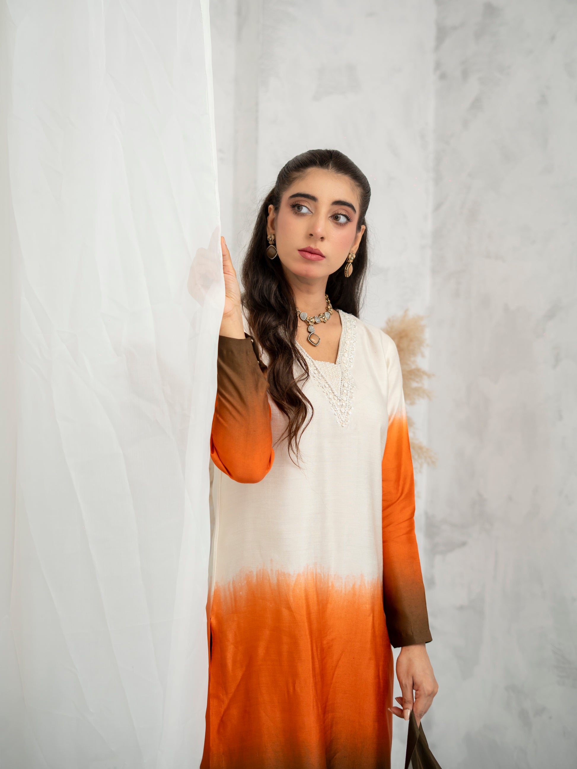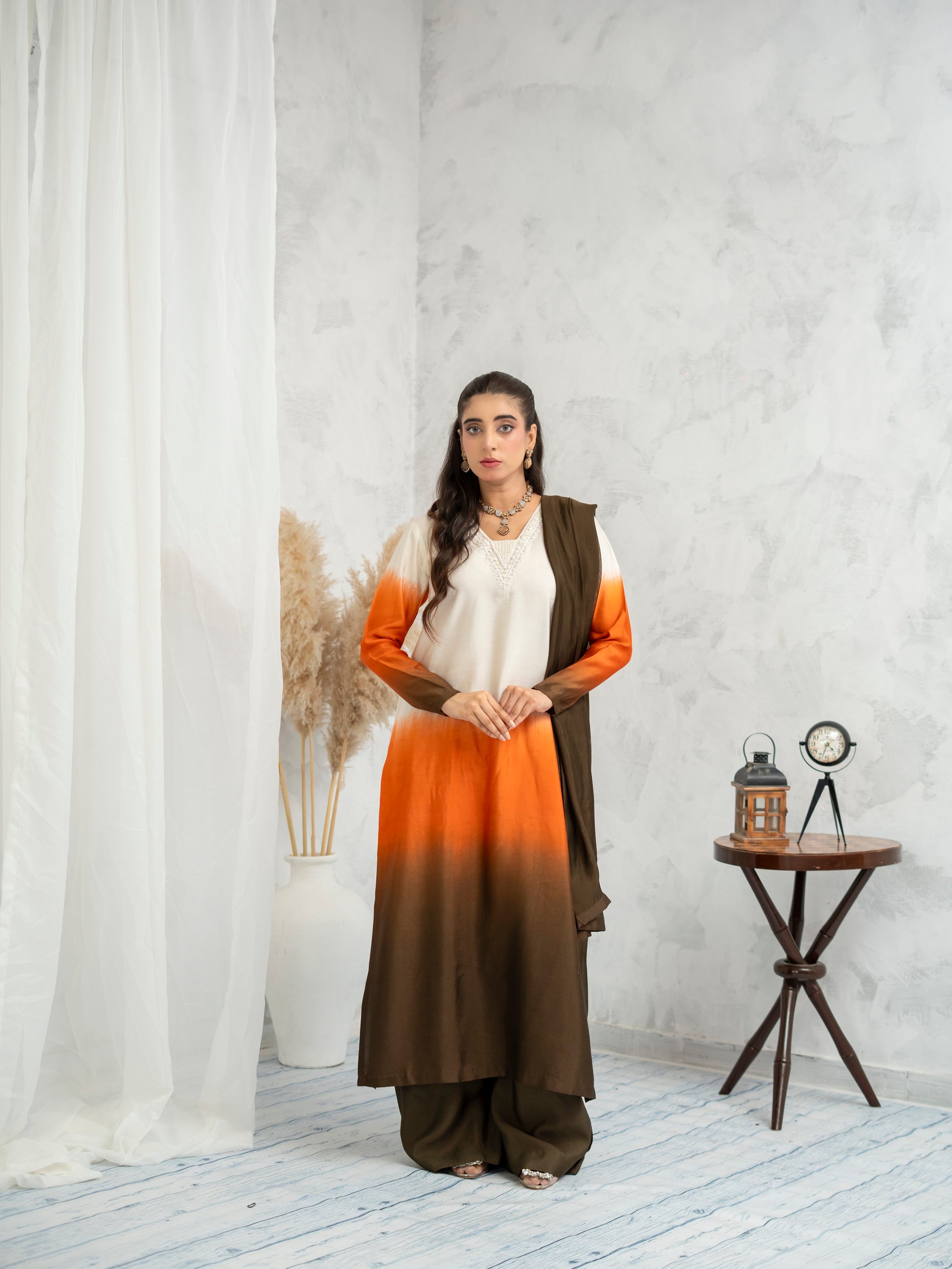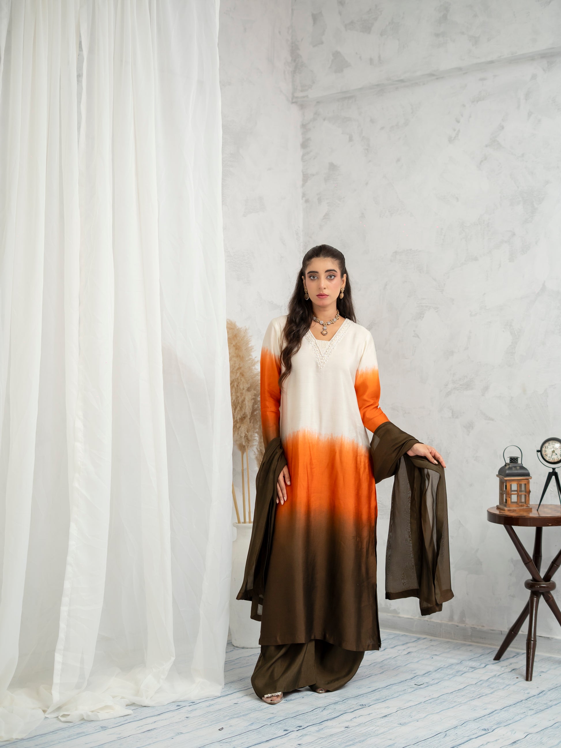 Unveil bold elegance with Ember Dusk — a captivating gradient ensemble inspired by the fiery tones of twilight. The silhouette flows from a soft ivory bodice into rich hues of burnt orange and deep cocoa, capturing the warmth of a desert sunset. Crafted in a luxurious fabric with a gentle sheen, the design features a subtly adorned neckline and coordinating wide-leg trousers. A matching dupatta adds fluidity and depth, perfect for both day celebrations and evening charm. Ember Dusk is a radiant statement — fierce, grounded, and unforgettable.