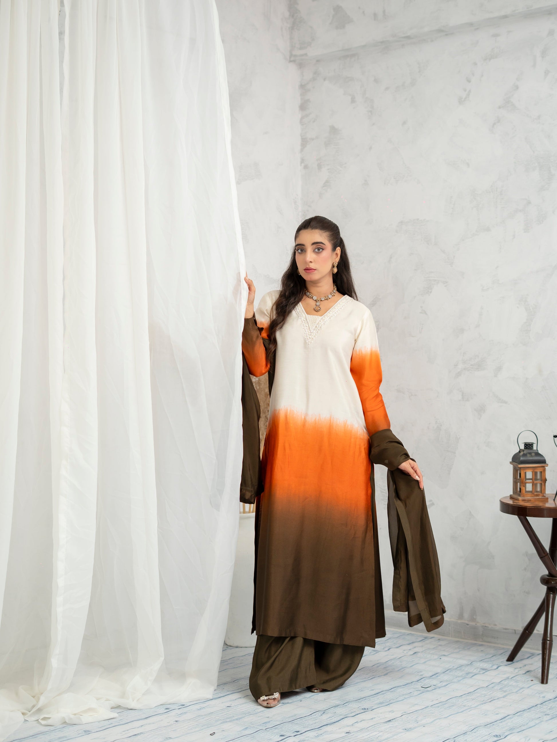 Unveil bold elegance with Ember Dusk — a captivating gradient ensemble inspired by the fiery tones of twilight. The silhouette flows from a soft ivory bodice into rich hues of burnt orange and deep cocoa, capturing the warmth of a desert sunset. Crafted in a luxurious fabric with a gentle sheen, the design features a subtly adorned neckline and coordinating wide-leg trousers. A matching dupatta adds fluidity and depth, perfect for both day celebrations and evening charm. Ember Dusk is a radiant statement — fierce, grounded, and unforgettable.
