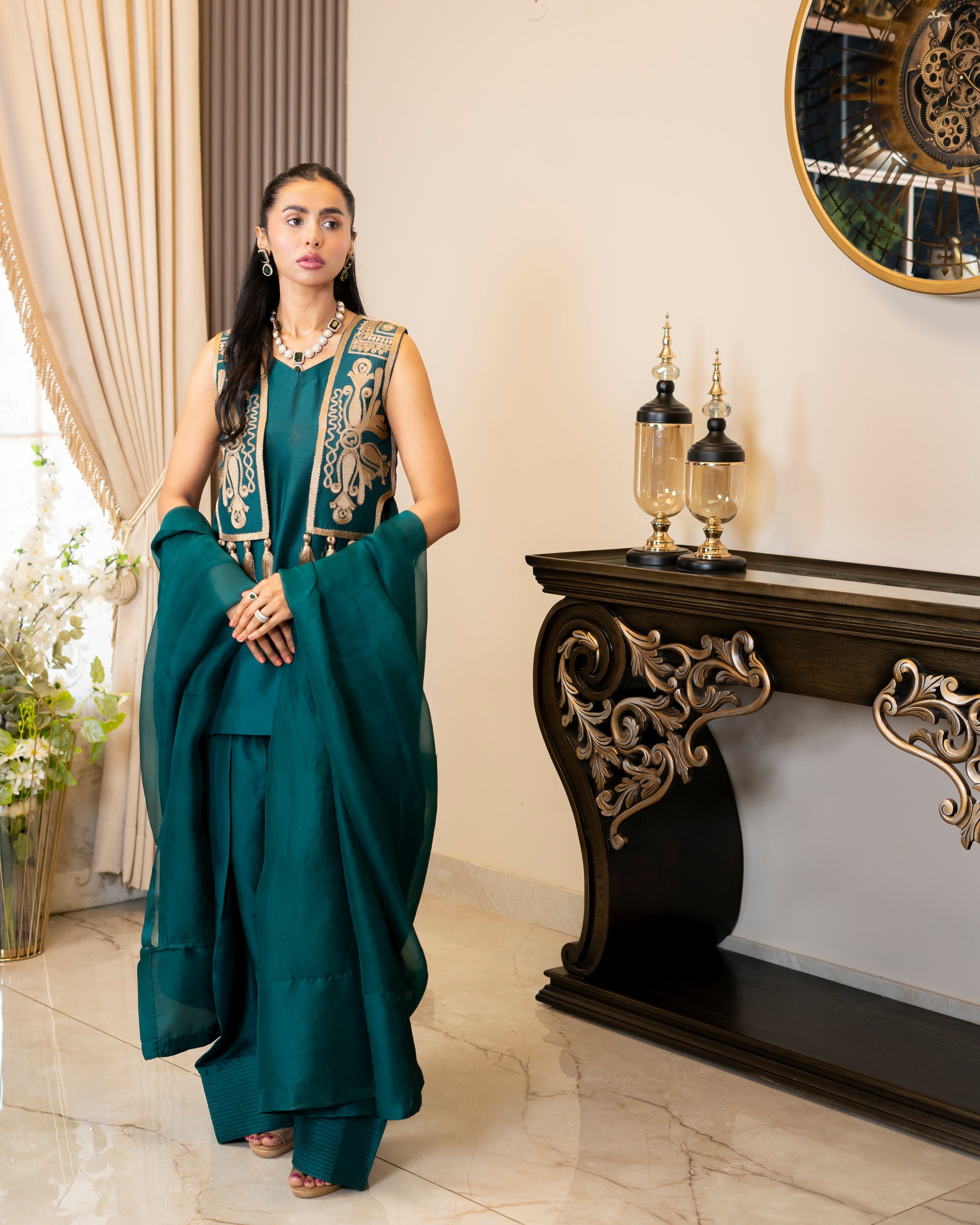 Make a regal statement with “Emerald Royale,” a luxurious three-piece ensemble crafted from pure silk in a rich emerald green hue. The standout feature of this look is the intricately embroidered waistcoat, adorned with golden threadwork and traditional motifs, adding a majestic touch. Paired with a flowy silk tunic, structured shalwar, and a sheer organza dupatta, this ensemble exudes elegance and sophistication, making it perfect for festive occasions, weddings, and formal gatherings.