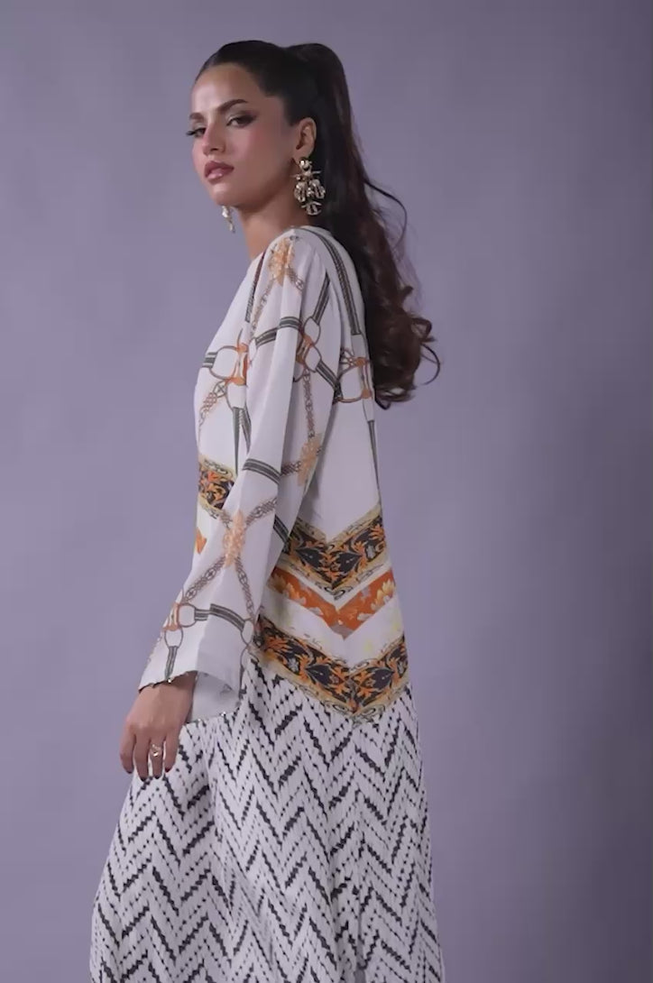A bold blend of modern symmetry and classic equestrian charm, Evara pairs an ivory base with golden chain and chevron motifs. Cut in breathable pure crape silk, this two-piece set is both structured and fluid ideal for elevating your daywear with effortless Flare