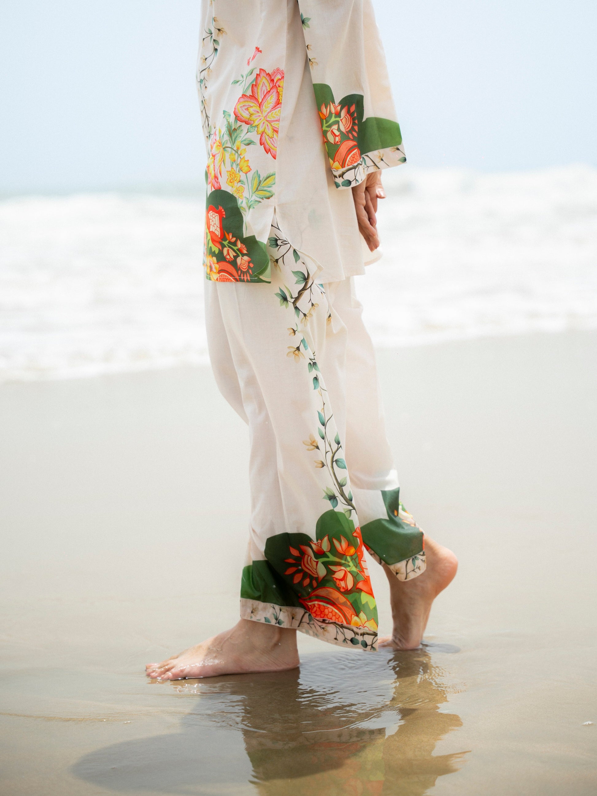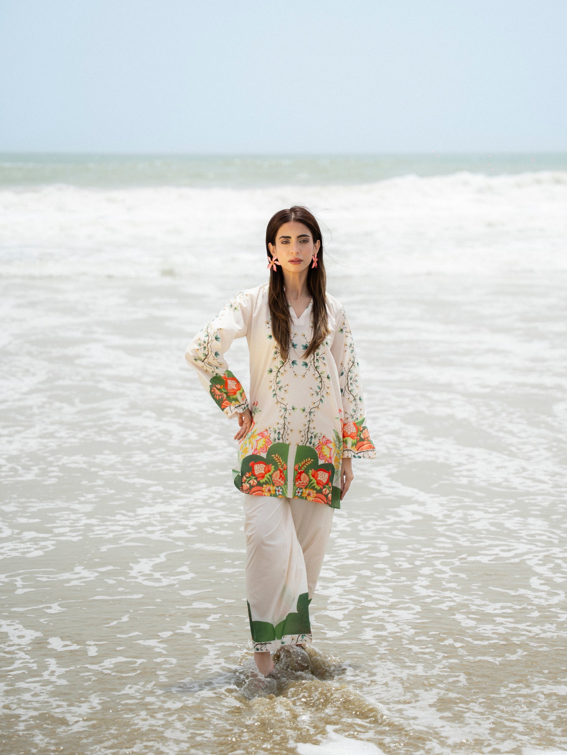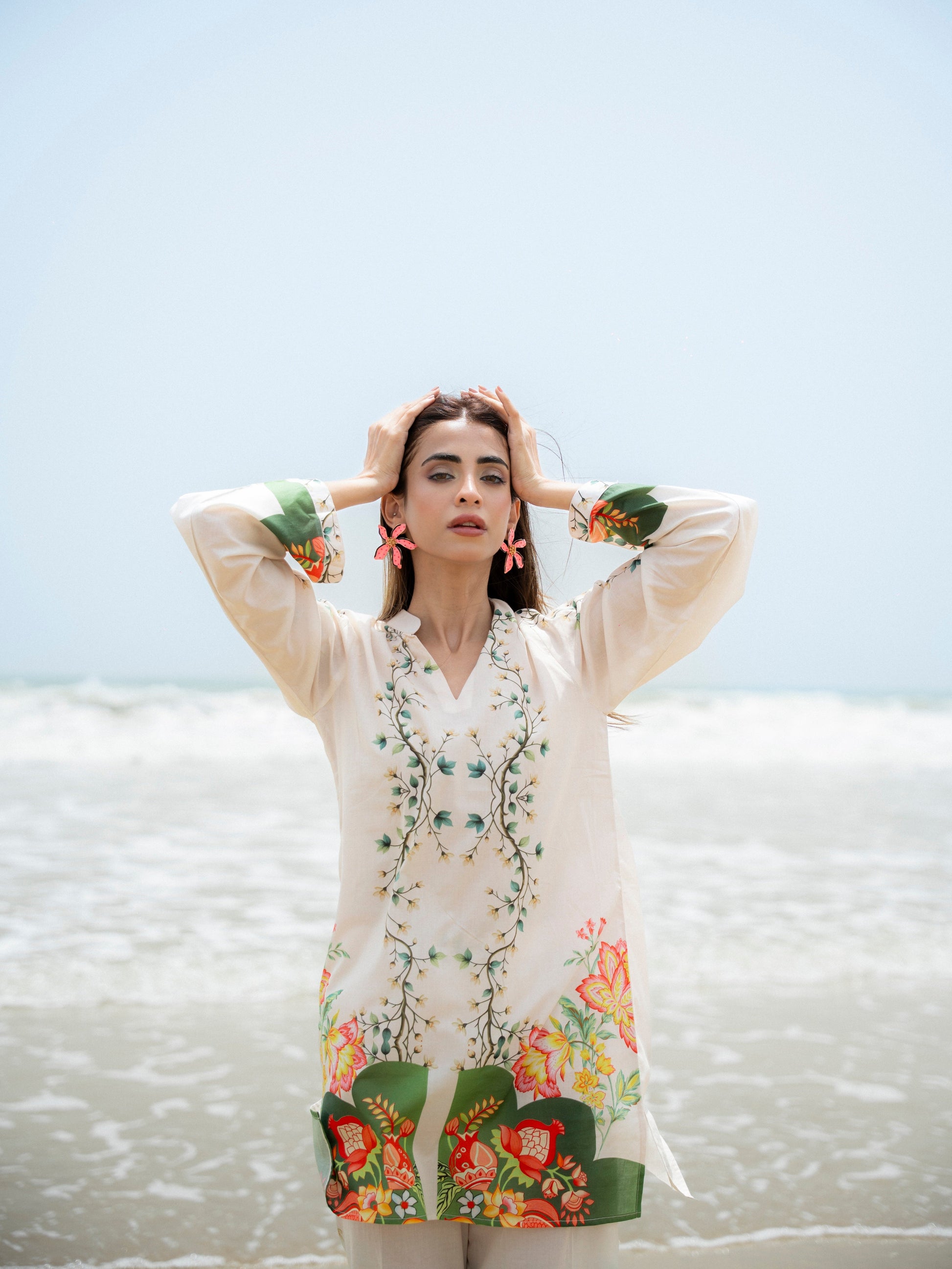 a gentle whisper of nature—floraé celebrates botanical elegance with a fresh palette of cream, green, and coral blooms. this lightweight two-piece set flows with ease and grace, making it perfect for sandy footprints, salty breezes, and effortless style.