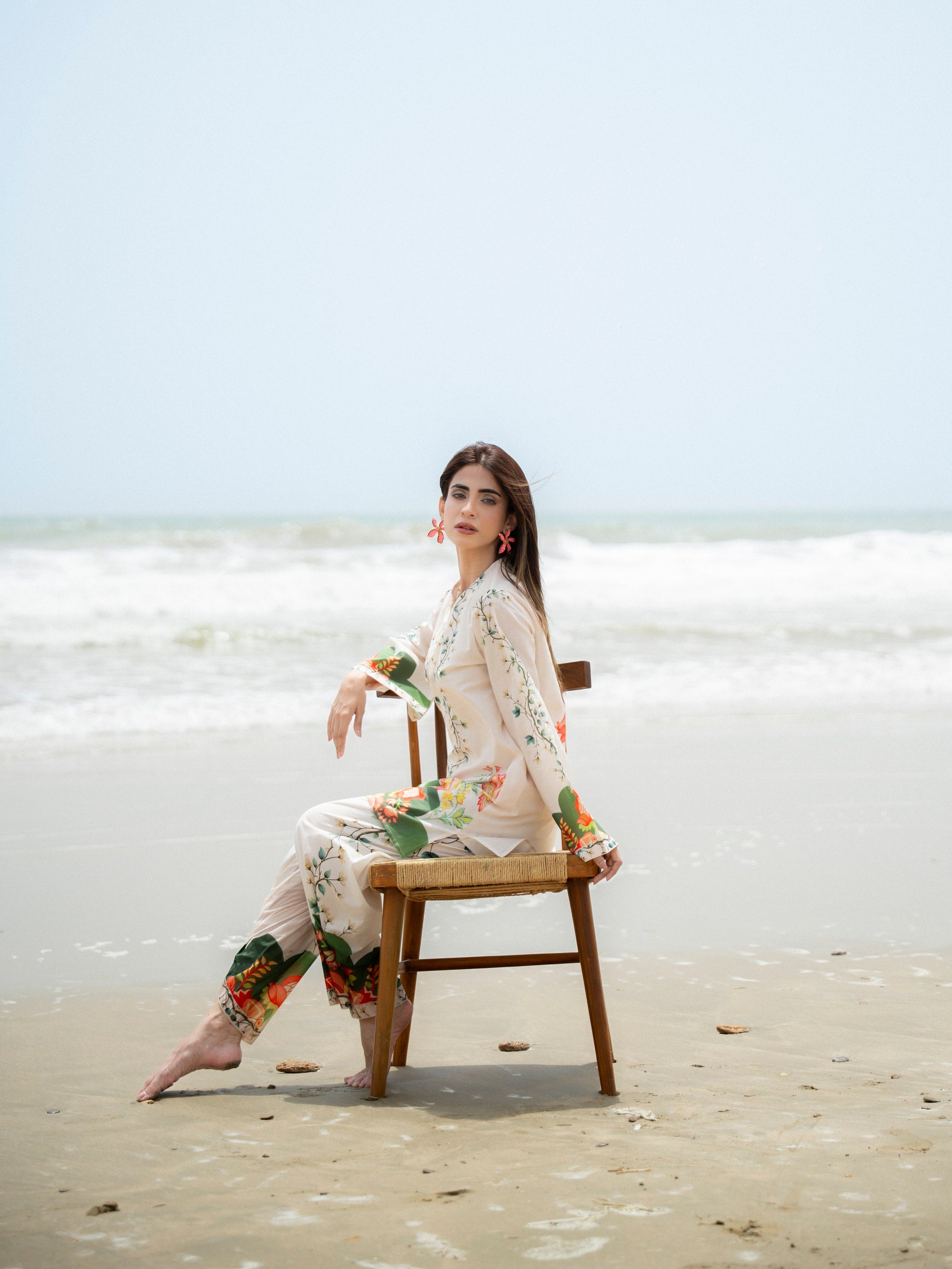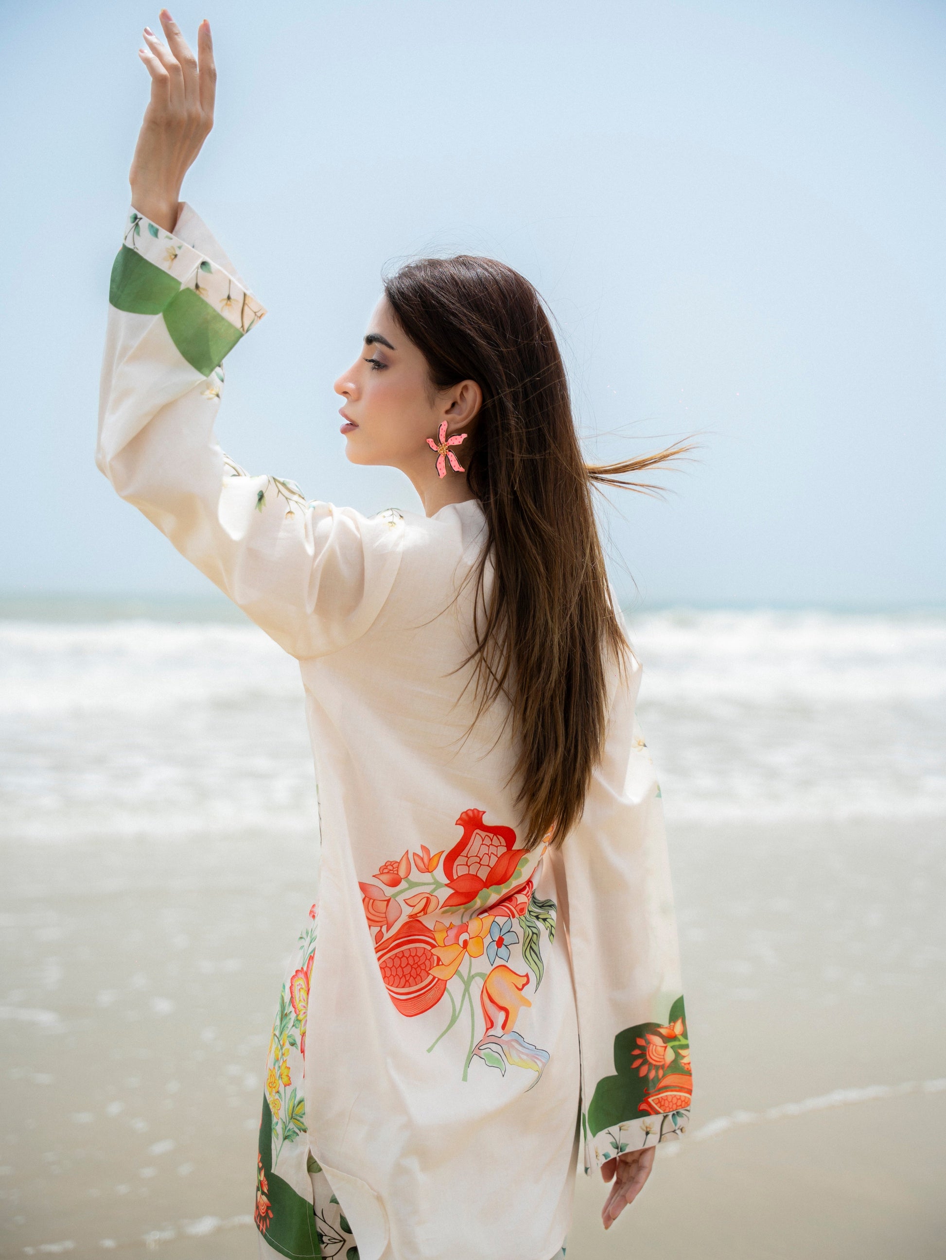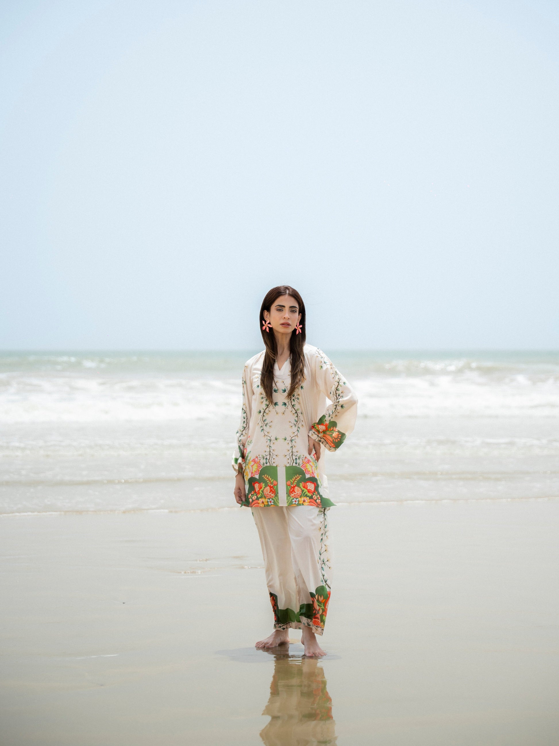 a gentle whisper of nature—floraé celebrates botanical elegance with a fresh palette of cream, green, and coral blooms. this lightweight two-piece set flows with ease and grace, making it perfect for sandy footprints, salty breezes, and effortless style.
