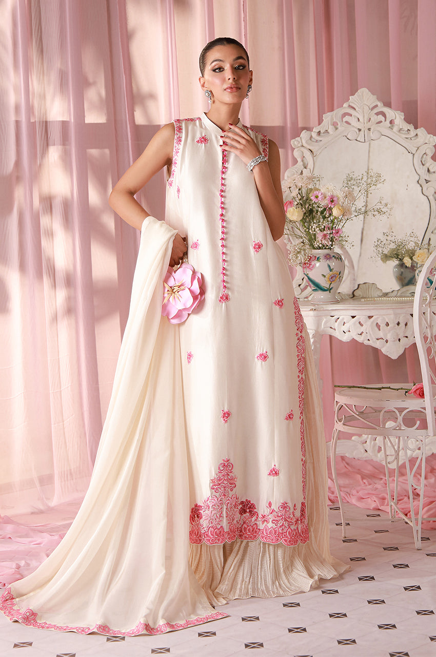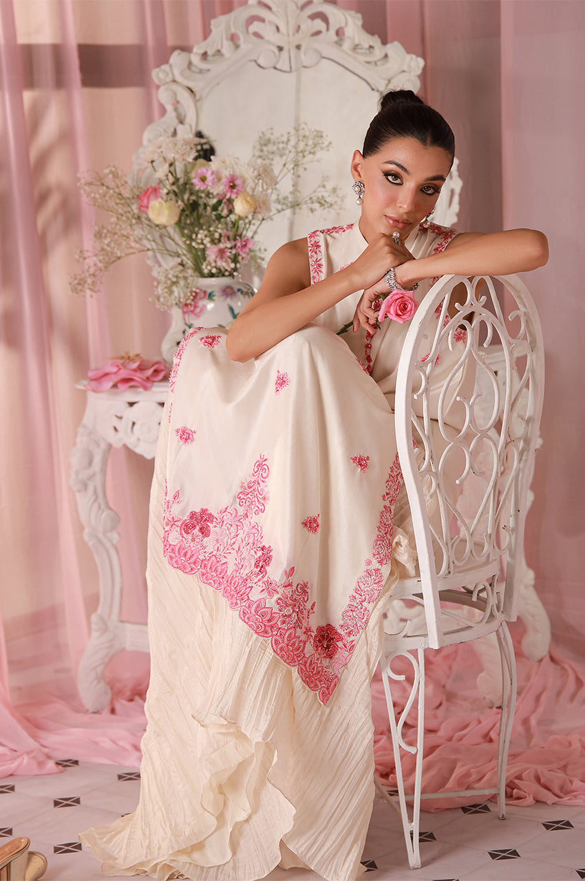Crafted from pure raw silk in a luminous ivory tone with fuchsia embroidery, Ivora embodies modern femininity and subtle grandeur. The silhouette flows with effortless grace, celebrating purity, softness, and timeless elegance.