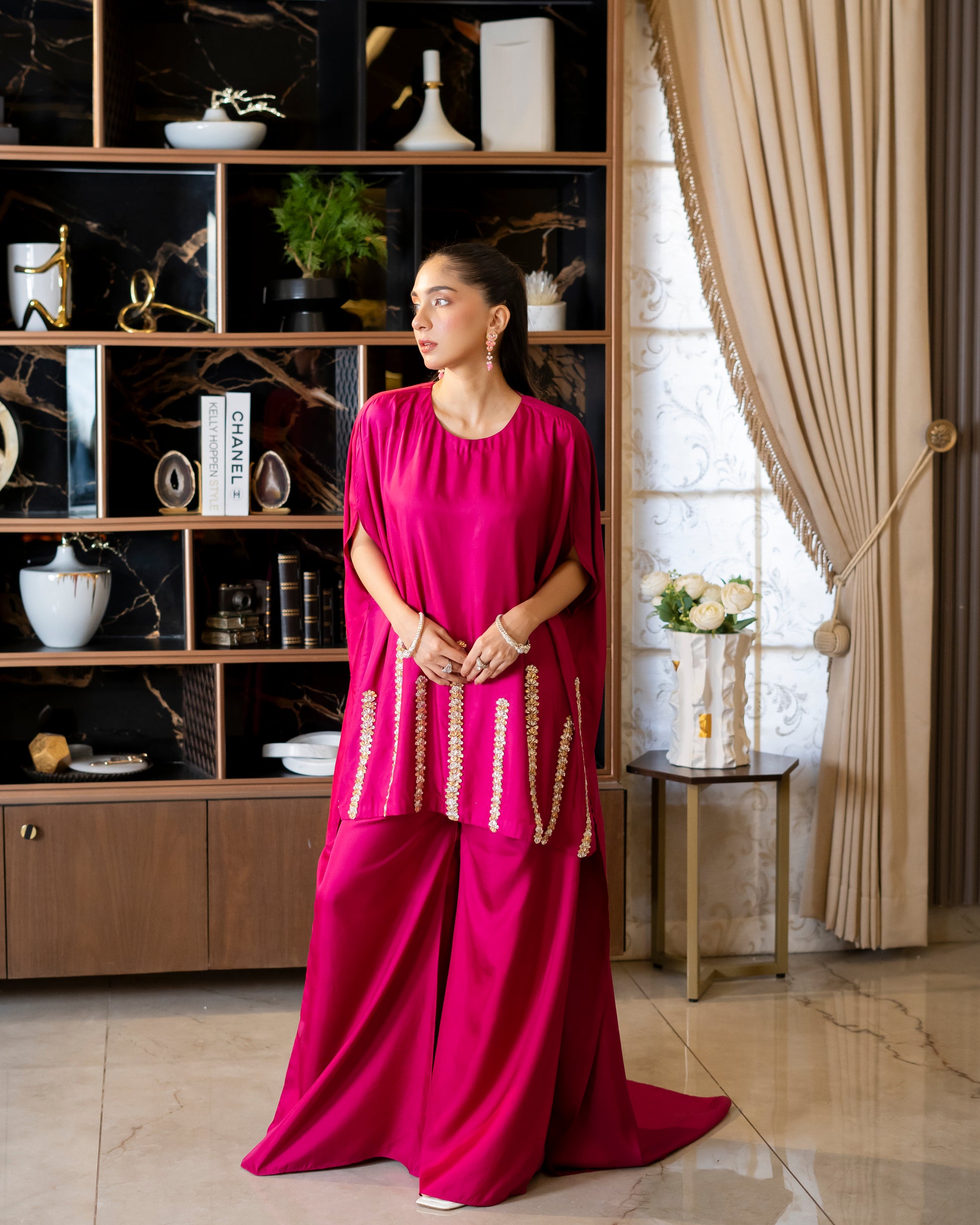 Command attention with “Magenta Majesty,” a statement-making pure rod silk cape ensemble designed for elegance and grandeur. The flowy magenta cape tunic, embellished with delicate golden embroidery, drapes effortlessly, creating a regal silhouette. Paired with wide-leg silk pants, this outfit is a perfect fusion of drama and sophistication, ideal for evening events, festive occasions, and formal soirées.