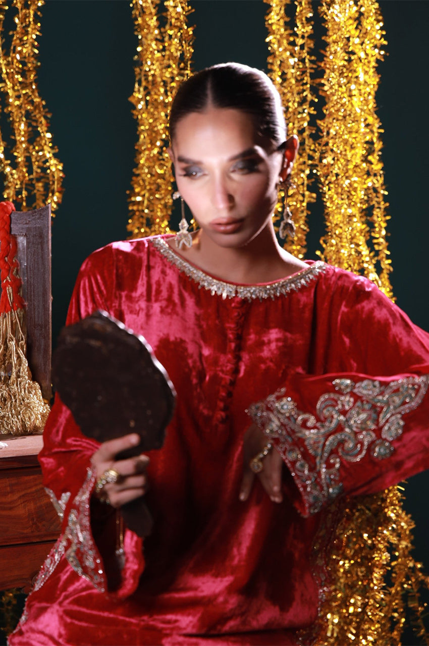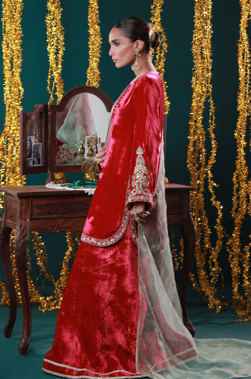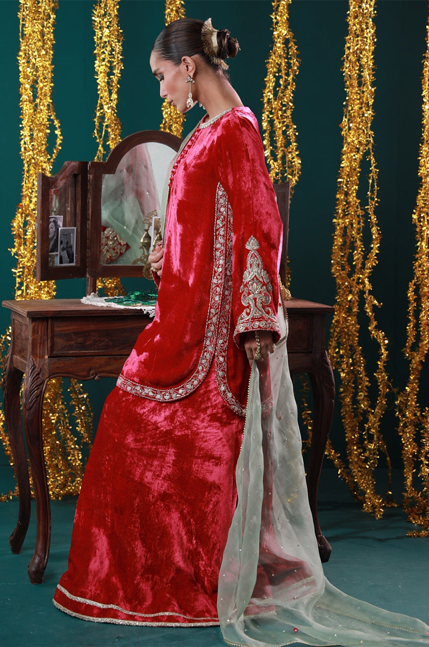 Jahanara is a striking red velvet ensemble designed with timeless elegance in mind. The rich tone is elevated by intricate gold embroidery and paired with a soft mint dupatta for a royal contrast. From winter weddings to intimate mehfils, this look channels grandeur with grace.