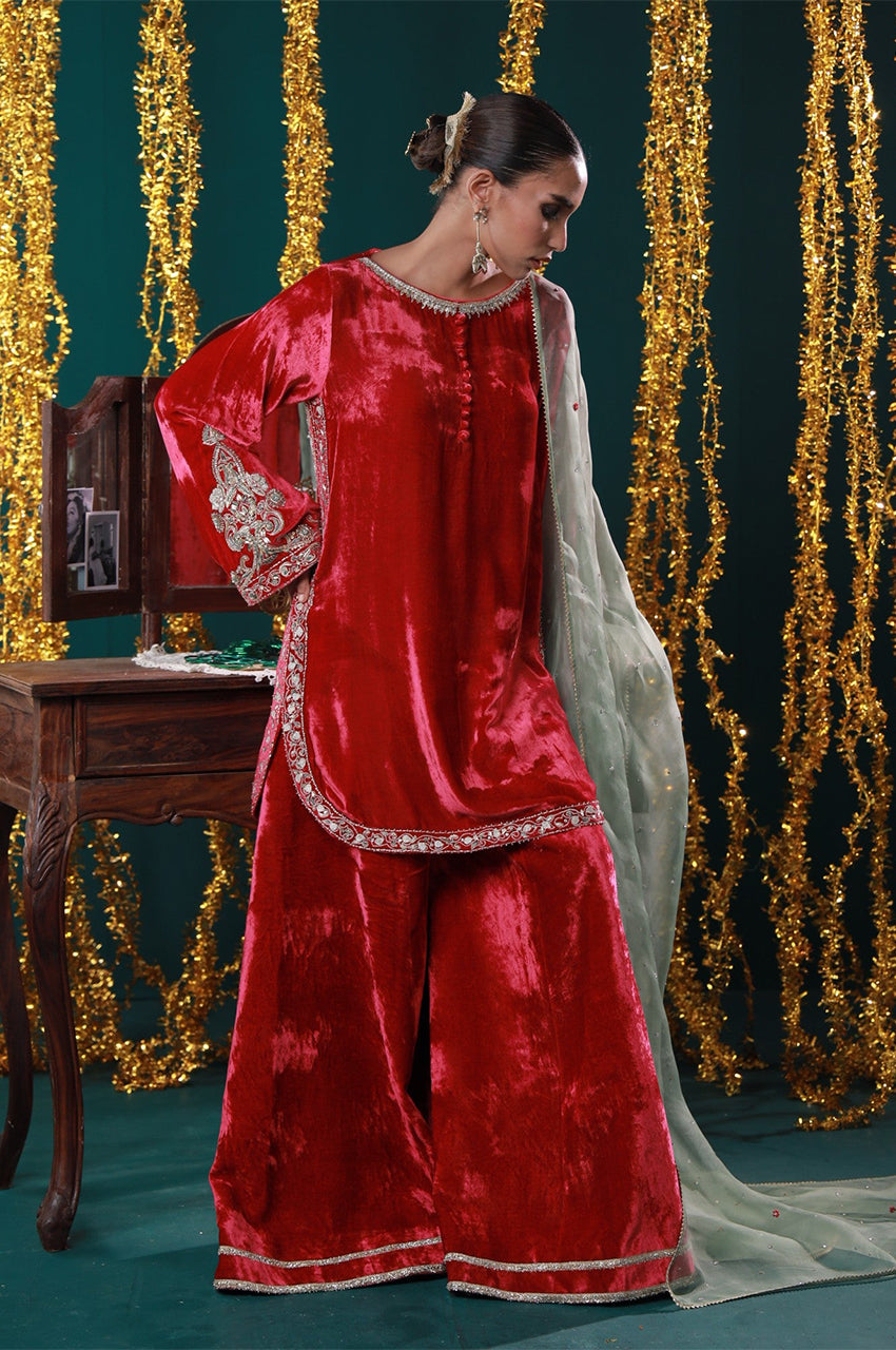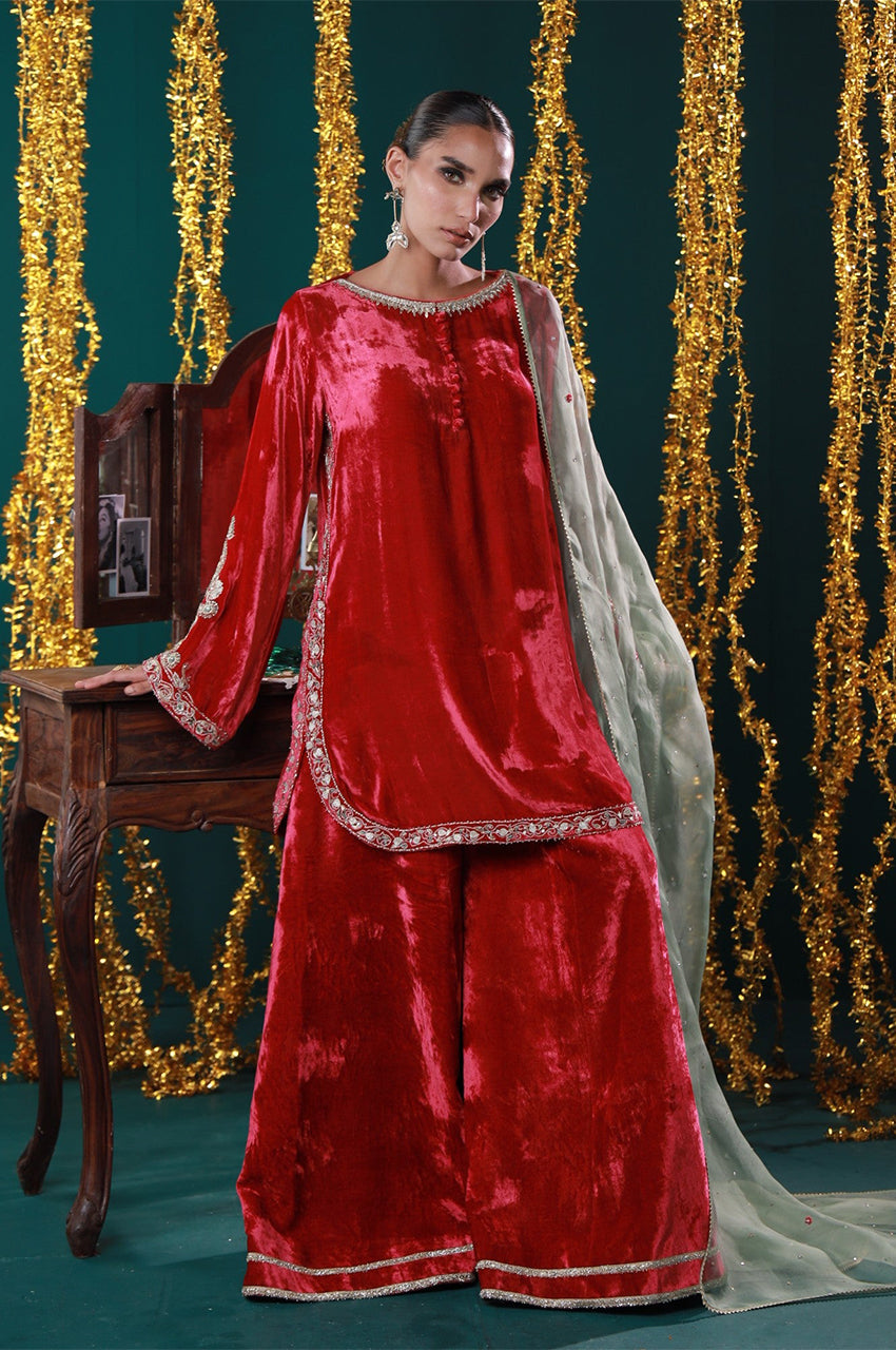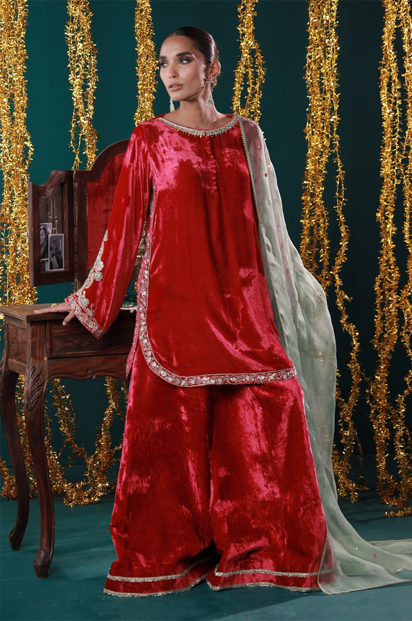 Jahanara is a striking red velvet ensemble designed with timeless elegance in mind. The rich tone is elevated by intricate gold embroidery and paired with a soft mint dupatta for a royal contrast. From winter weddings to intimate mehfils, this look channels grandeur with grace.