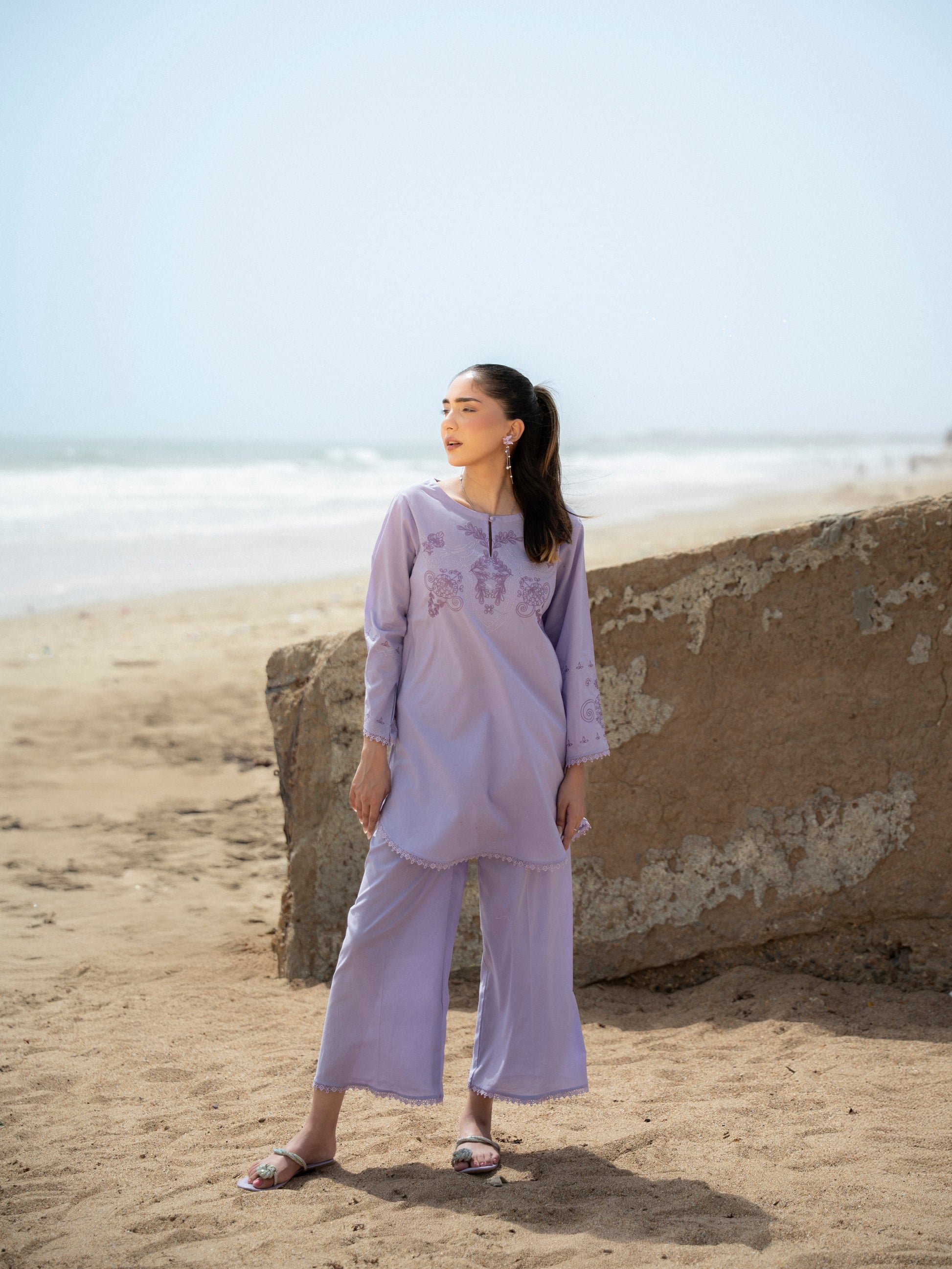 lilora blooms in whispers—a soothing lilac set adorned with tonal embroidery and subtle scalloped edges. this two-piece embodies simplicity and charm, perfect for breezy beach days, serene brunches, and moments where elegance meets ease.