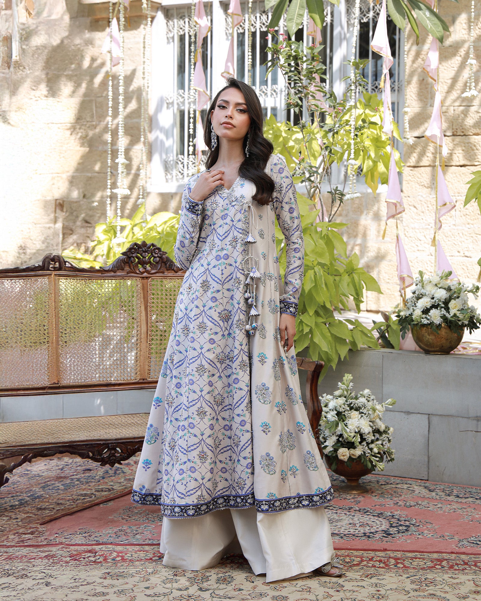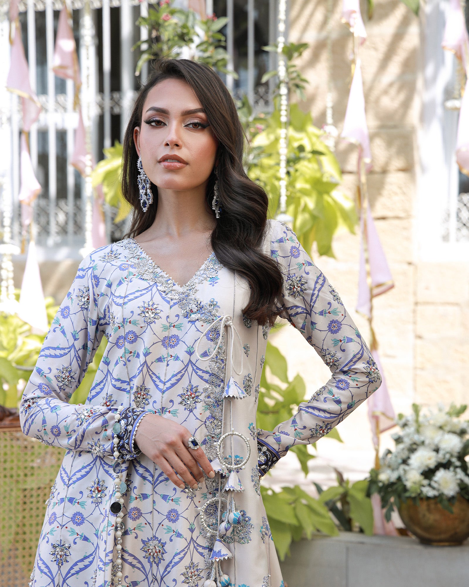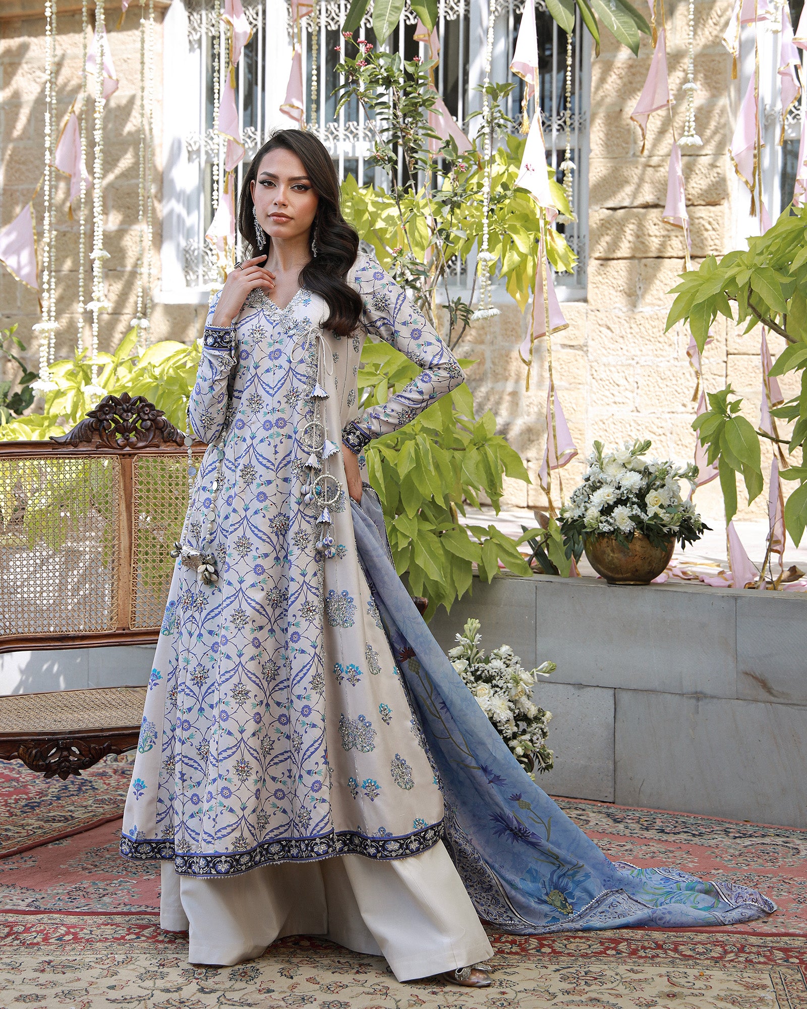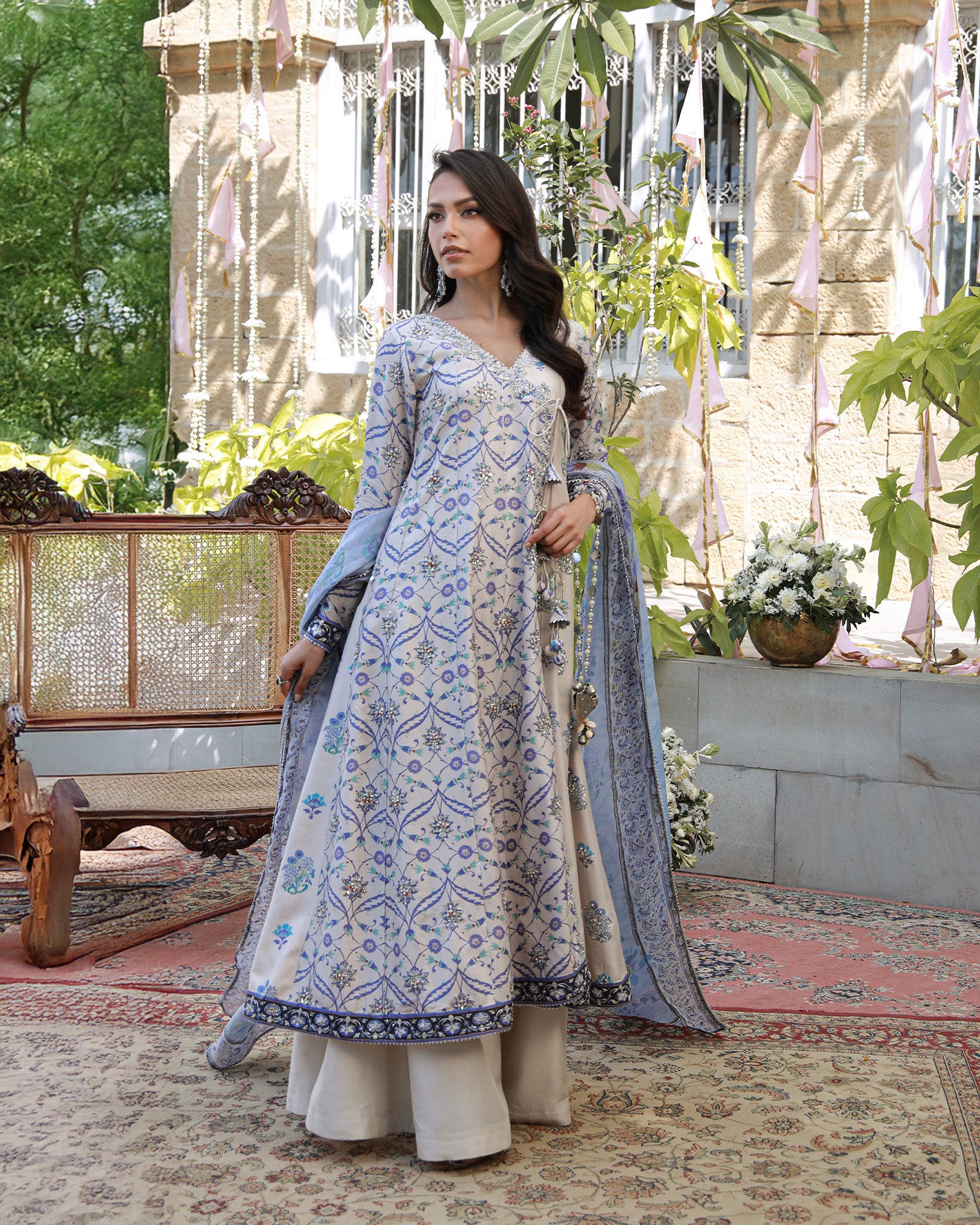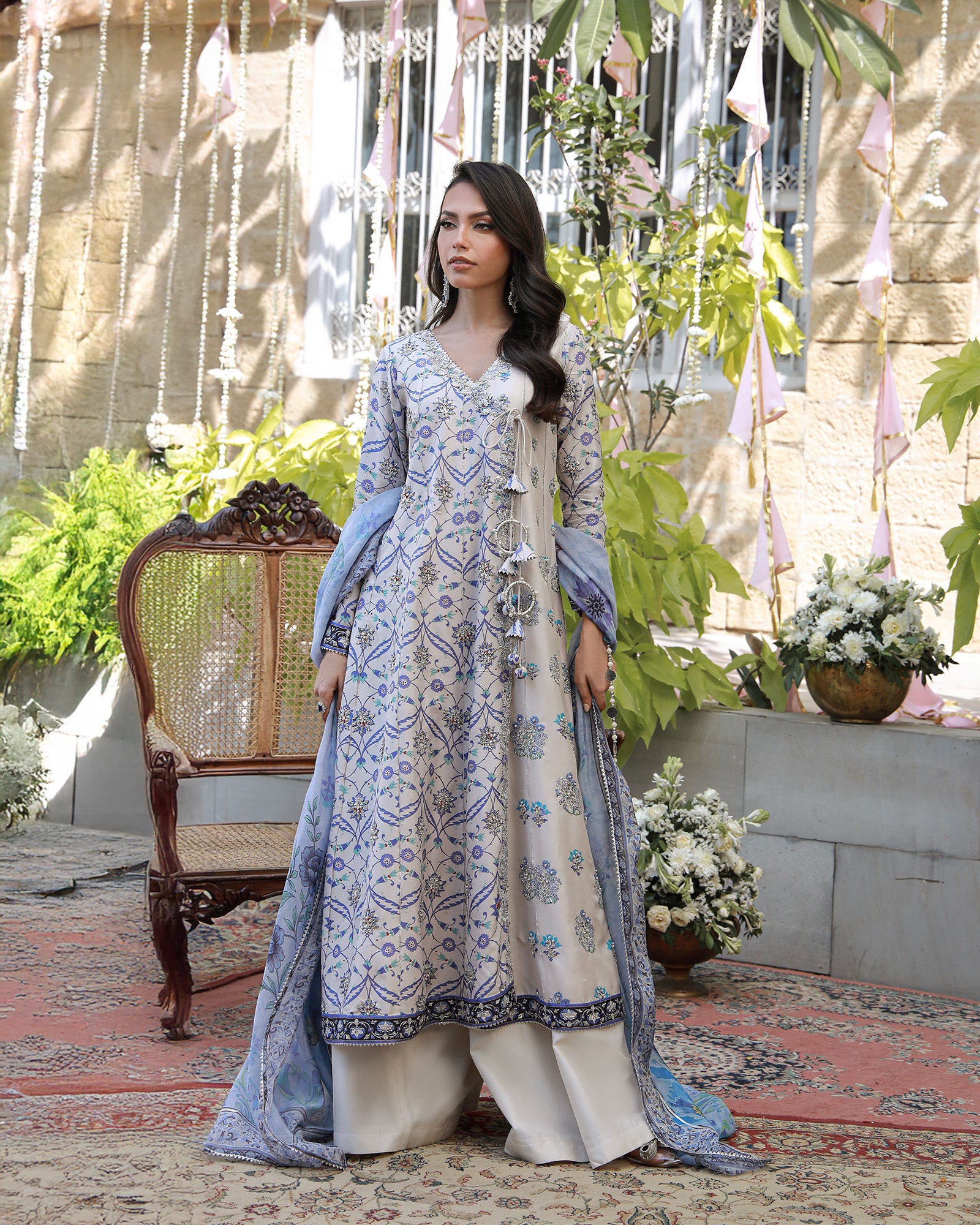 Bathed in shades of ivory and periwinkle, Lisél radiates poise and delicate grandeur. The intricate threadwork and fluid silhouette evoke an aura of calm sophistication — a timeless ode to understated elegance, where tradition whispers through modern design.