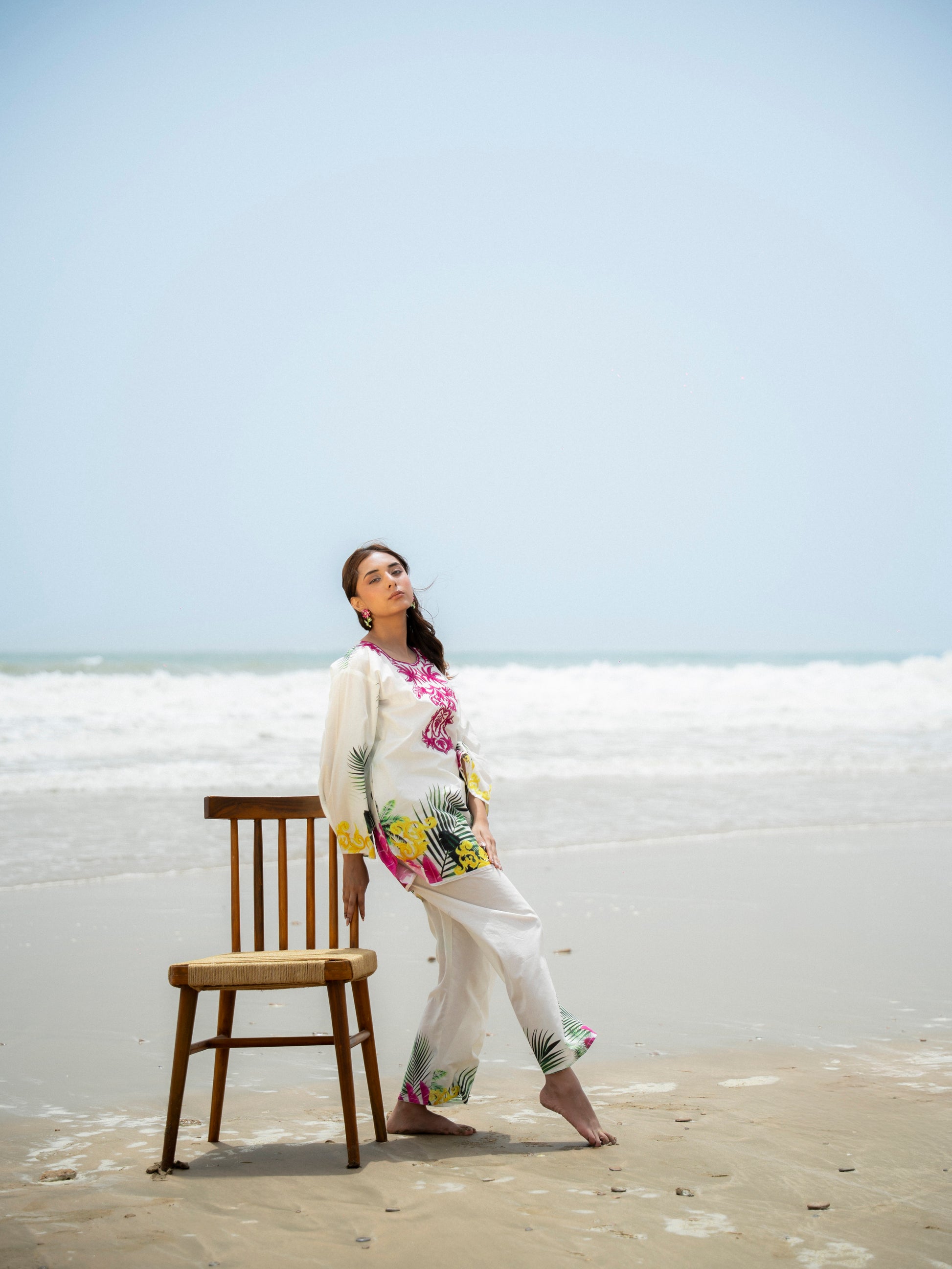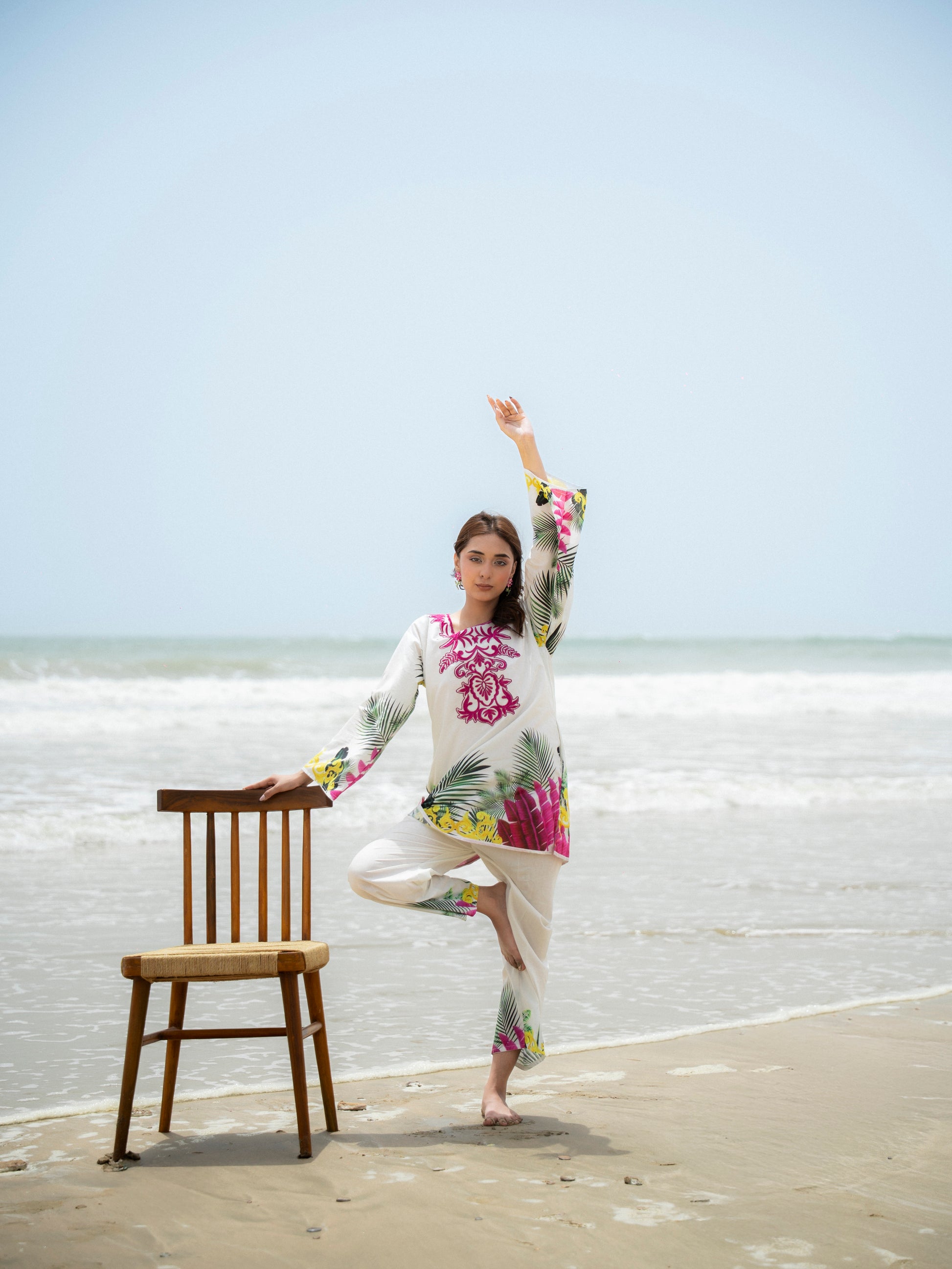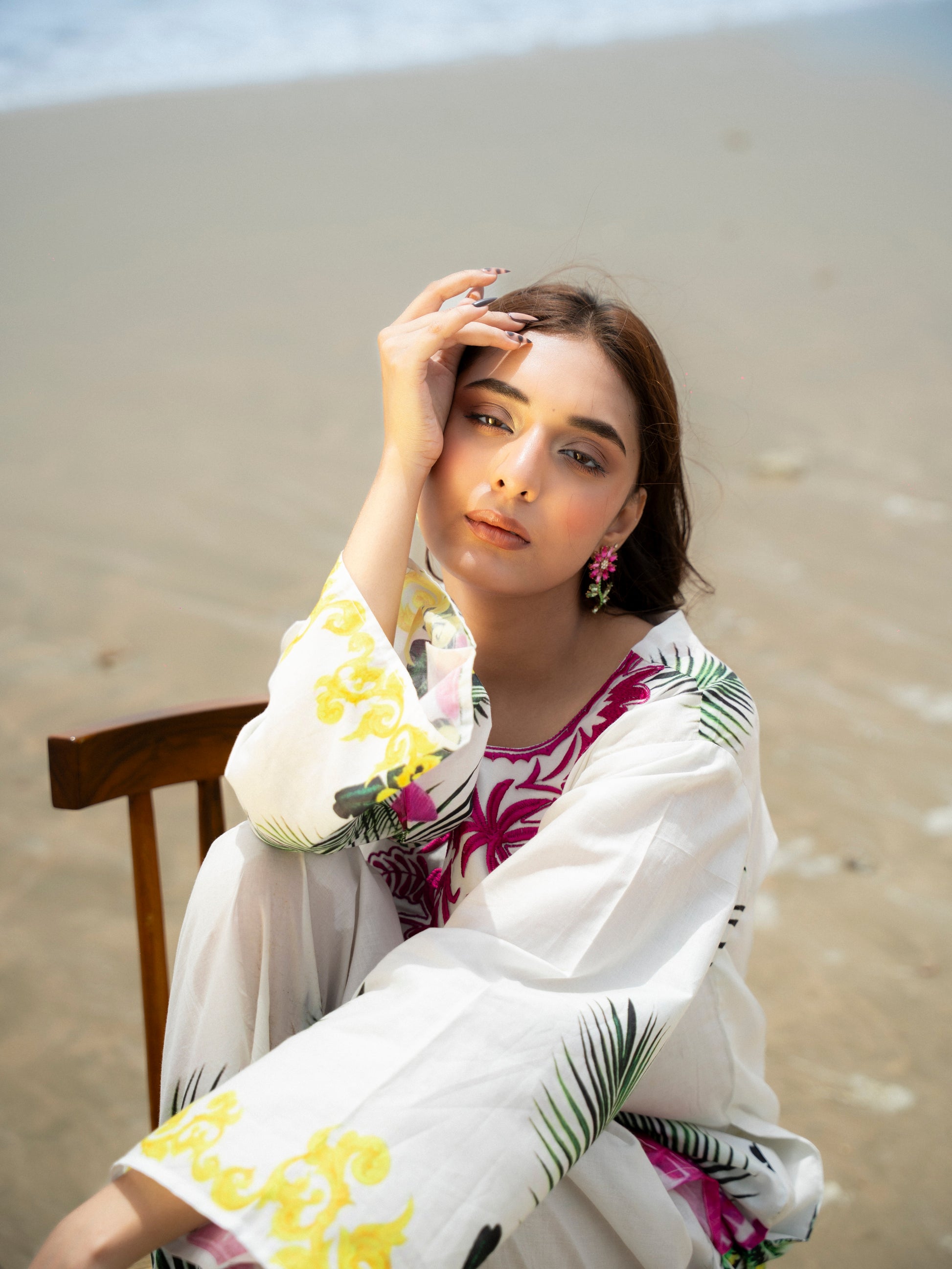 soft, airy, and vibrant—luma is an ode to lightness and color. set against a crisp white base, the floral fusion of fuchsia, yellow, and green leafy accents evokes a sense of coastal bloom. its relaxed cut and flowy fabric make it a breezy favorite for sunlit escapes and garden gatherings