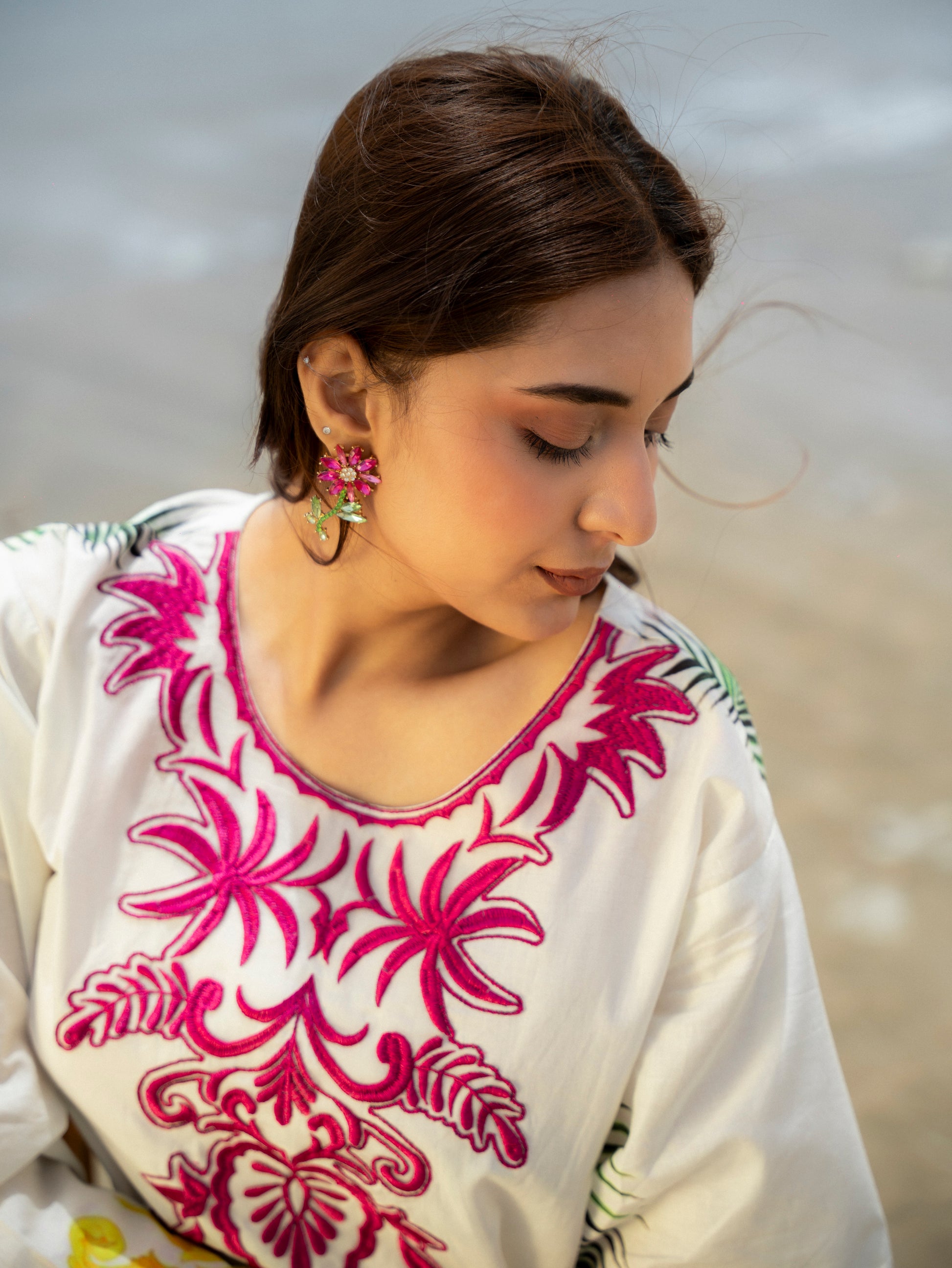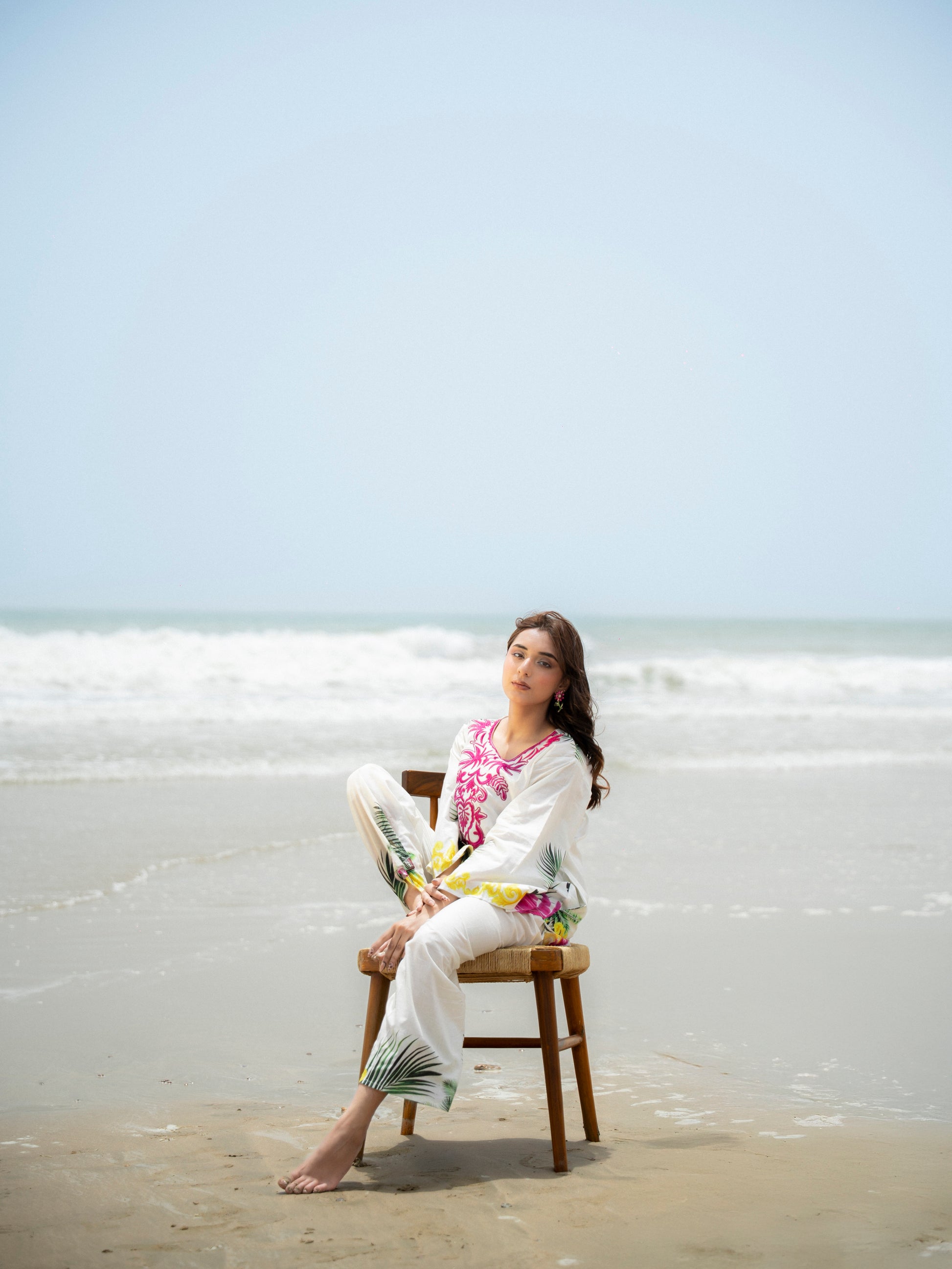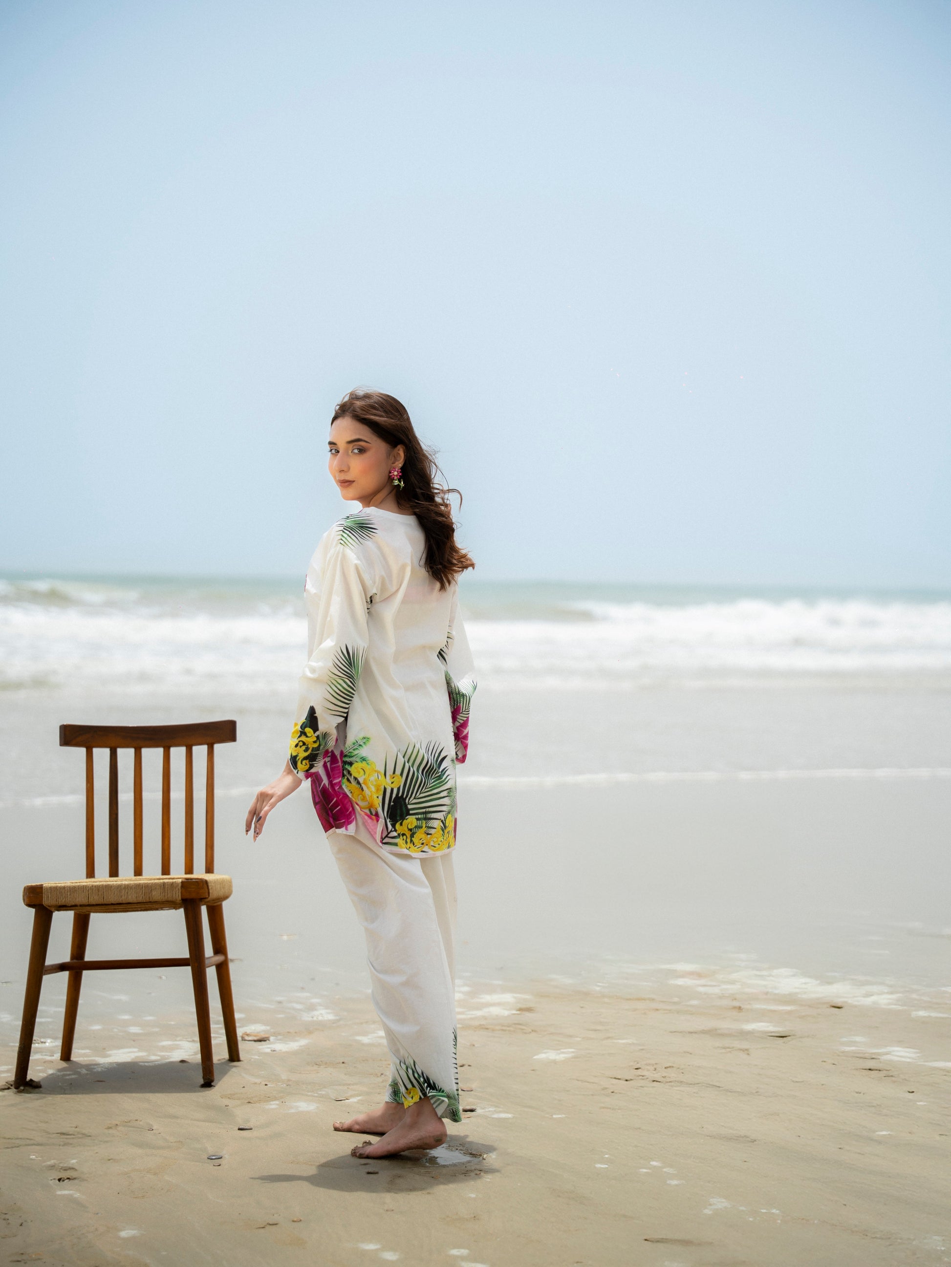 soft, airy, and vibrant—luma is an ode to lightness and color. set against a crisp white base, the floral fusion of fuchsia, yellow, and green leafy accents evokes a sense of coastal bloom. its relaxed cut and flowy fabric make it a breezy favorite for sunlit escapes and garden gatherings