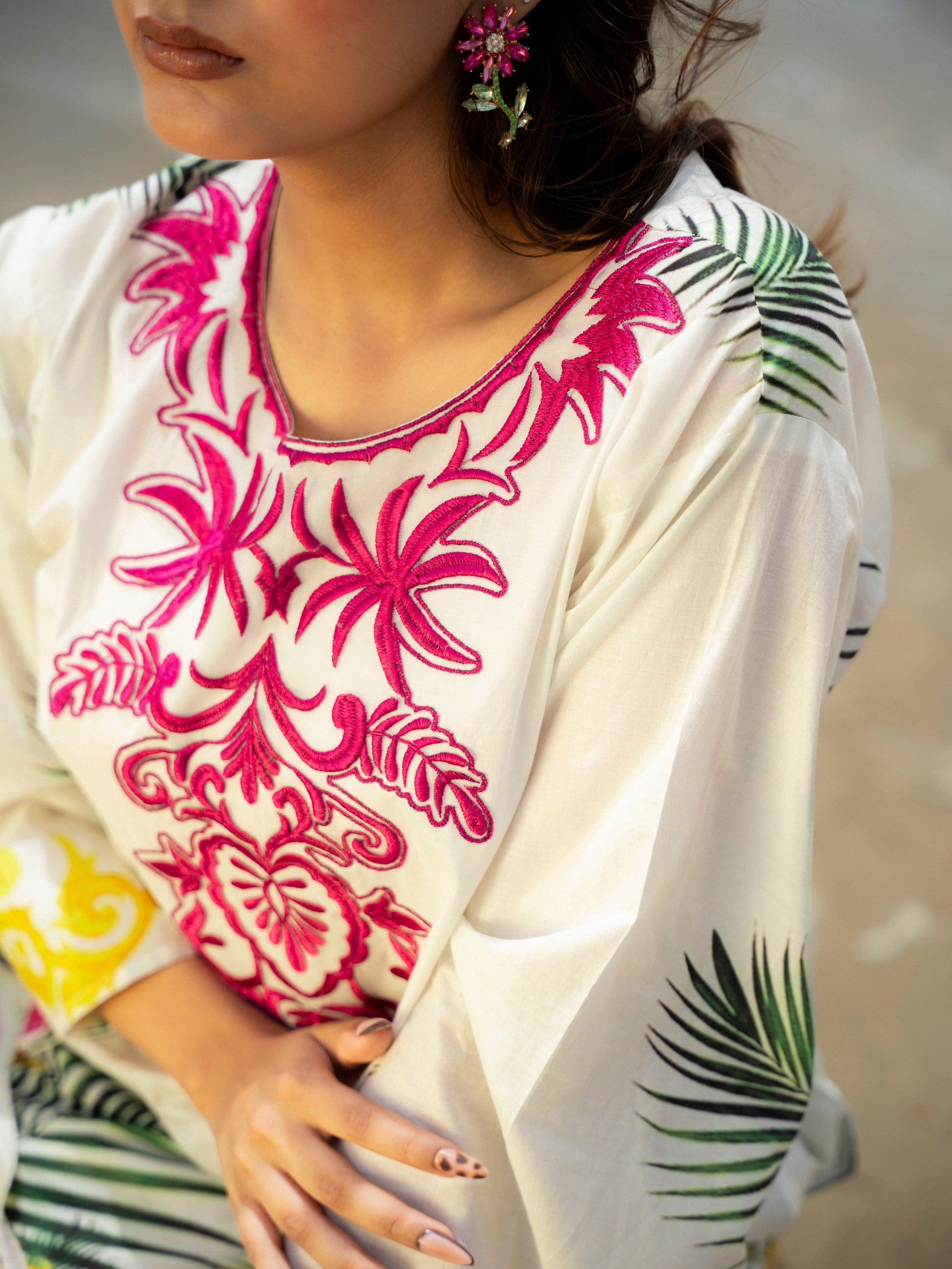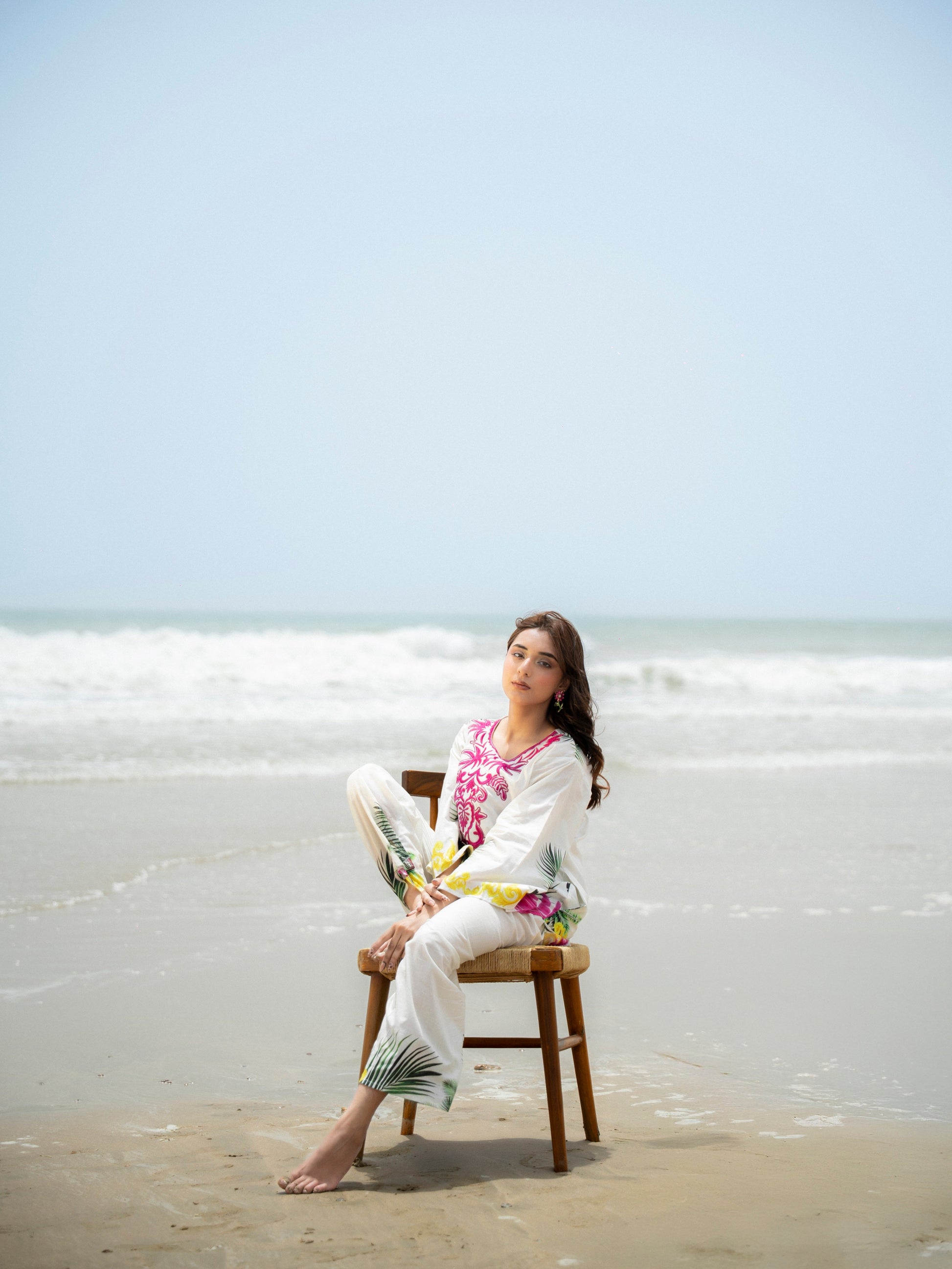 soft, airy, and vibrant—luma is an ode to lightness and color. set against a crisp white base, the floral fusion of fuchsia, yellow, and green leafy accents evokes a sense of coastal bloom. its relaxed cut and flowy fabric make it a breezy favorite for sunlit escapes and garden gatherings