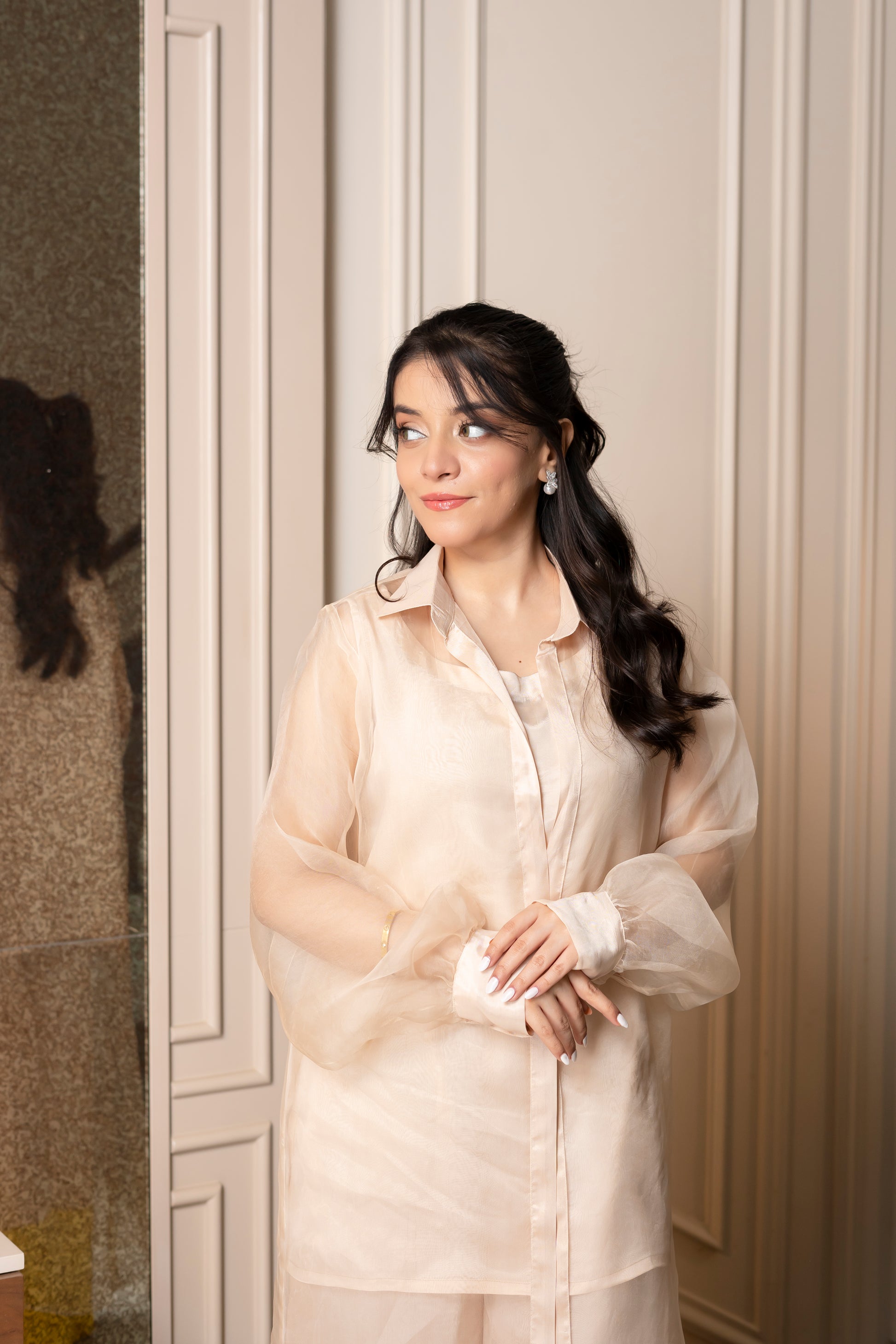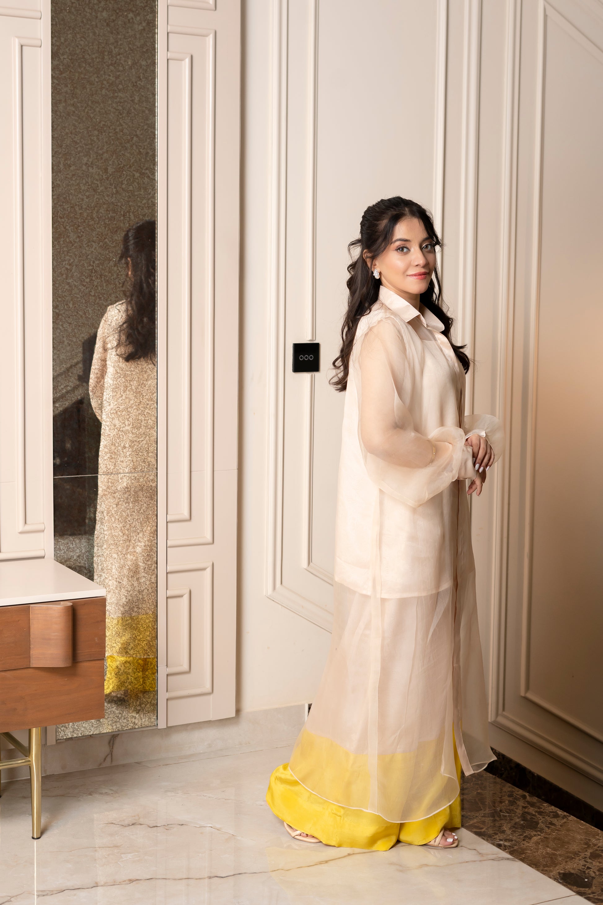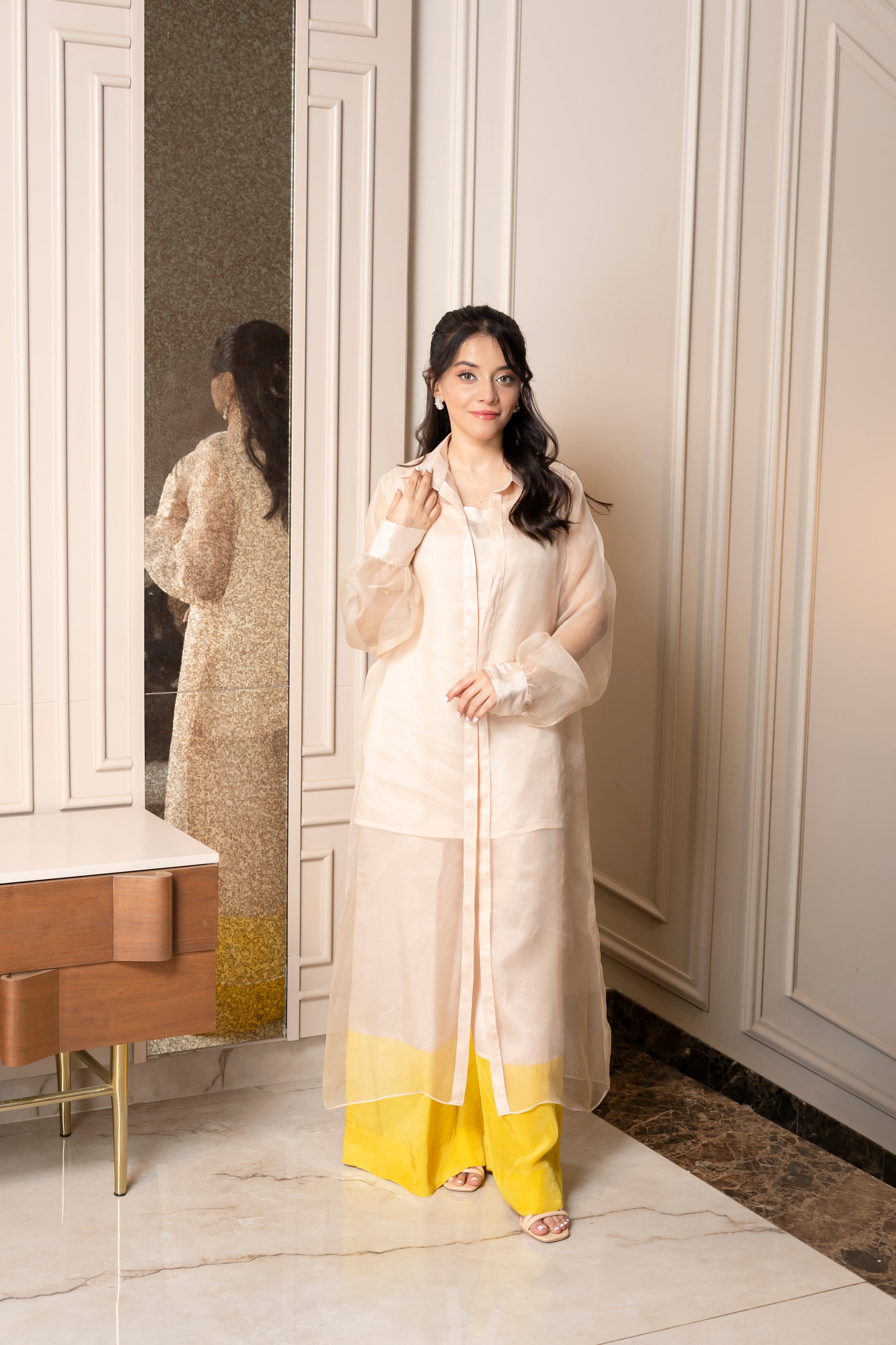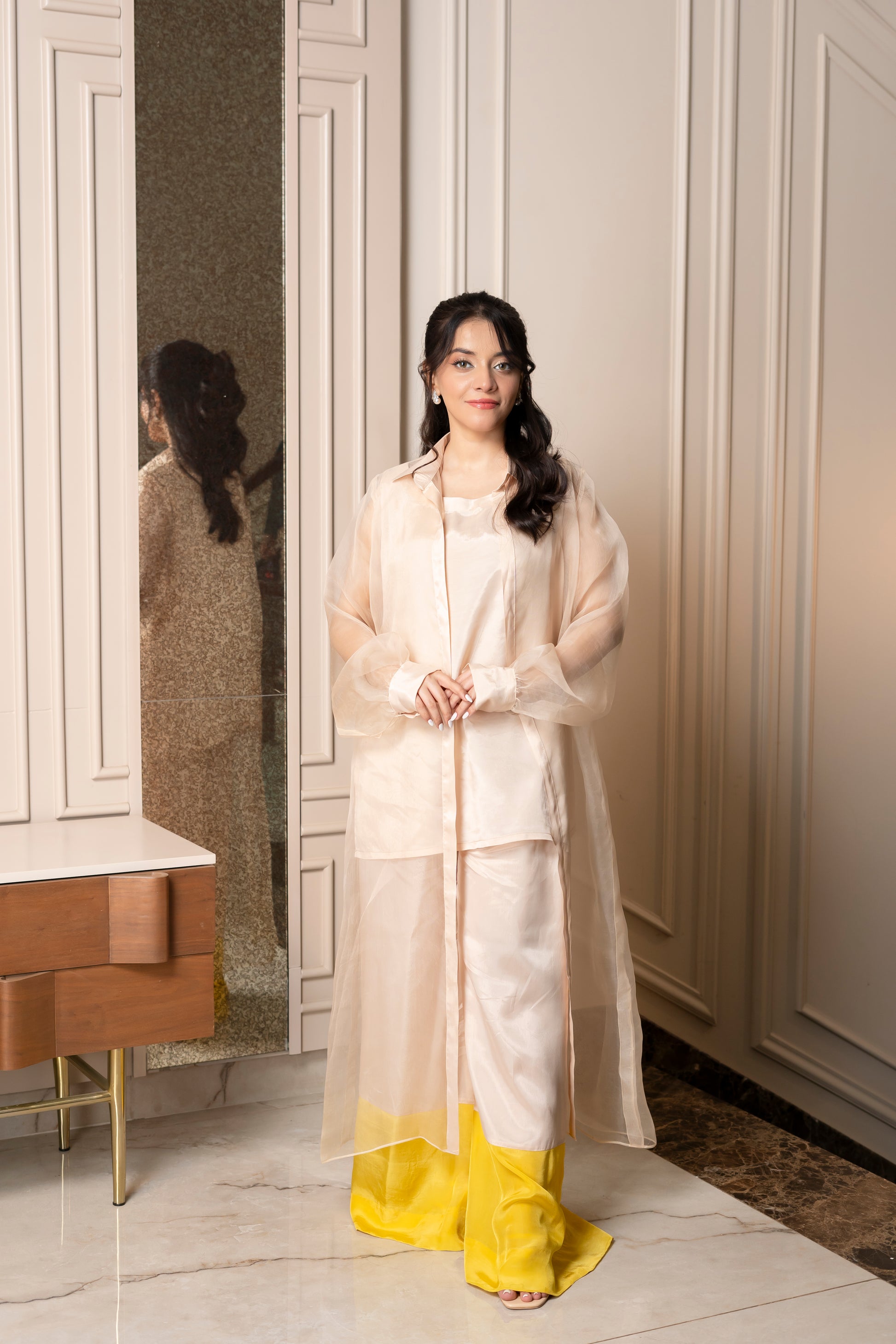 Step into elegance with the "Luminous Layers" outfit, featuring a luxurious silk base complemented by a delicate organza jacket. The ensemble showcases a beautifully crafted silk dress in a soft hue that flows gracefully, exuding sophistication and femininity. The sheer organza jacket adds an ethereal touch, with its flowing fabric and subtle sheen, enhancing the overall look. The jacket is designed with a chic contrast at the hem, incorporating a pop of vibrant yellow that adds a modern flair. This outfit is perfect for special occasions or elegant gatherings, allowing you to make a stylish statement while feeling comfortable and confident.