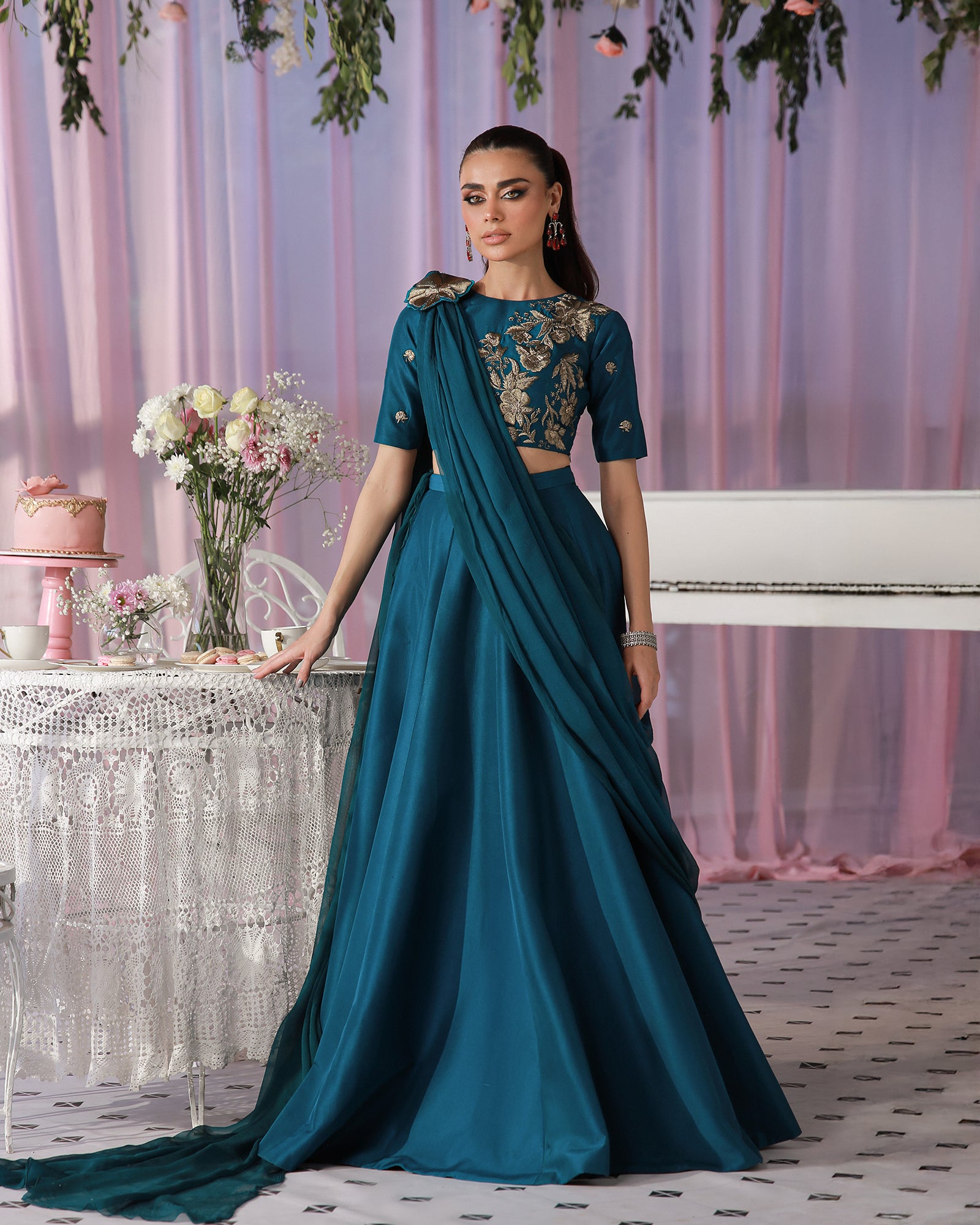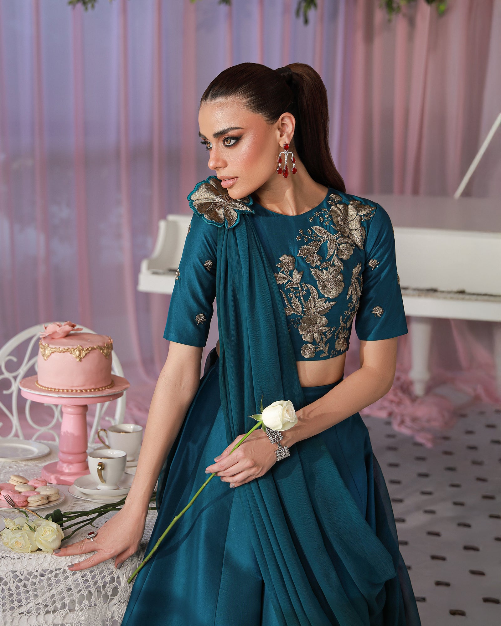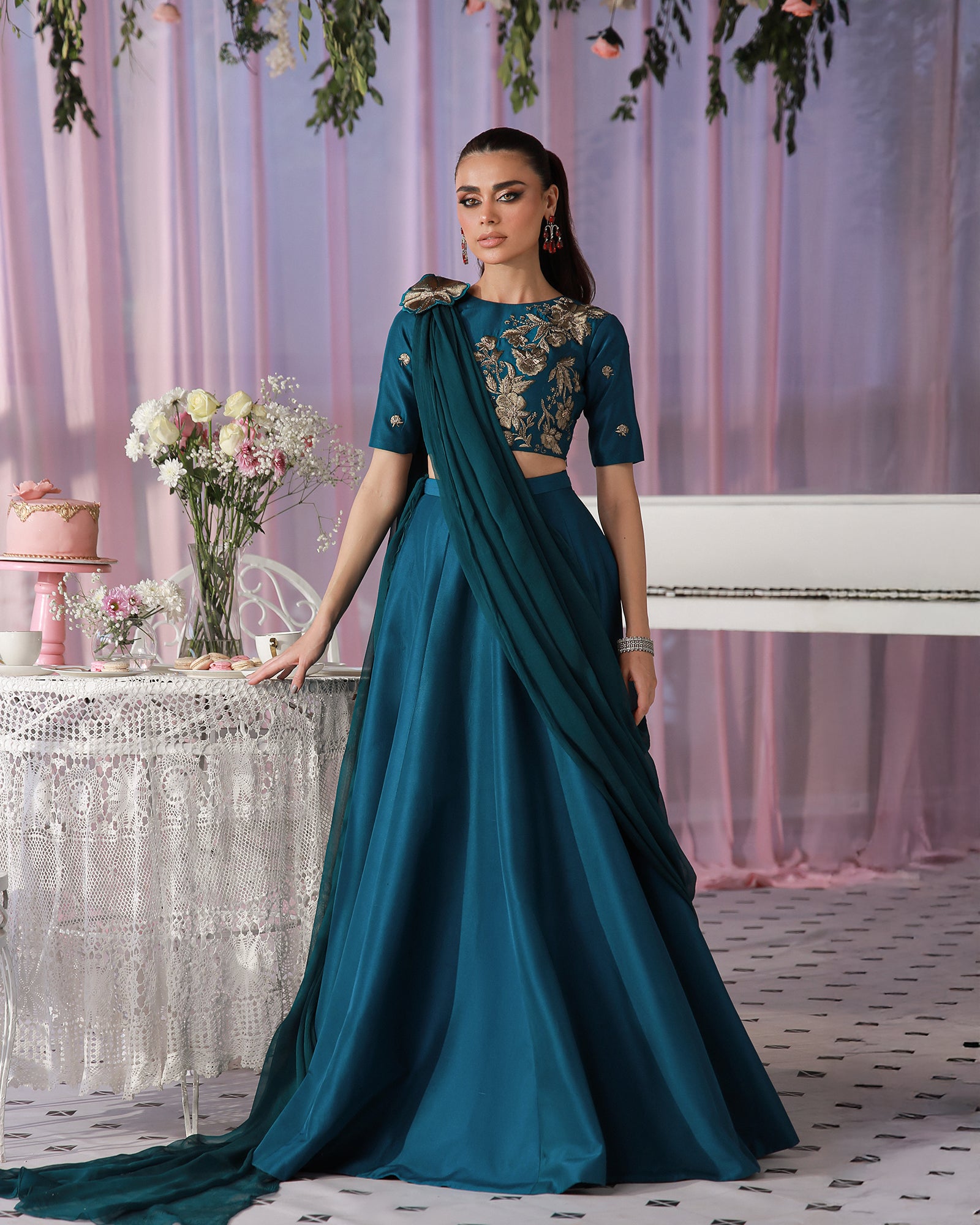 Crafted from pure raw silk in a deep teal hue, Maéra embodies fluid grace and refined sophistication. The intricately embroidered bodice and effortless drape evoke the calm strength of the modern muse — a seamless blend of timeless eastern artistry and contemporary poise.
