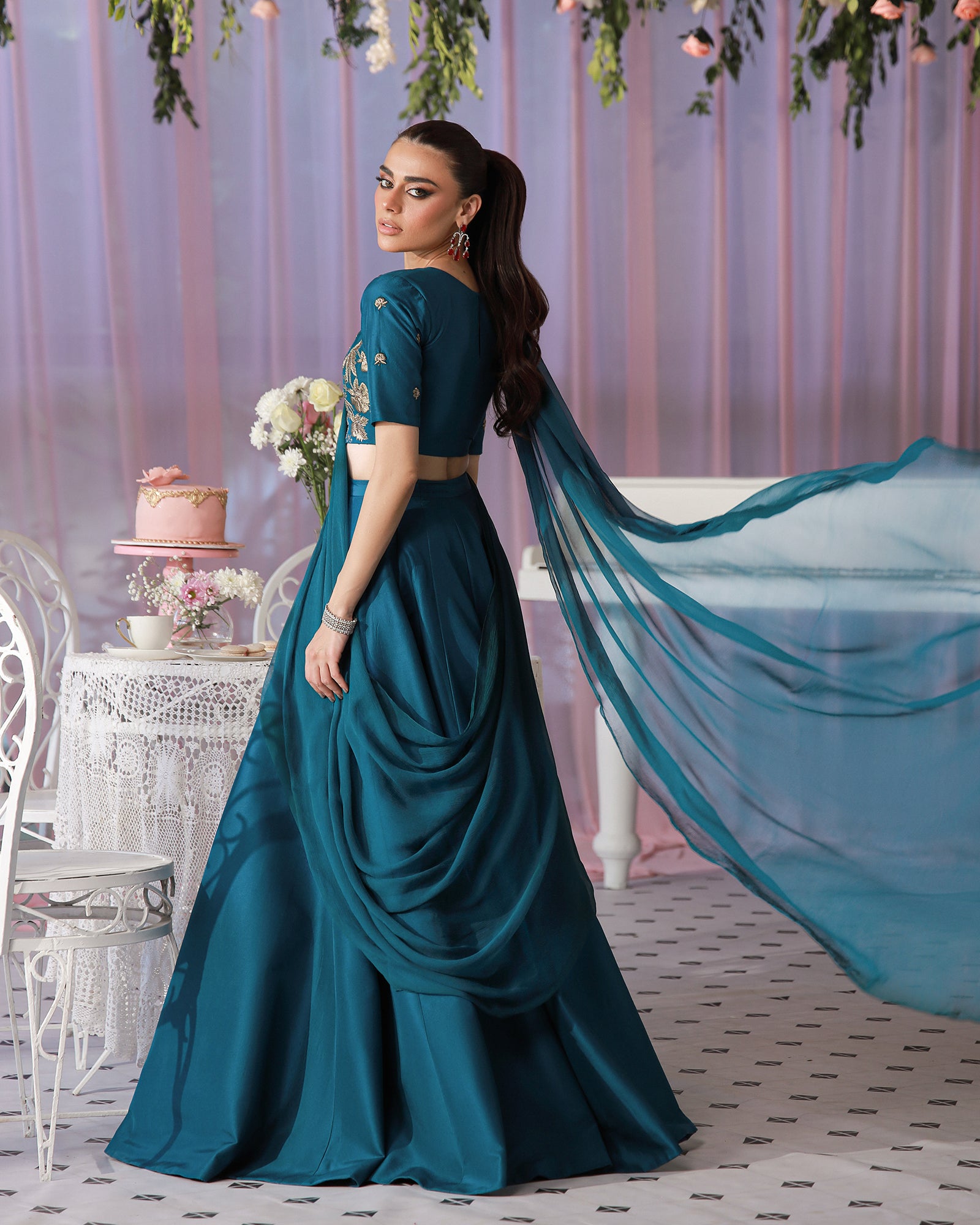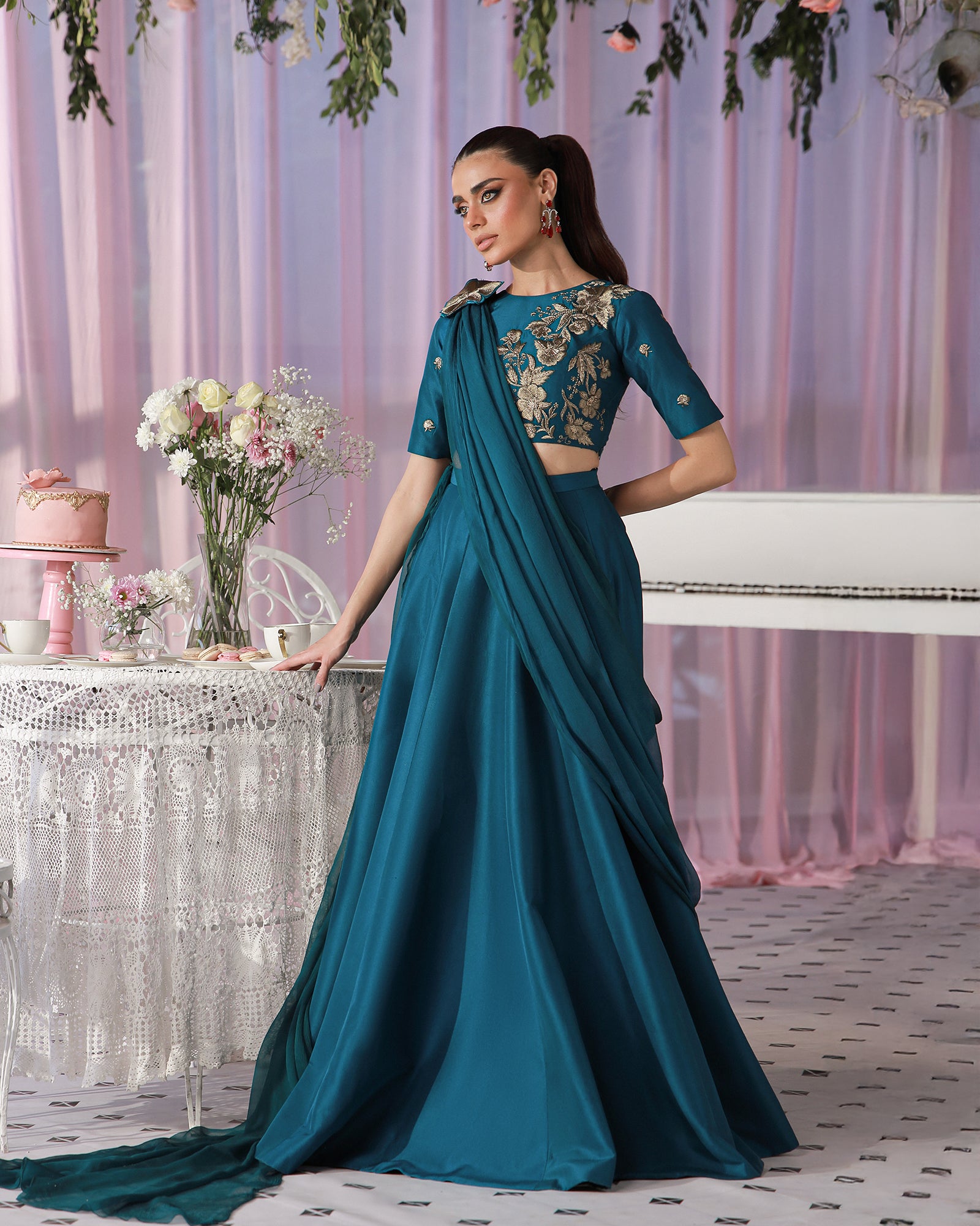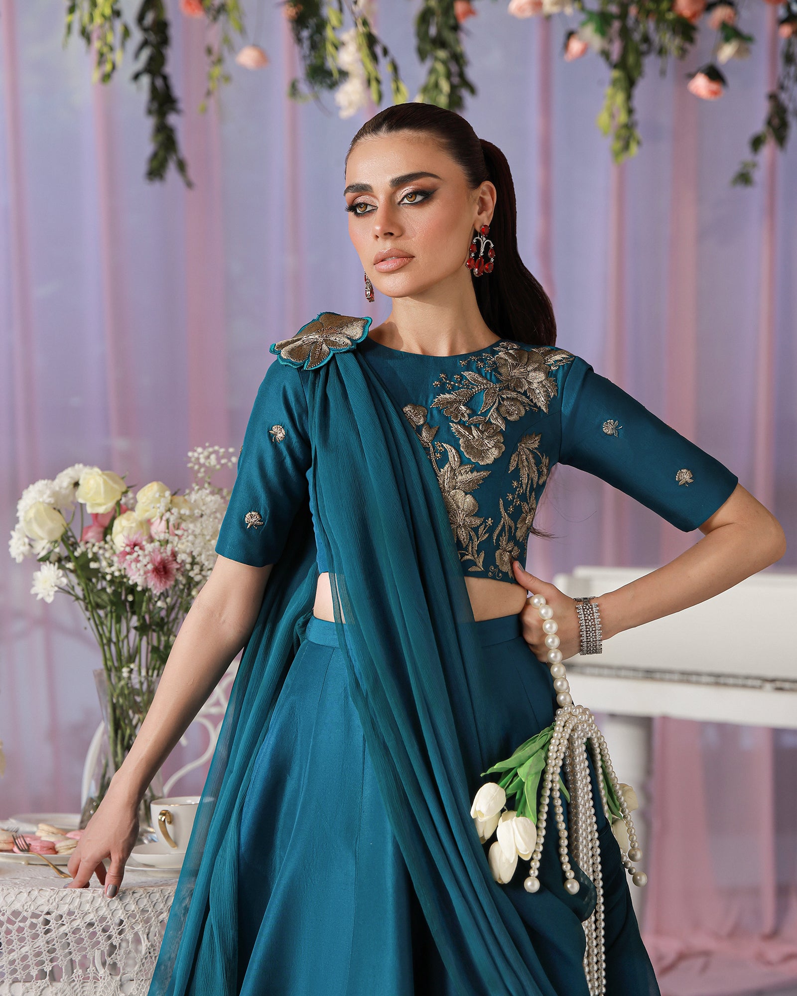 Crafted from pure raw silk in a deep teal hue, Maéra embodies fluid grace and refined sophistication. The intricately embroidered bodice and effortless drape evoke the calm strength of the modern muse — a seamless blend of timeless eastern artistry and contemporary poise.