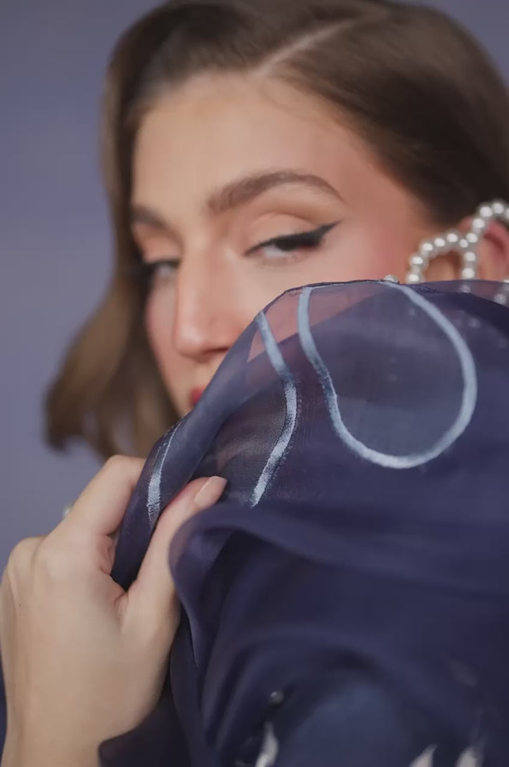 Draped in deep midnight blue and adorned with intricate ivory prints, Mahra reflects quiet luxury and refined grace. The flowing silhouette paired with a sheer printed dupatta creates an effortlessly elegant look — ideal for serene Ramadan evenings and elevated festive moments. Designed for the woman who carries poise with understated sophistication.