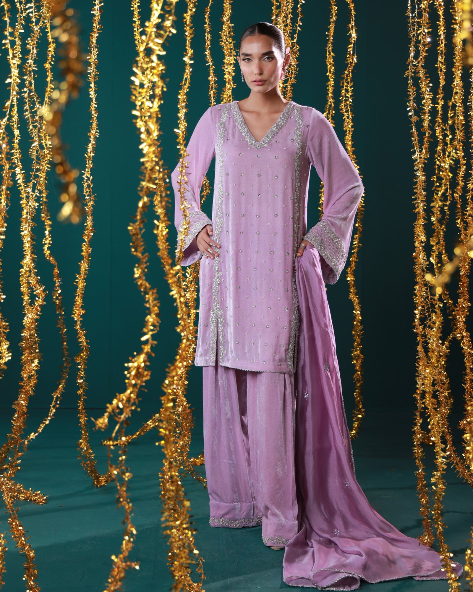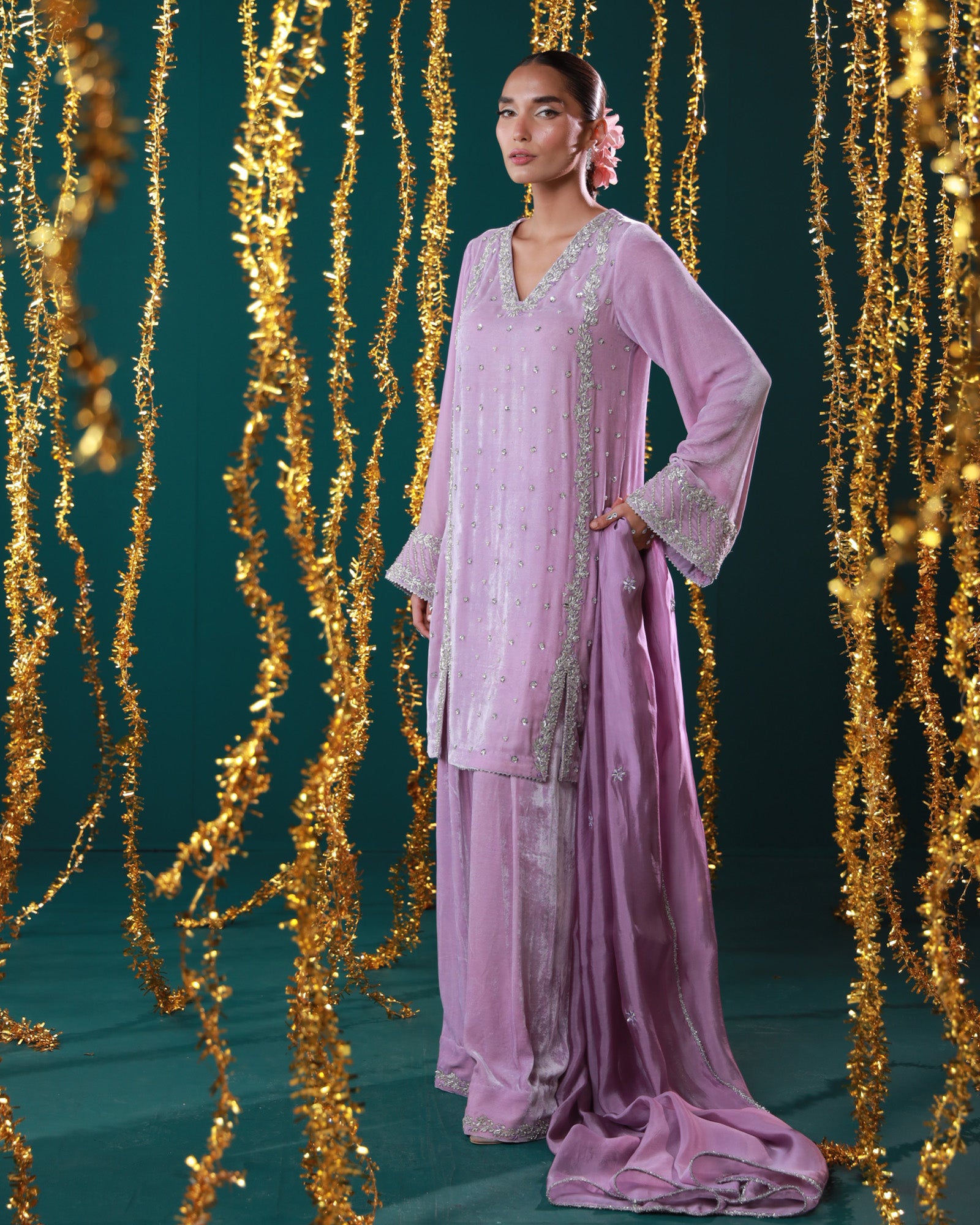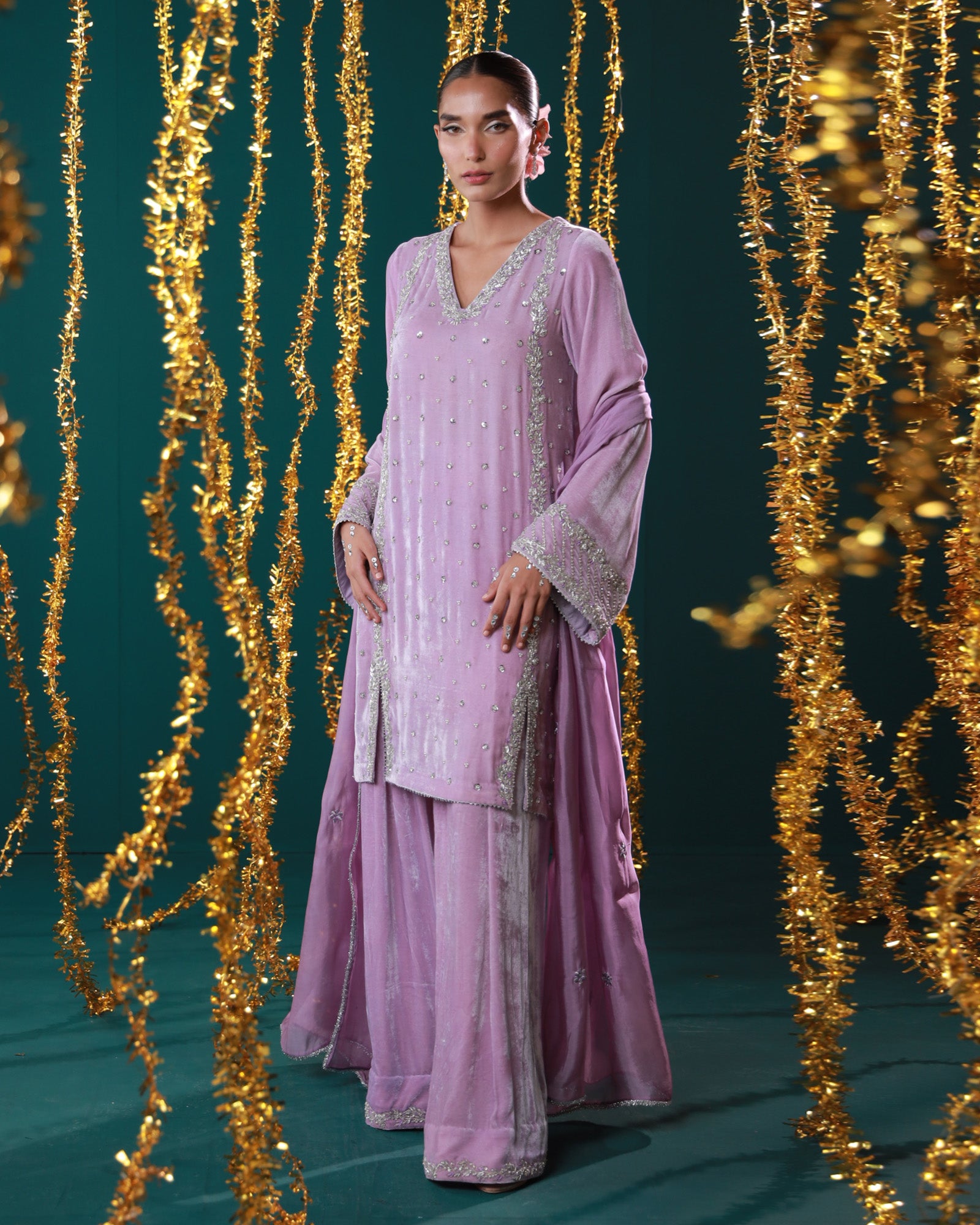 Lavender velvet set with silver detailing Soft as the first light of dawn, Mahru is crafted in plush lavender velvet, delicately embellished with silver work. The wide sleeves, graceful neckline, and flowy organza dupatta come together to create a look that's effortlessly elegant — perfect for winter gatherings and pastel soirées.