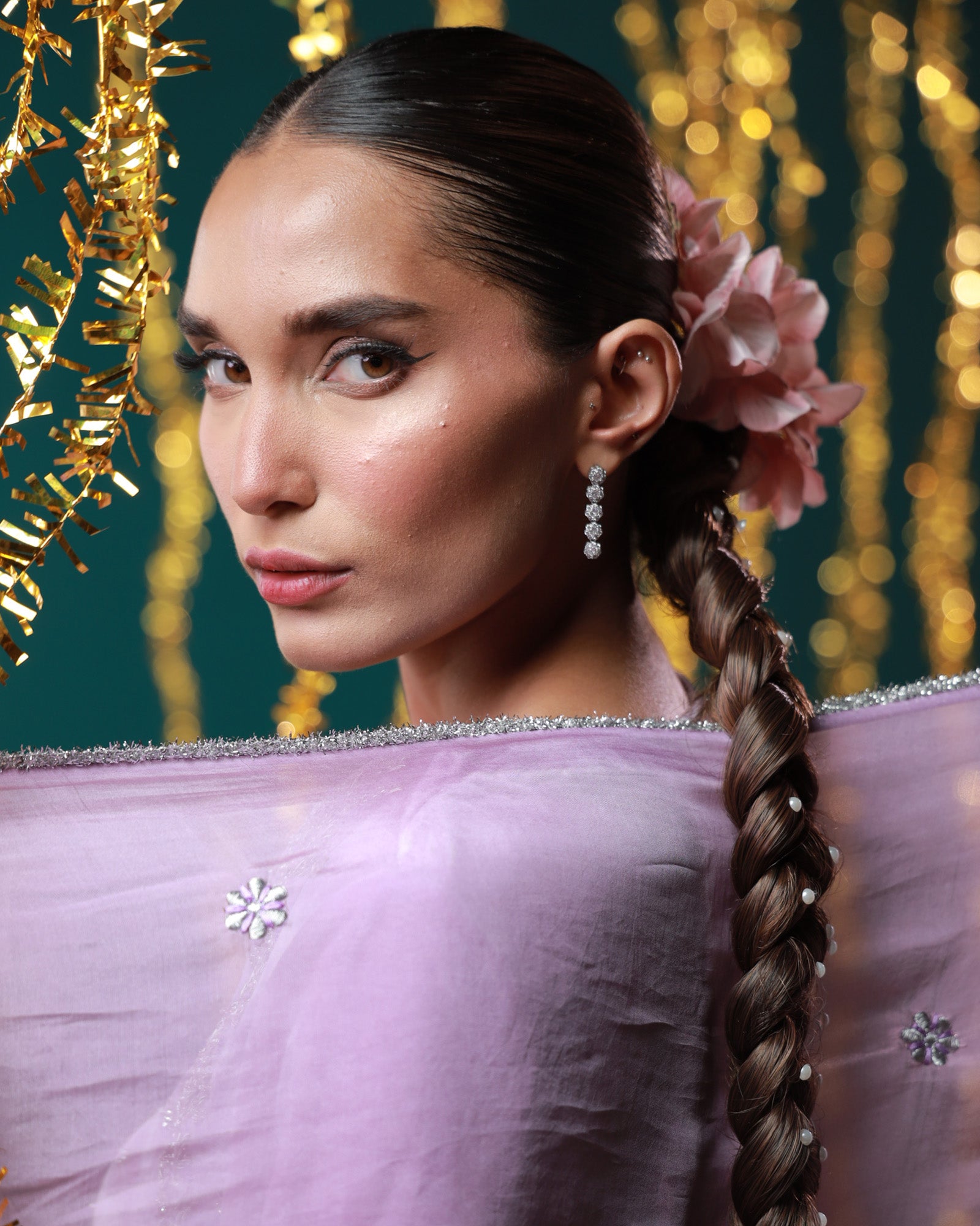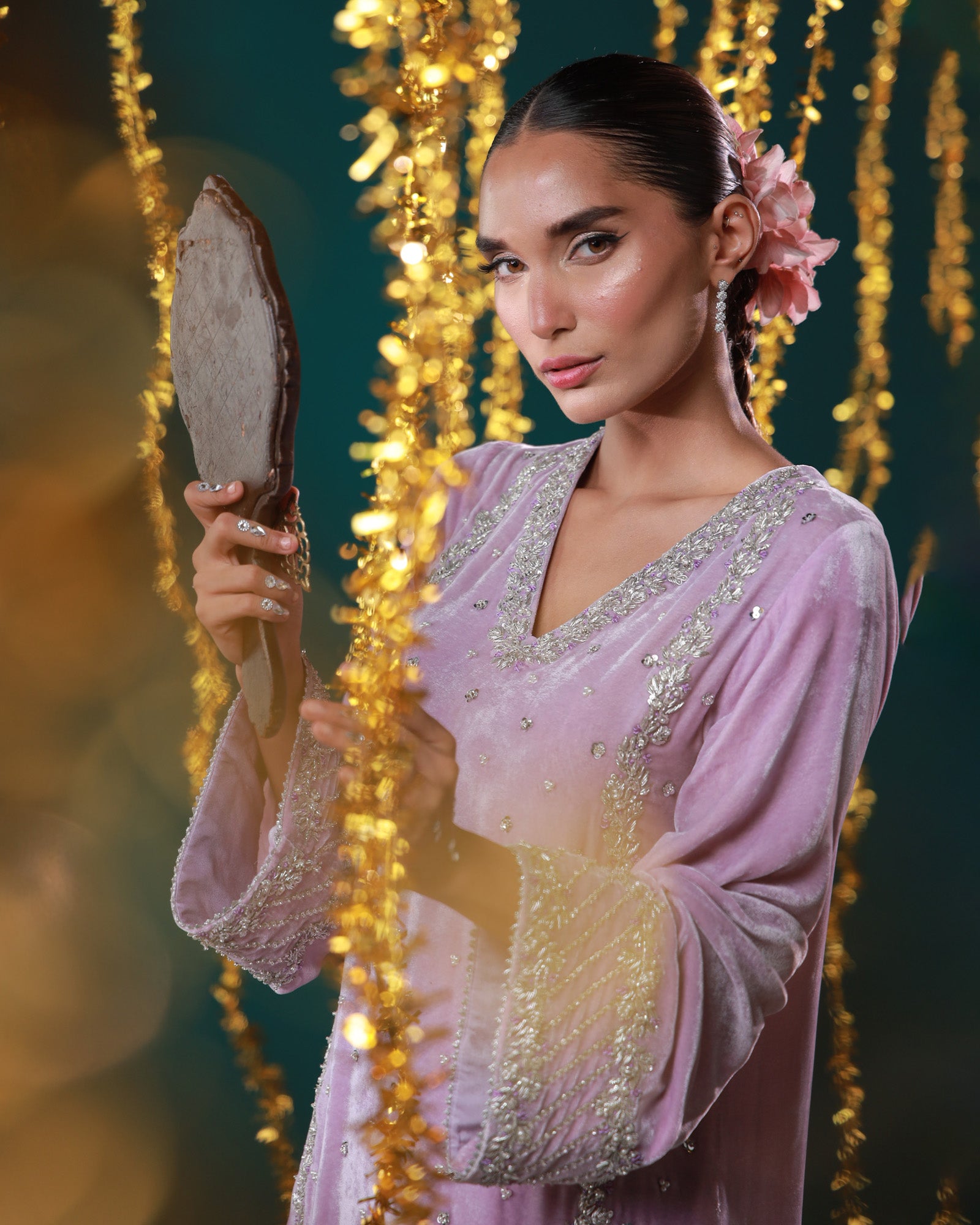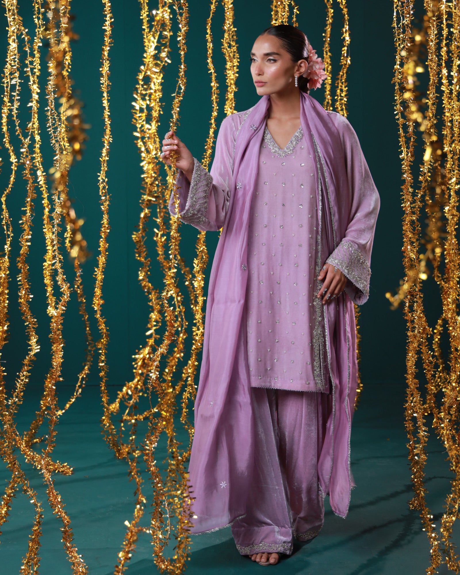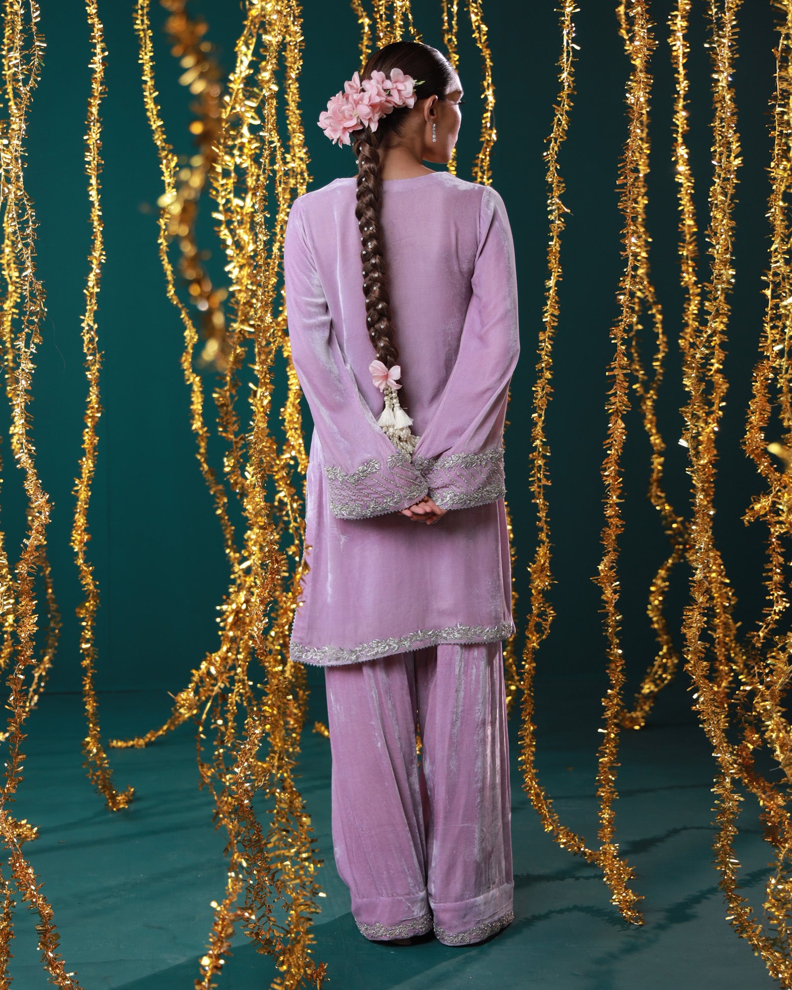 Lavender velvet set with silver detailing Soft as the first light of dawn, Mahru is crafted in plush lavender velvet, delicately embellished with silver work. The wide sleeves, graceful neckline, and flowy organza dupatta come together to create a look that's effortlessly elegant — perfect for winter gatherings and pastel soirées.