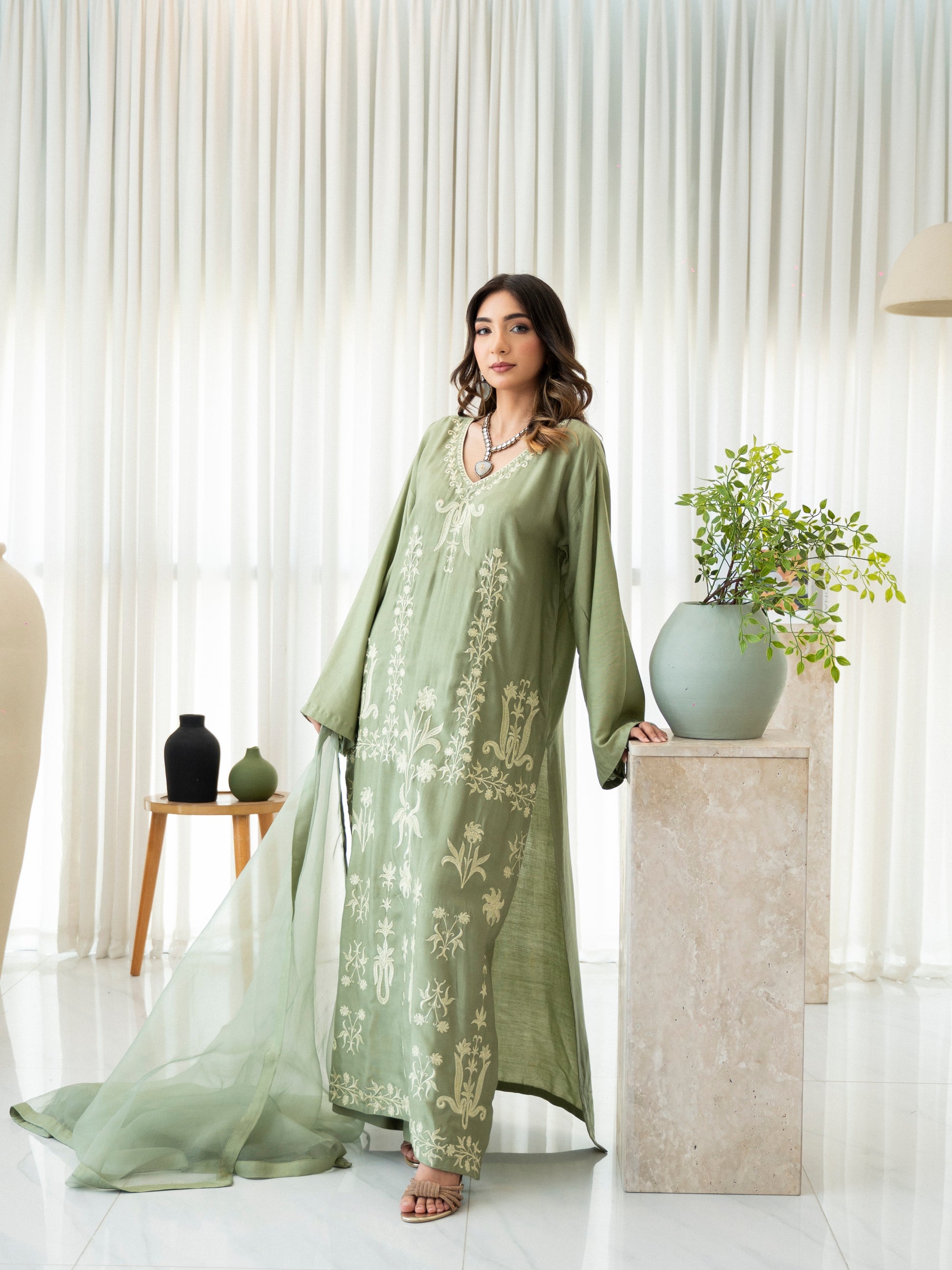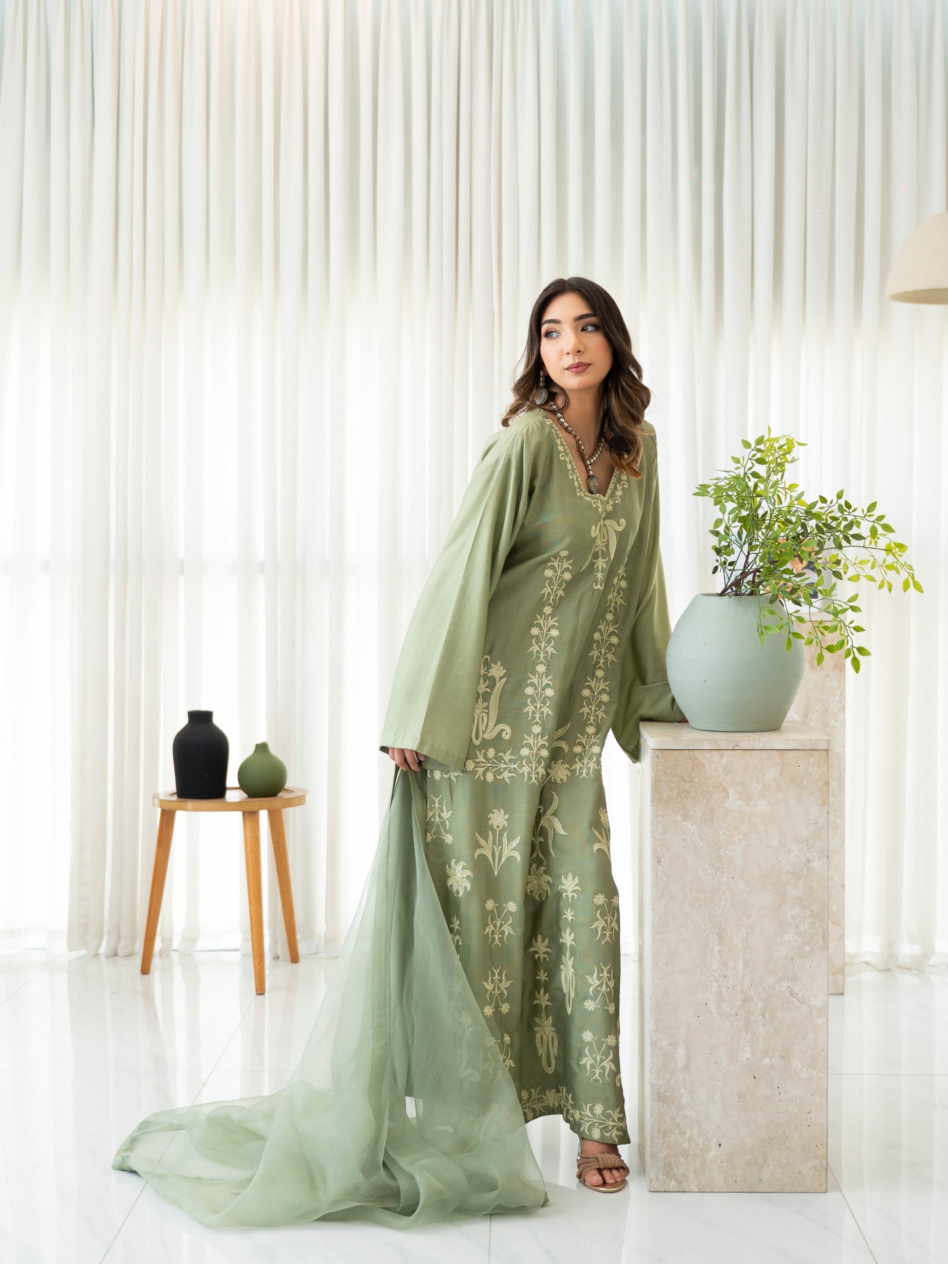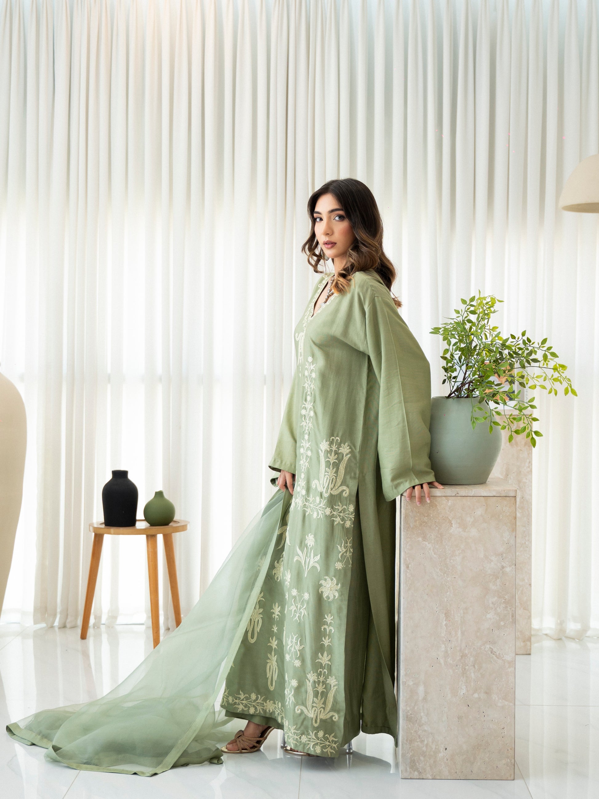 Sage Elysia is an ode to graceful minimalism—rendered in a soft sage hue and adorned with embroidery that blooms across a breezy khadi net canvas. This 3-piece ensemble flows effortlessly, offering timeless elegance and ethereal charm for the modern woman. Ideal for garden soirées or daytime festivities where subtlety speaks louder than sparkle
