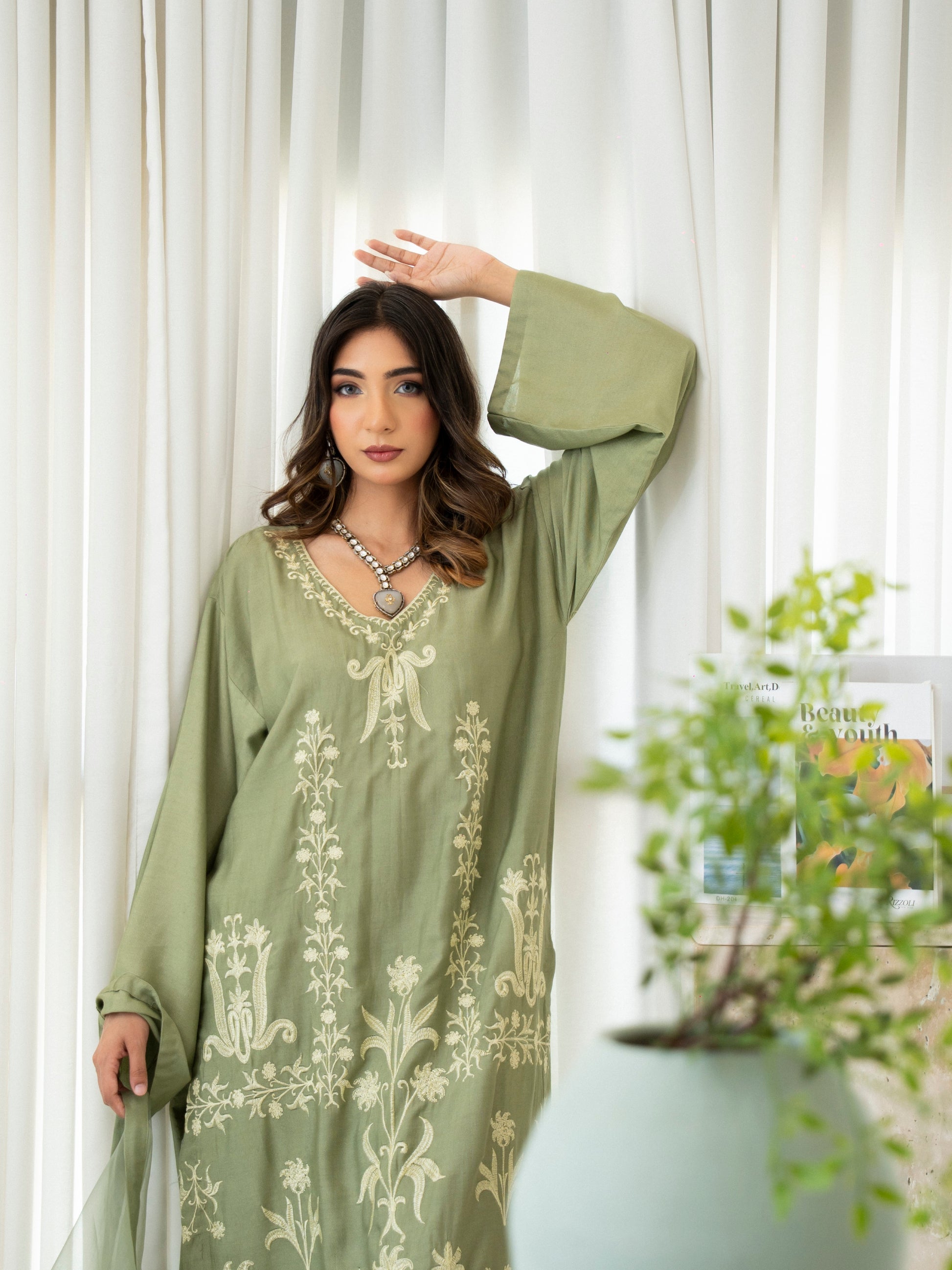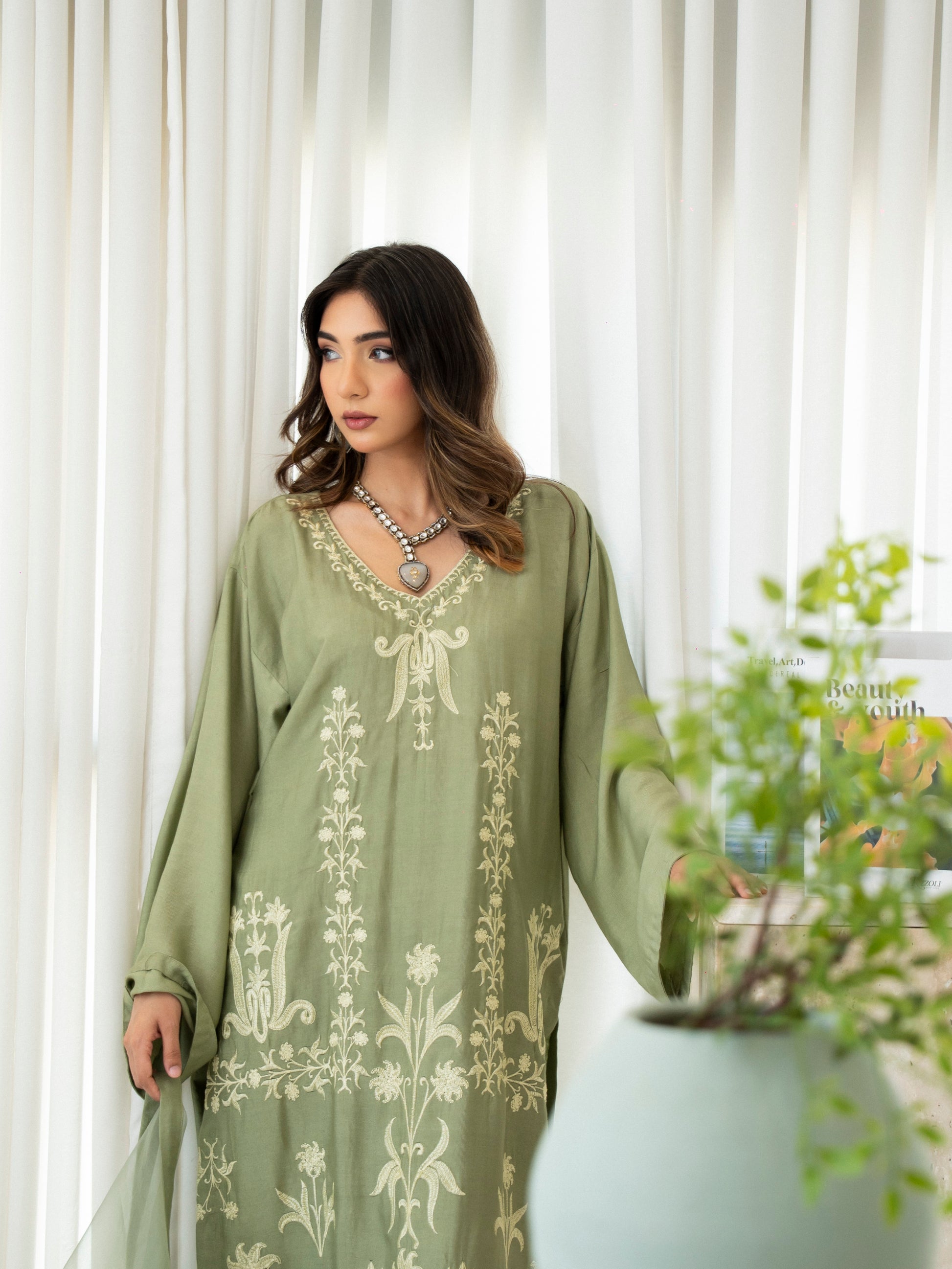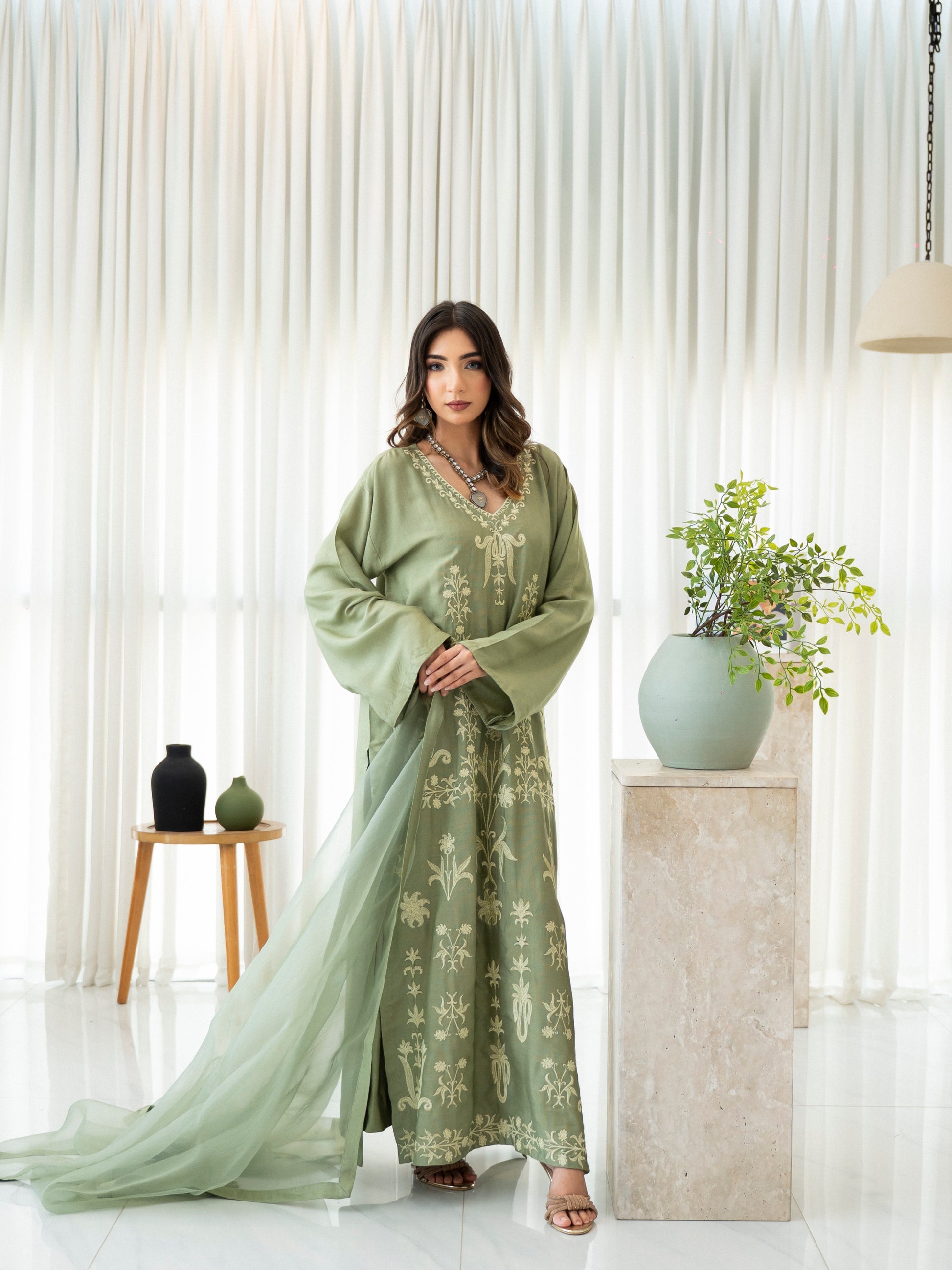 Sage Elysia is an ode to graceful minimalism—rendered in a soft sage hue and adorned with embroidery that blooms across a breezy khadi net canvas. This 3-piece ensemble flows effortlessly, offering timeless elegance and ethereal charm for the modern woman. Ideal for garden soirées or daytime festivities where subtlety speaks louder than sparkle