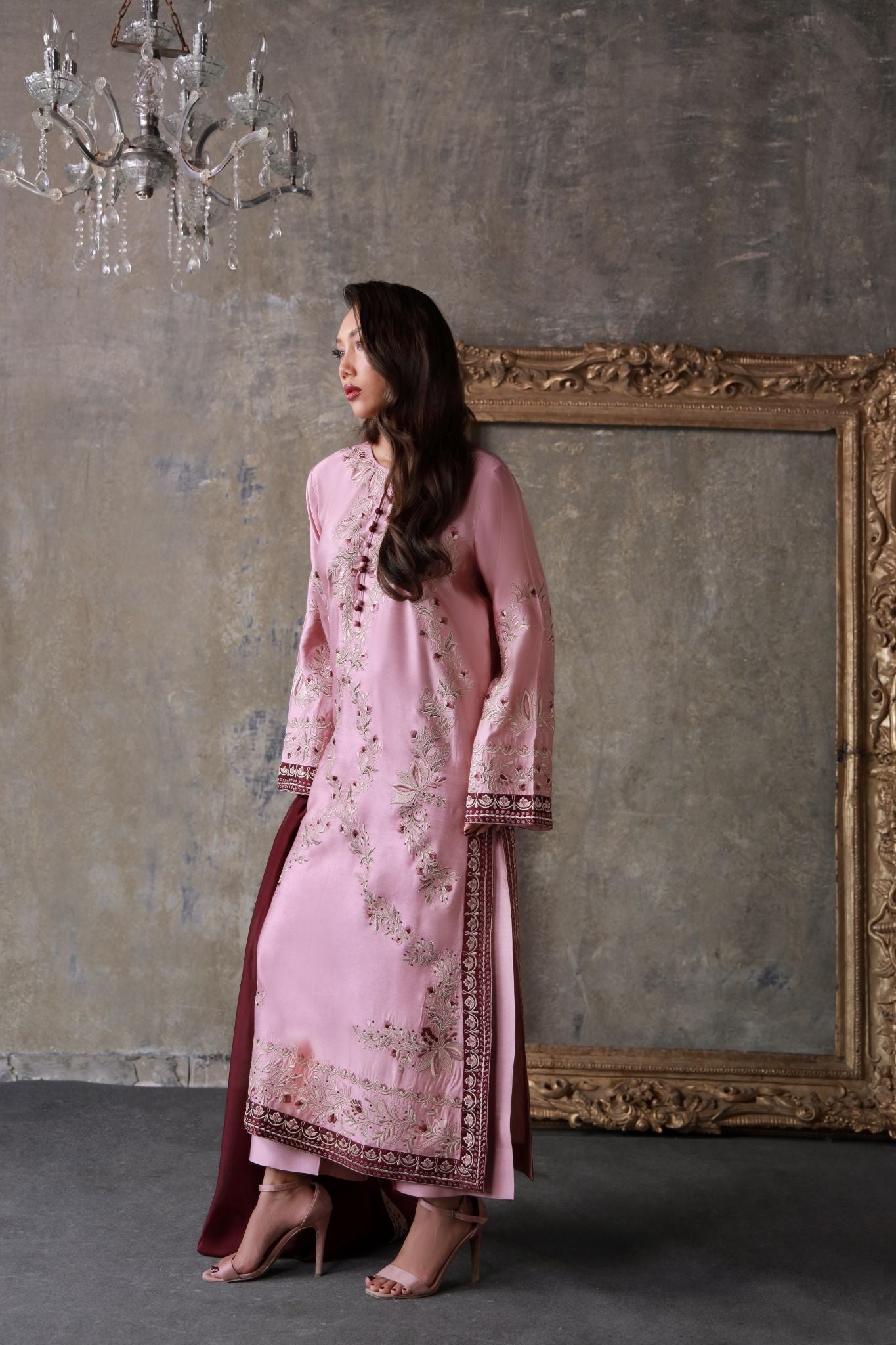 A soft antique rose canvas adorned with delicate floral embroidery in deep maroon and gold, paired with an ethereal organza dupatta for an opulent finish.