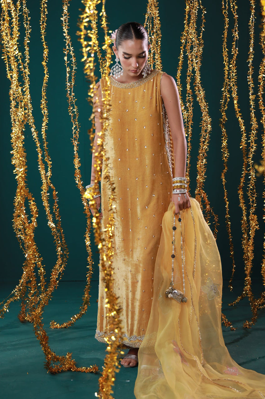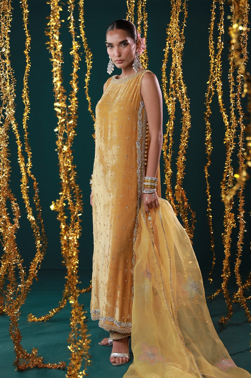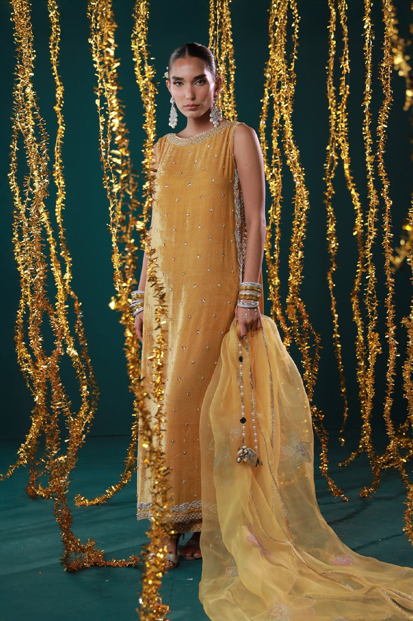 Mehtab is a luminous yellow velvet creation that captures the warmth of celebration and the softness of moonlight. Embellished with delicate work and paired with a breezy embroidered dupatta, this design brings an effortless glow to mehndis, daytime dholkis, and festive winter gatherings.