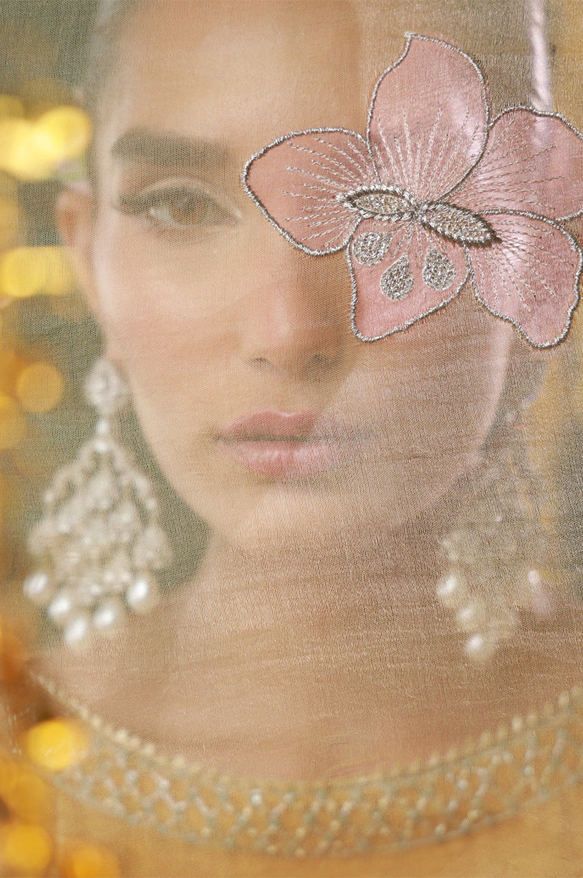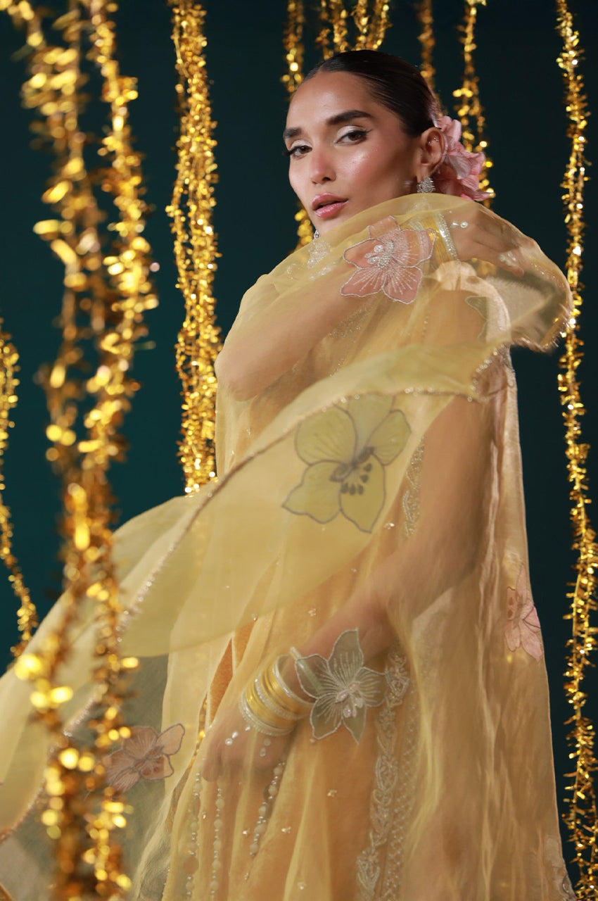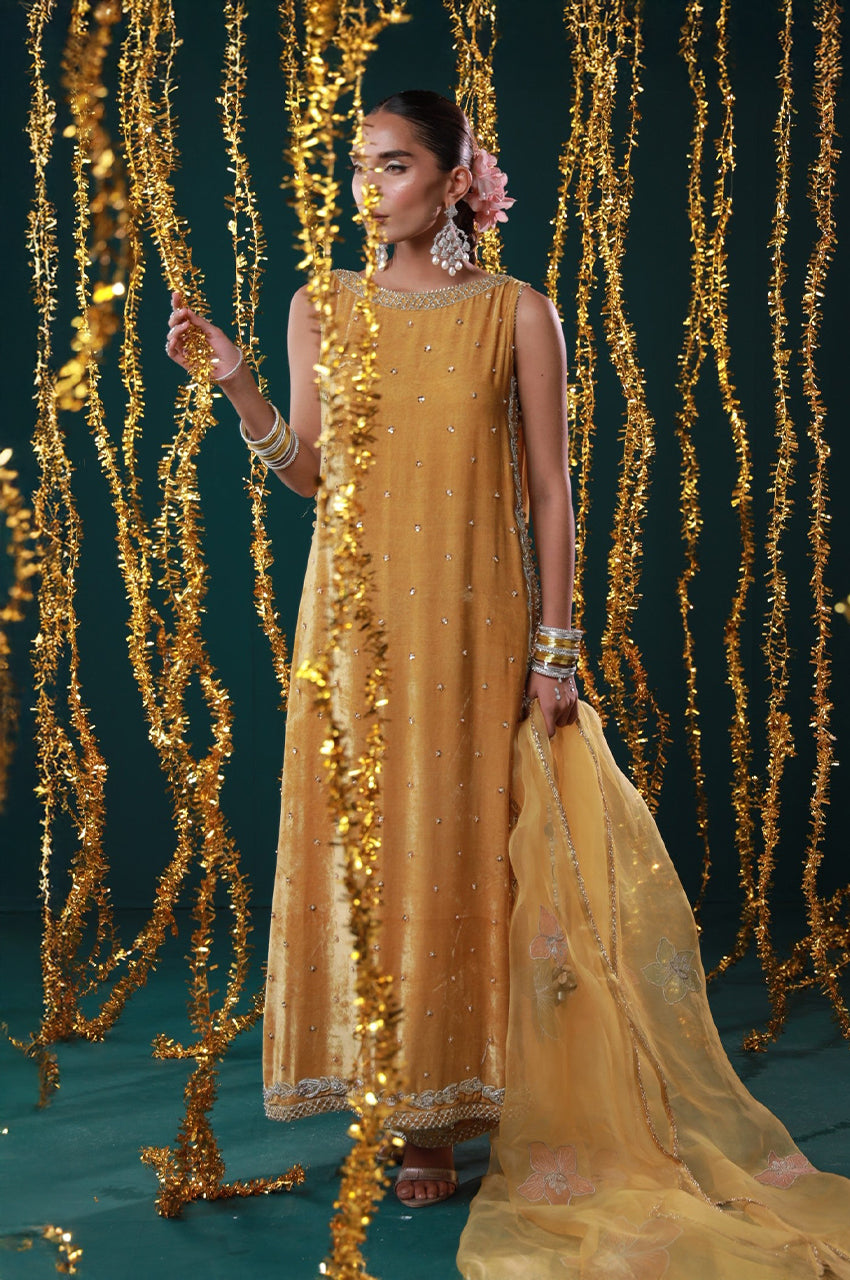 Mehtab is a luminous yellow velvet creation that captures the warmth of celebration and the softness of moonlight. Embellished with delicate work and paired with a breezy embroidered dupatta, this design brings an effortless glow to mehndis, daytime dholkis, and festive winter gatherings.