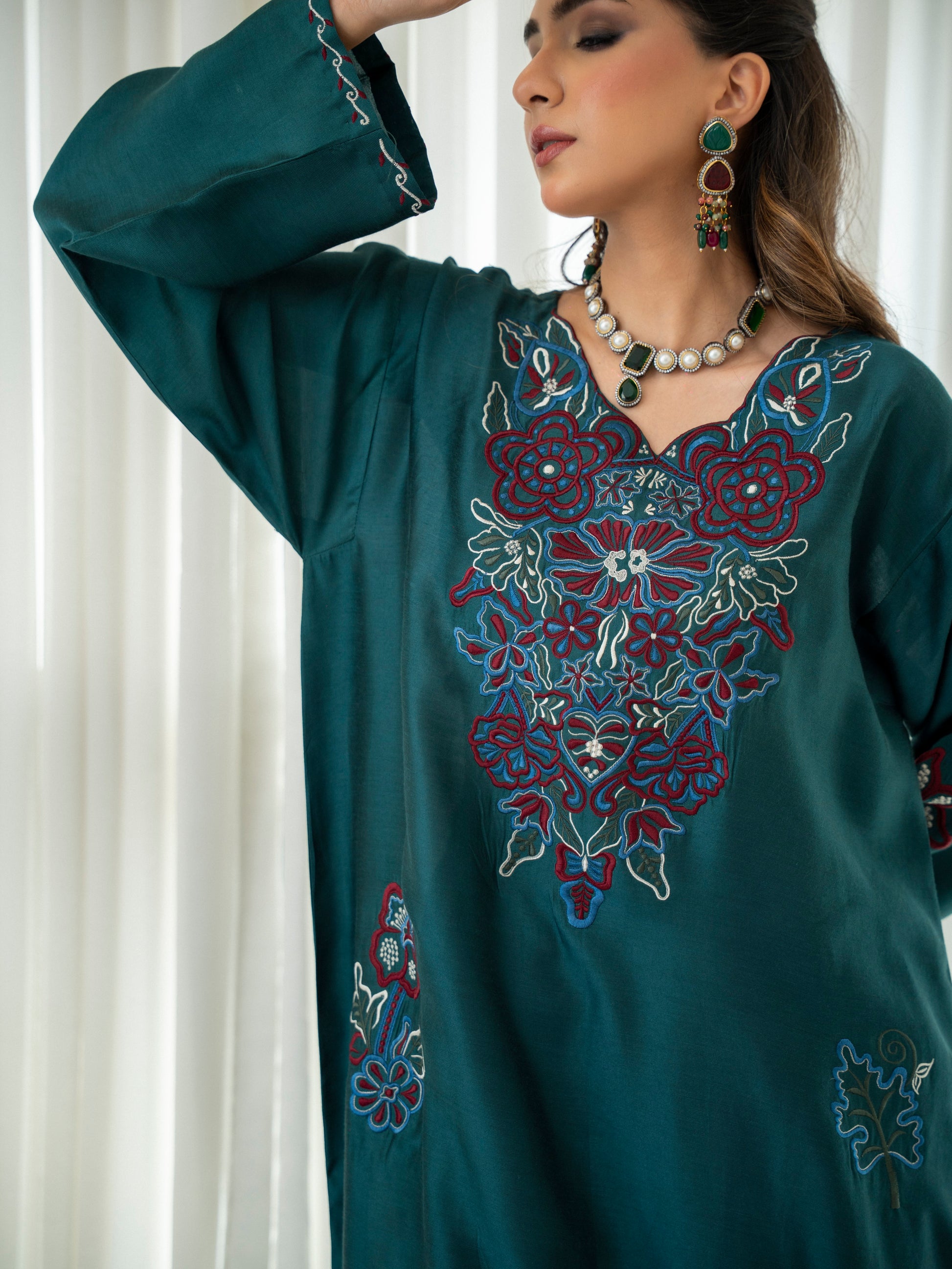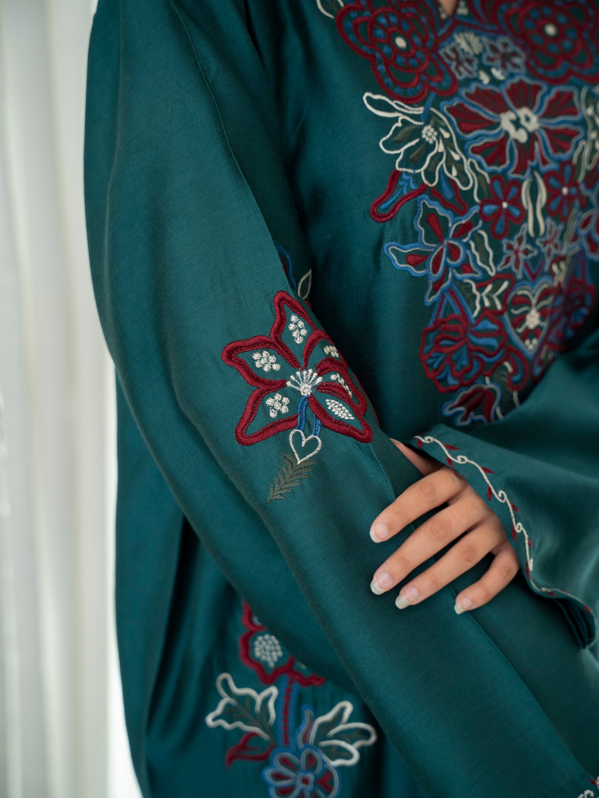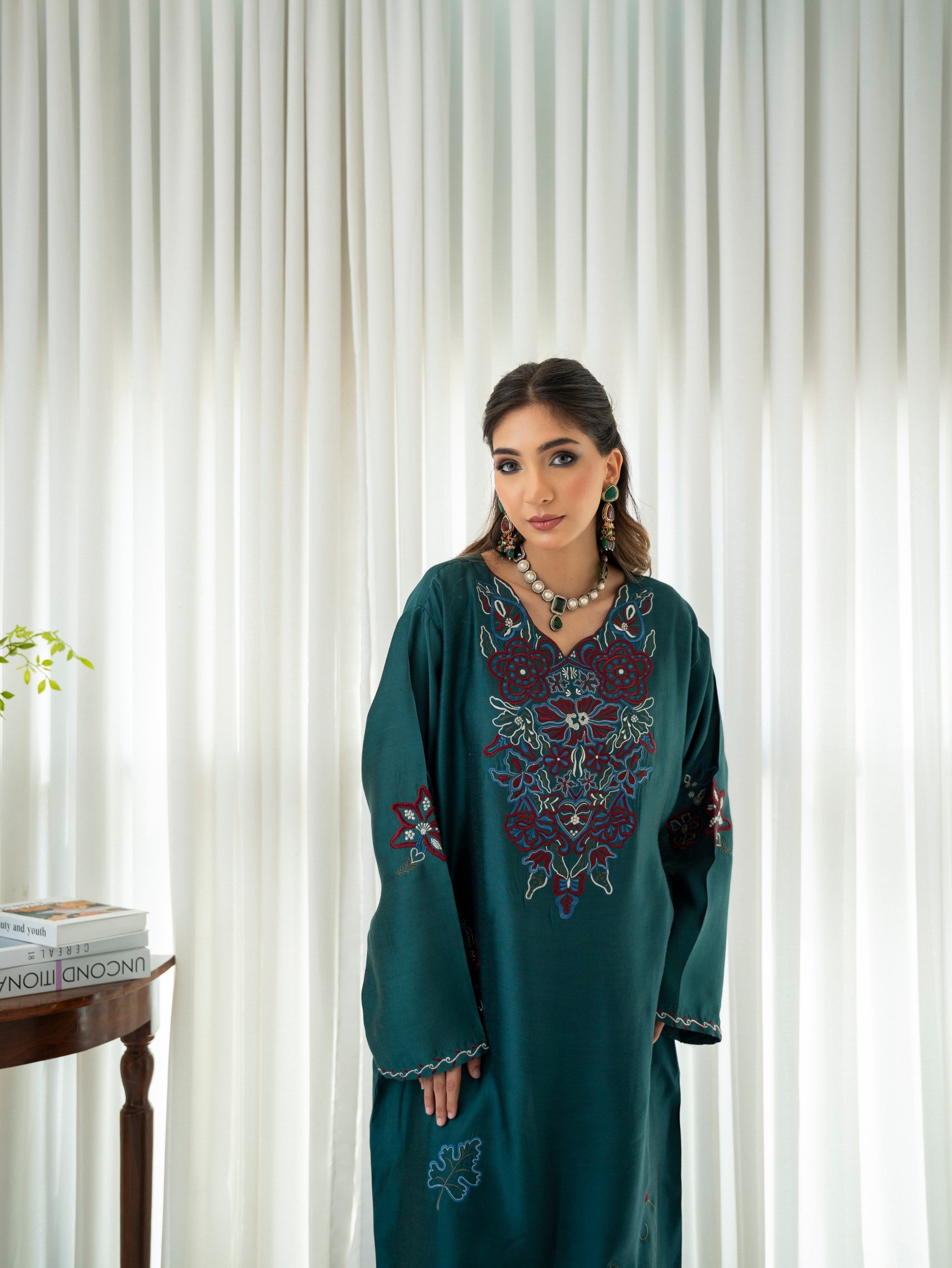 Midnight Garden captures the mystery of twilight in a deep teal hue adorned with enchanting floral embroidery in rich tones of maroon and ivory. Cut from premium silk, the silhouette flows with quiet elegance, making this 2-piece ensemble perfect for refined evening affairs or intimate festive moments. A blend of charm and confidence rooted in nature’s poetry