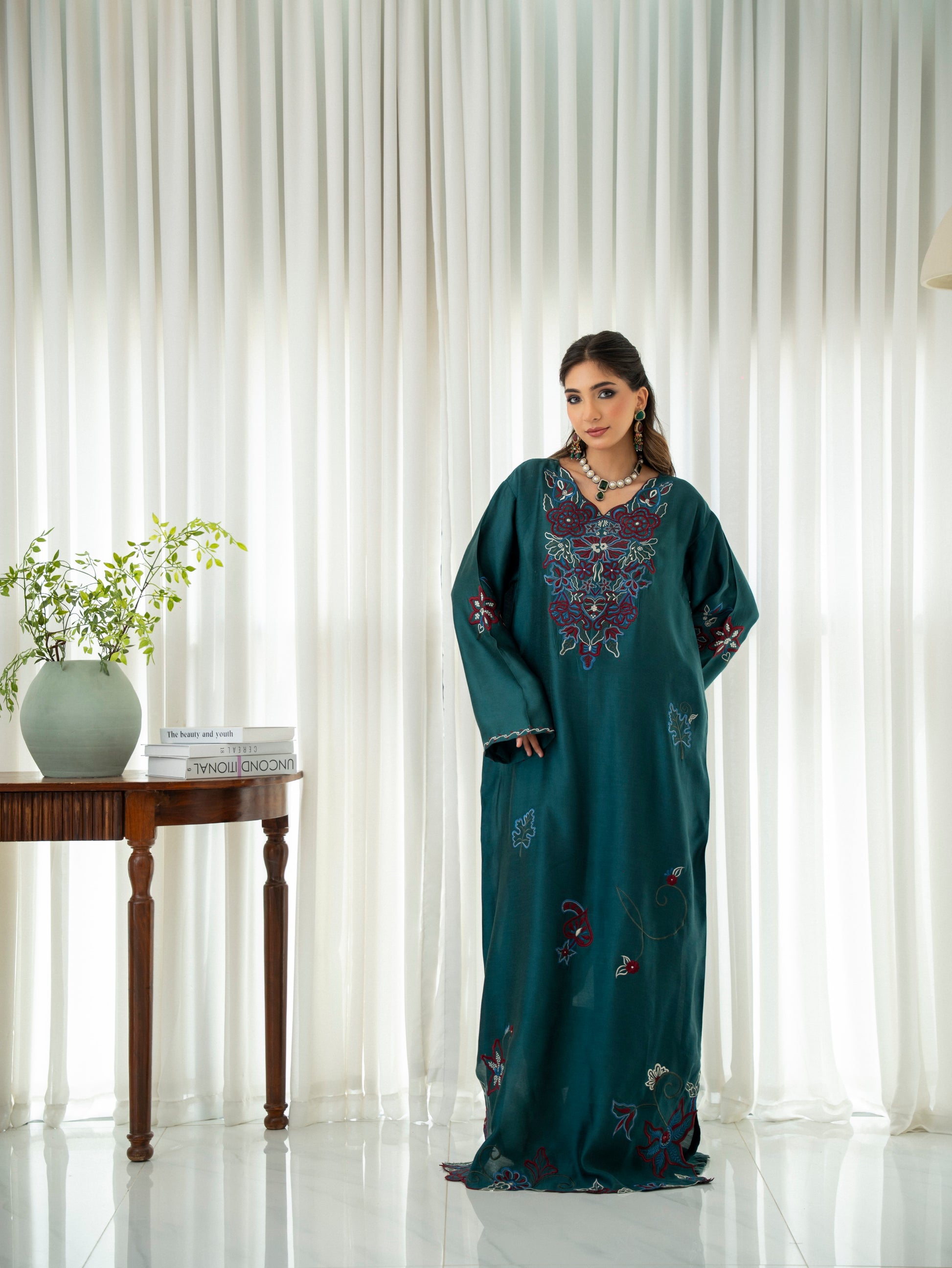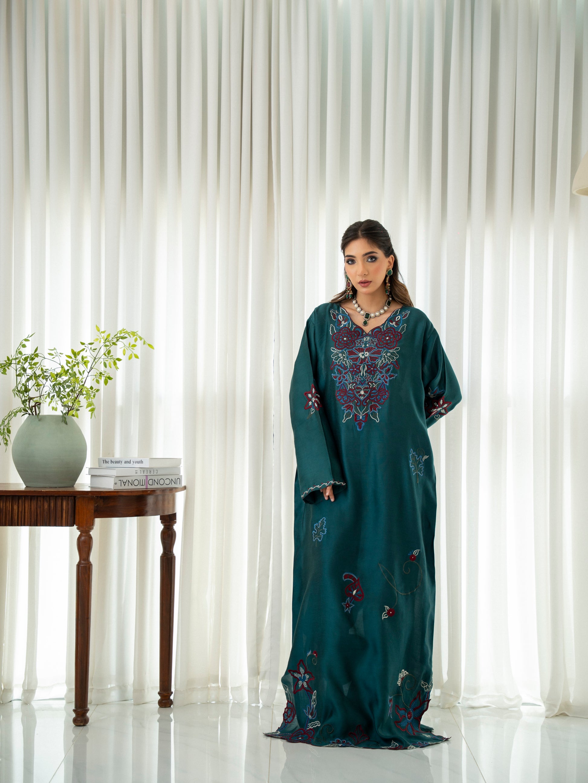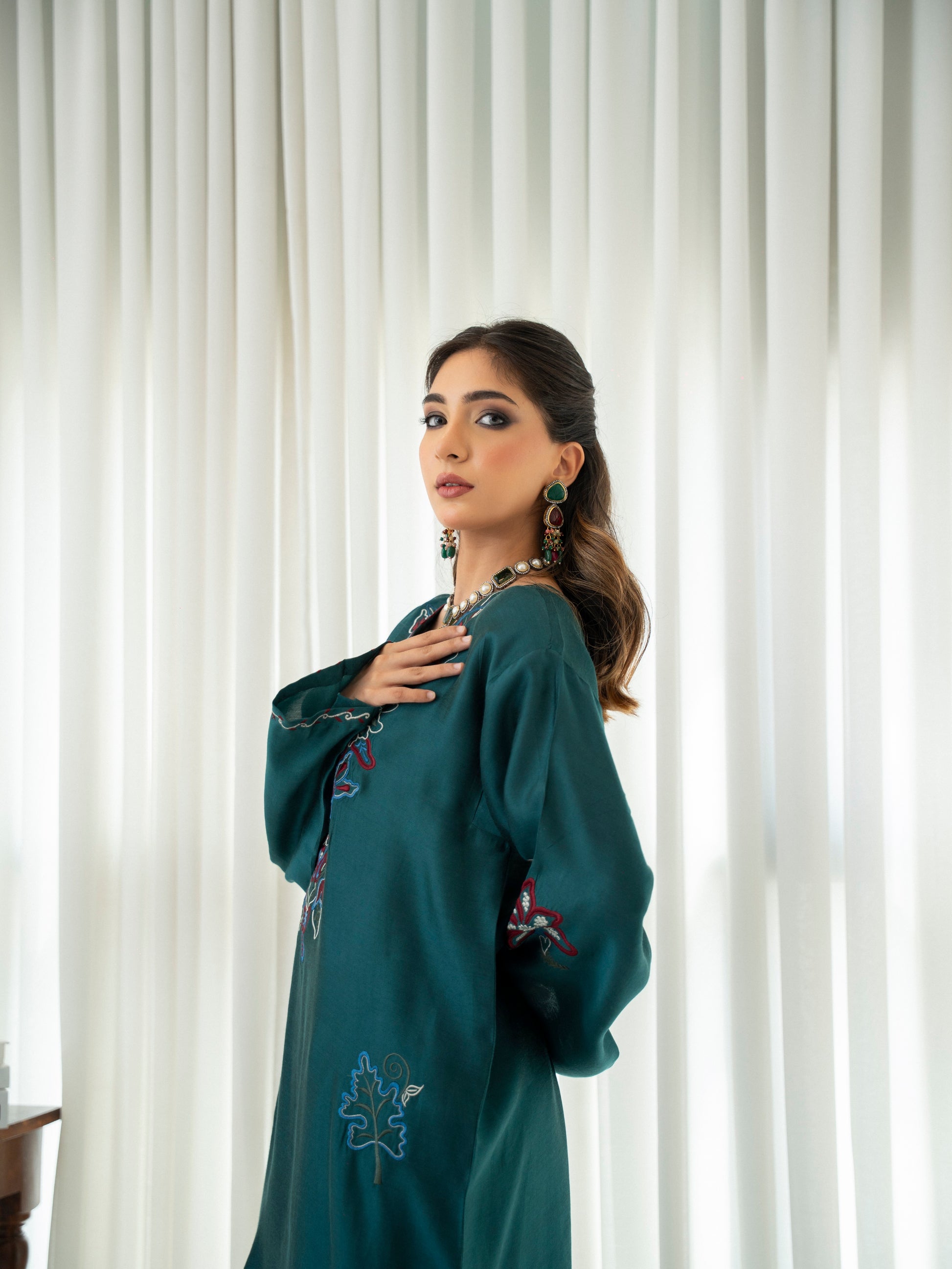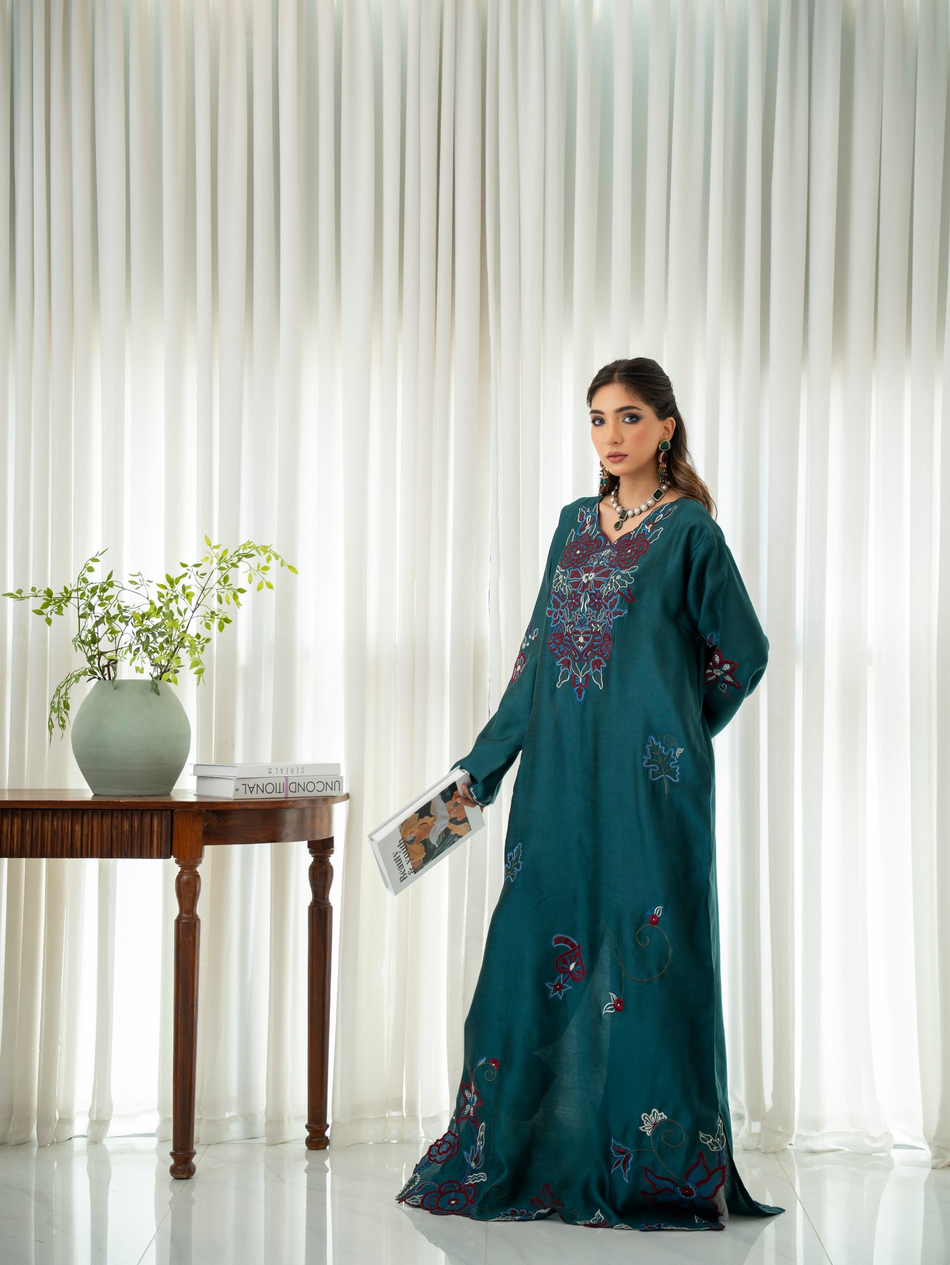 Midnight Garden captures the mystery of twilight in a deep teal hue adorned with enchanting floral embroidery in rich tones of maroon and ivory. Cut from premium silk, the silhouette flows with quiet elegance, making this 2-piece ensemble perfect for refined evening affairs or intimate festive moments. A blend of charm and confidence rooted in nature’s poetry