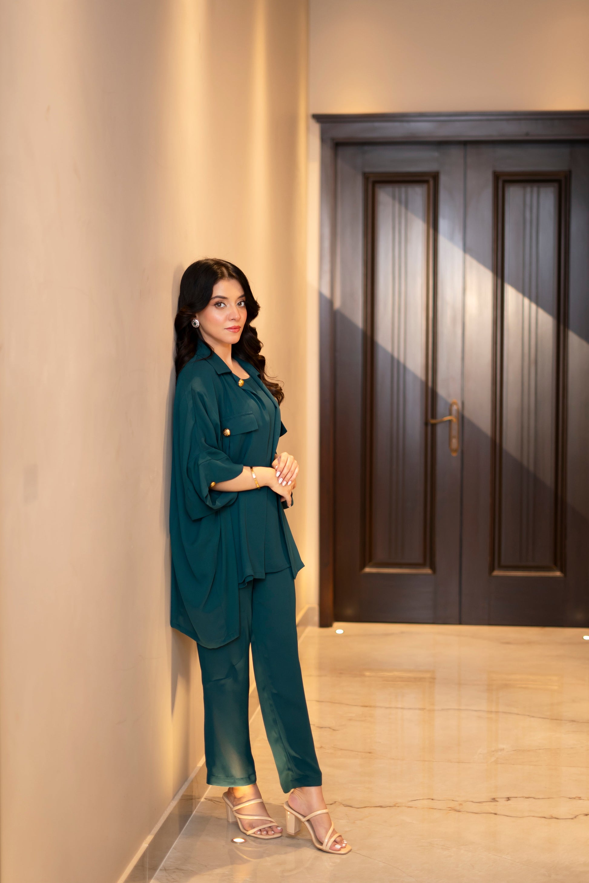 Refined yet effortlessly chic, the Emerald Luxe Co-Ord Set is the perfect blend of elegance and comfort. Crafted from premium georgette, this deep emerald-hued ensemble features a flowy button-down top with statement gold accents, paired with tailored ankle-length pants for a polished yet relaxed silhouette. The loose, airy fit ensures all-day comfort, while the structured details add a touch of sophistication. Ideal for both casual and formal settings, this versatile set exudes timeless charm, making it a must-have for the modern woman’s wardrobe.