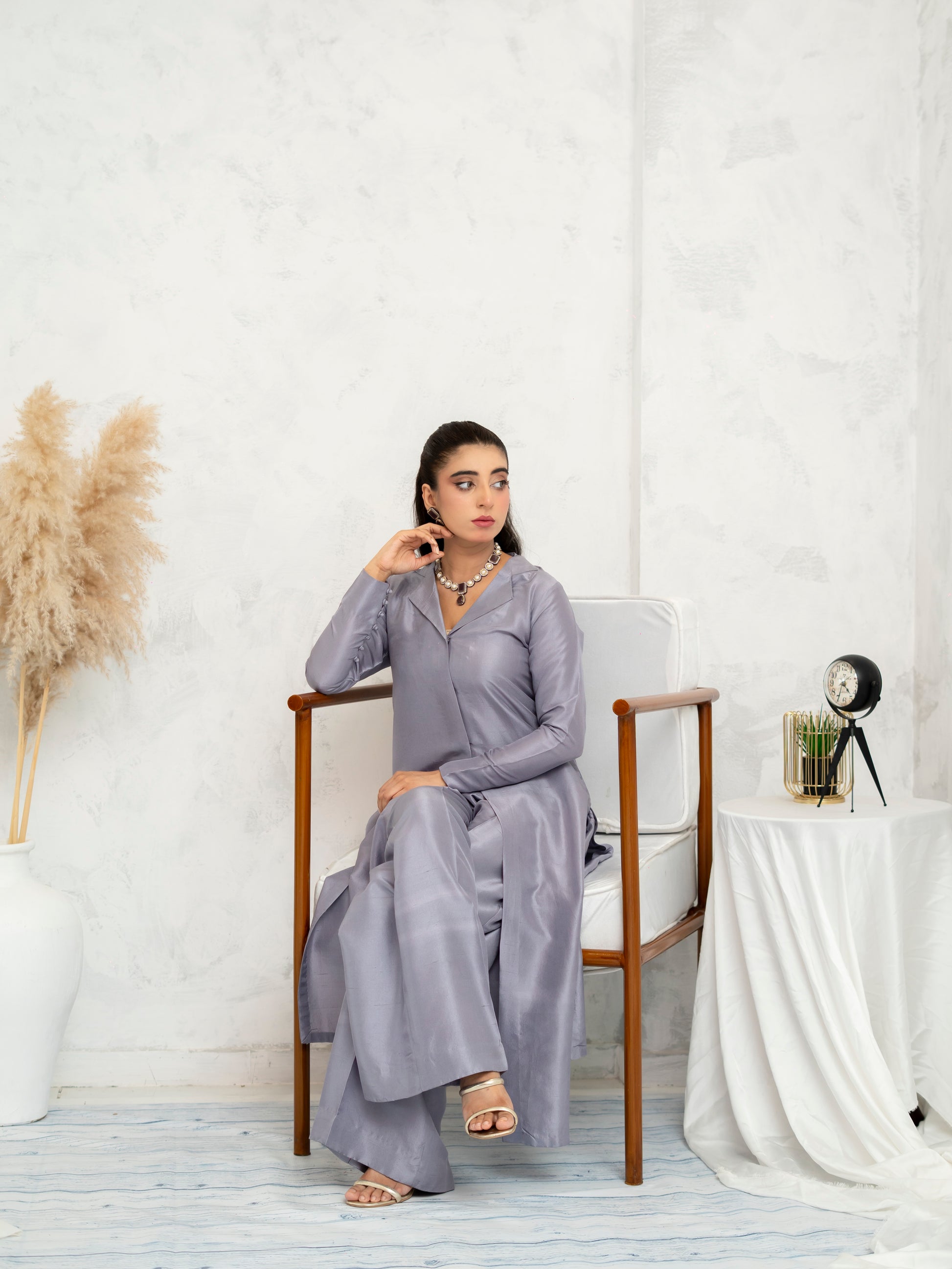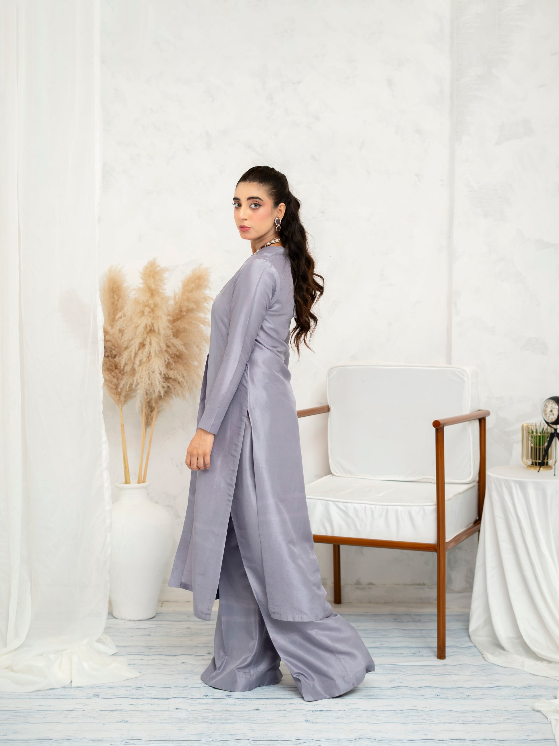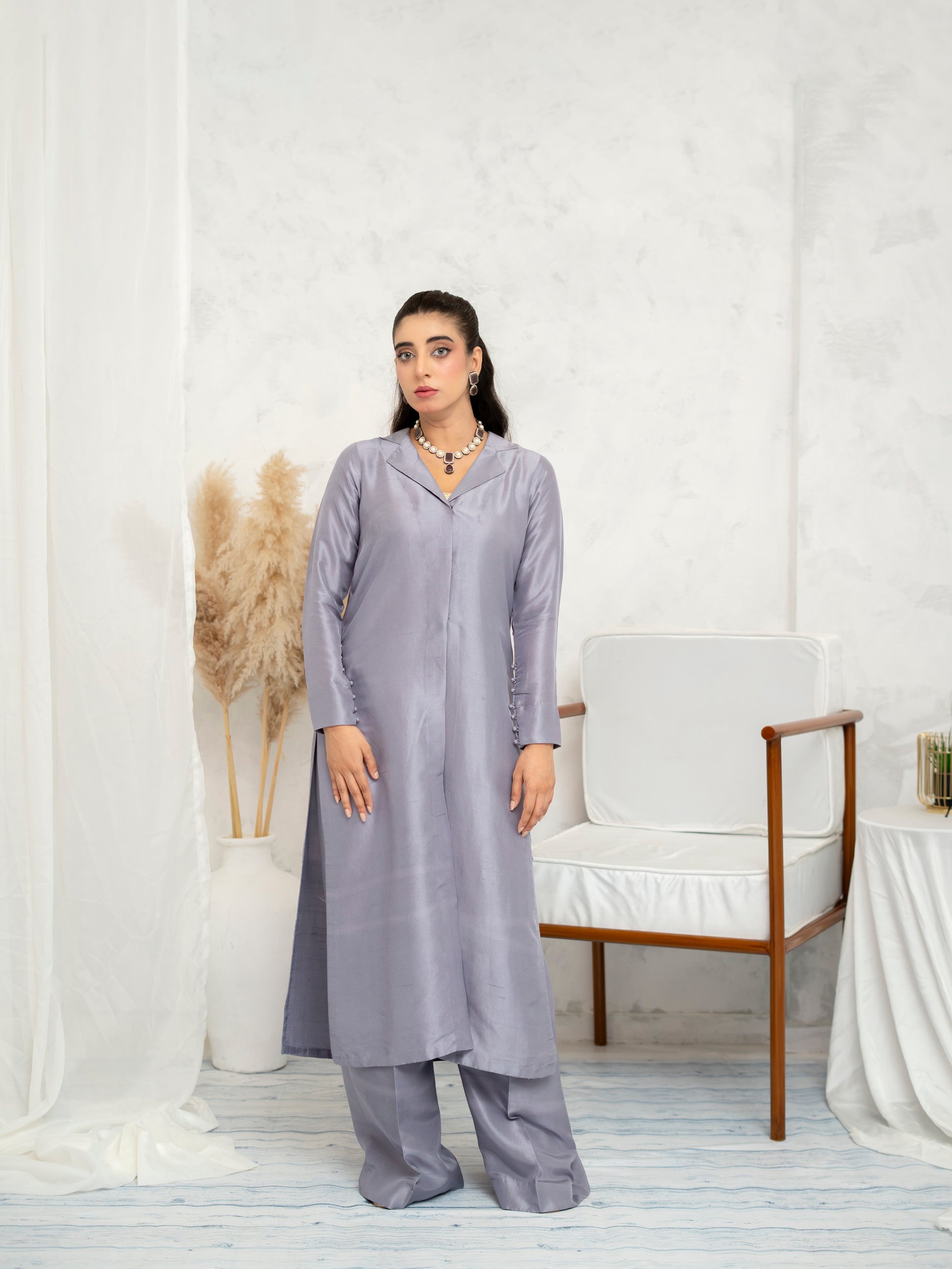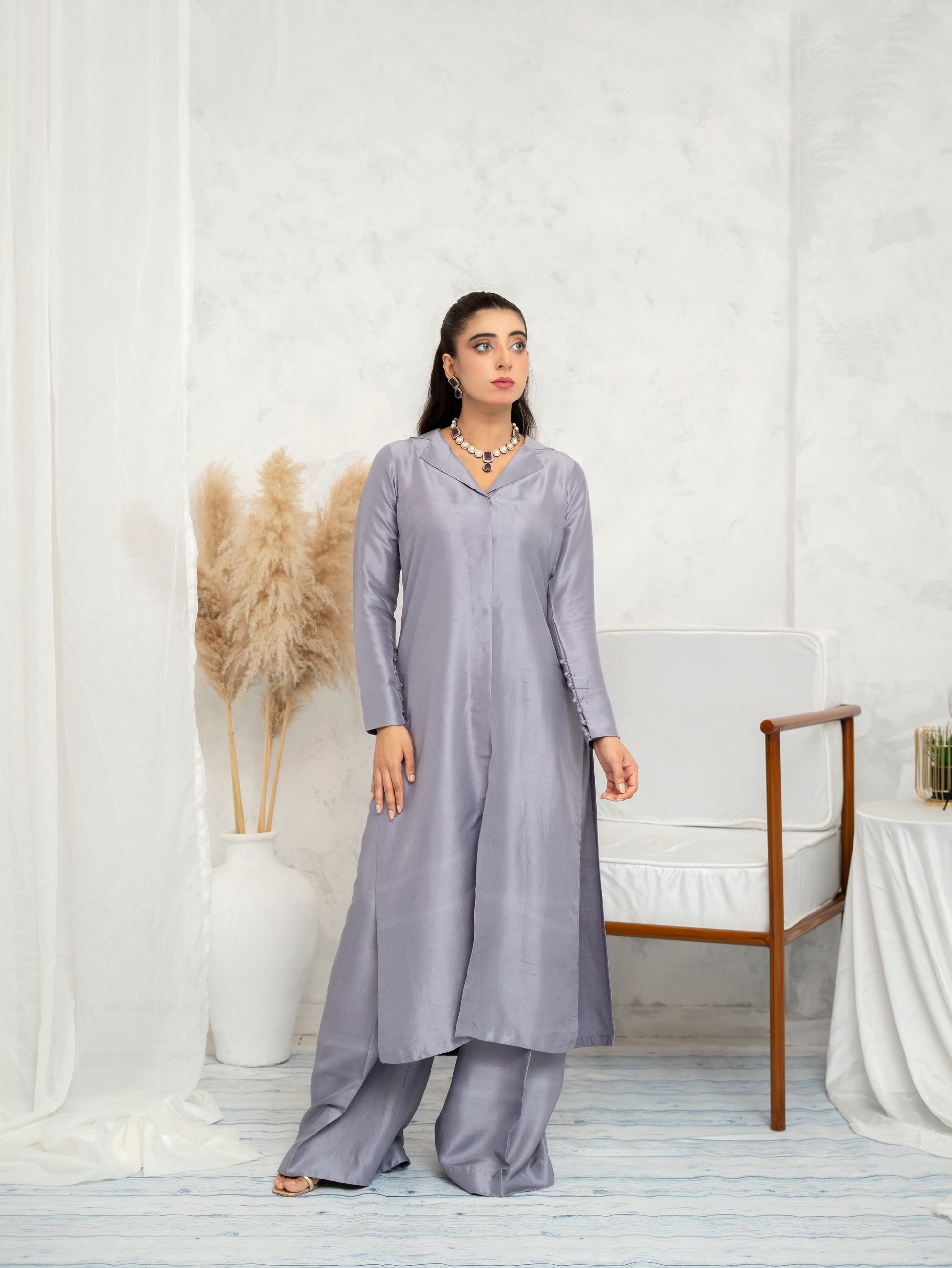 Understated and ethereal, Moonlit Silver brings modern minimalism to life. Draped in a cool dove-grey hue, the kurta is tailored with soft pleats and fabric buttons at the cuffs, exuding effortless polish. Paired with classic trousers, the look flows with grace and confidence. Ideal for formal luncheons, Eid gatherings, or evening elegance, this ensemble is sophistication redefined.