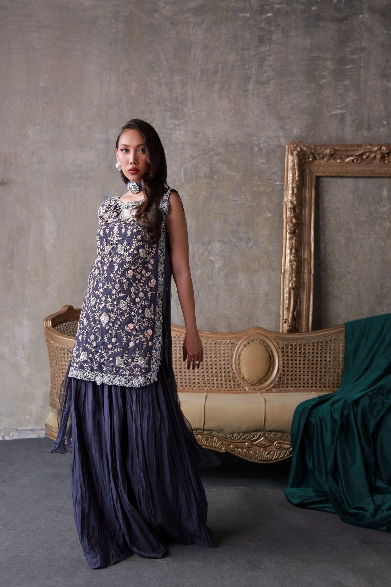 MOONLIT VINE captures an ethereal elegance in shades of dusky periwinkle and petal blush. The premium silk shirt is intricately hand-embroidered with floral vines and soft pastel threads, giving it a timeless garden-glow charm. Paired with a flowing crushed silk lehenga and dopatta , this look merges romance and regality — perfect for soirées under starlit skies