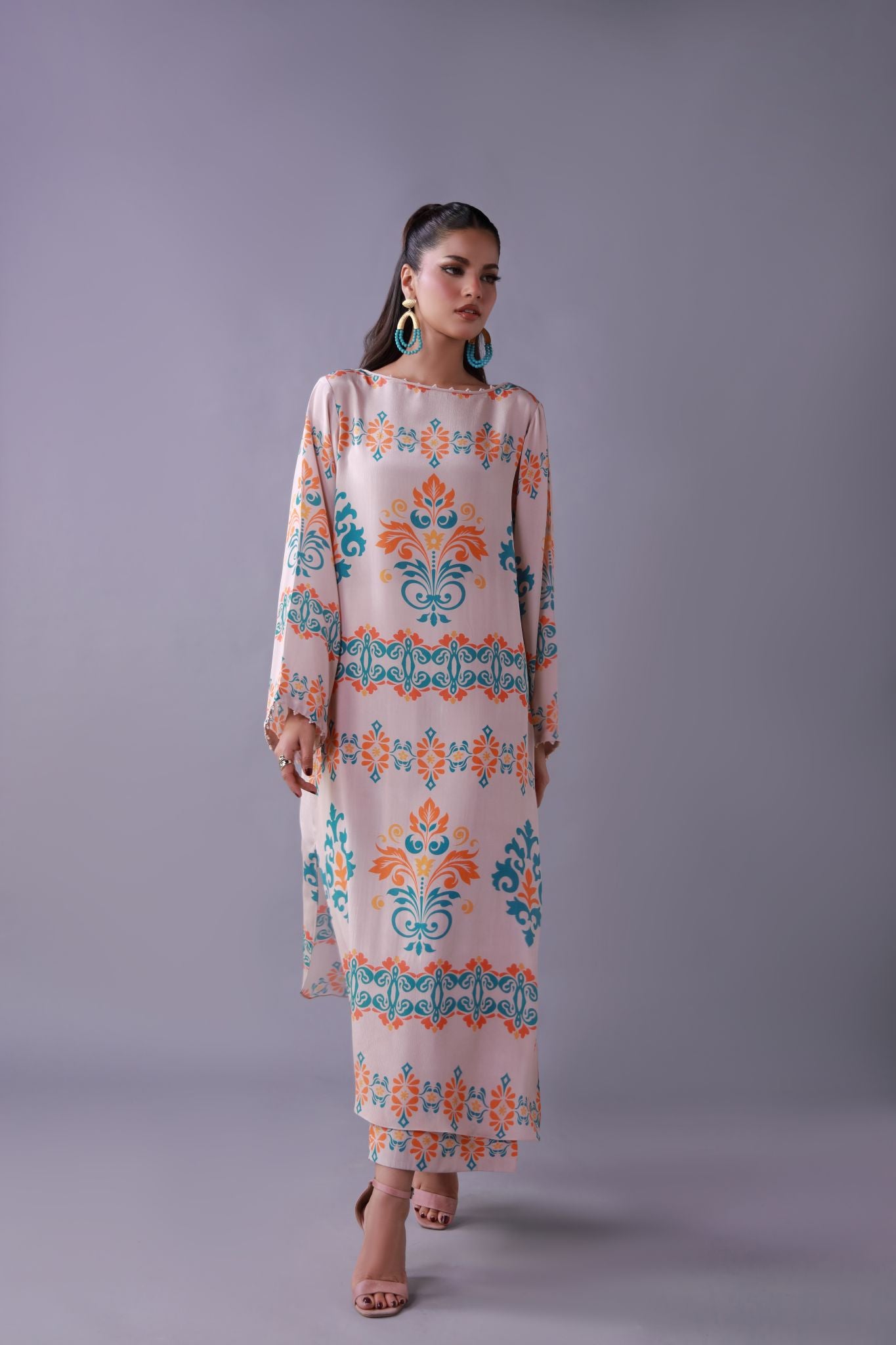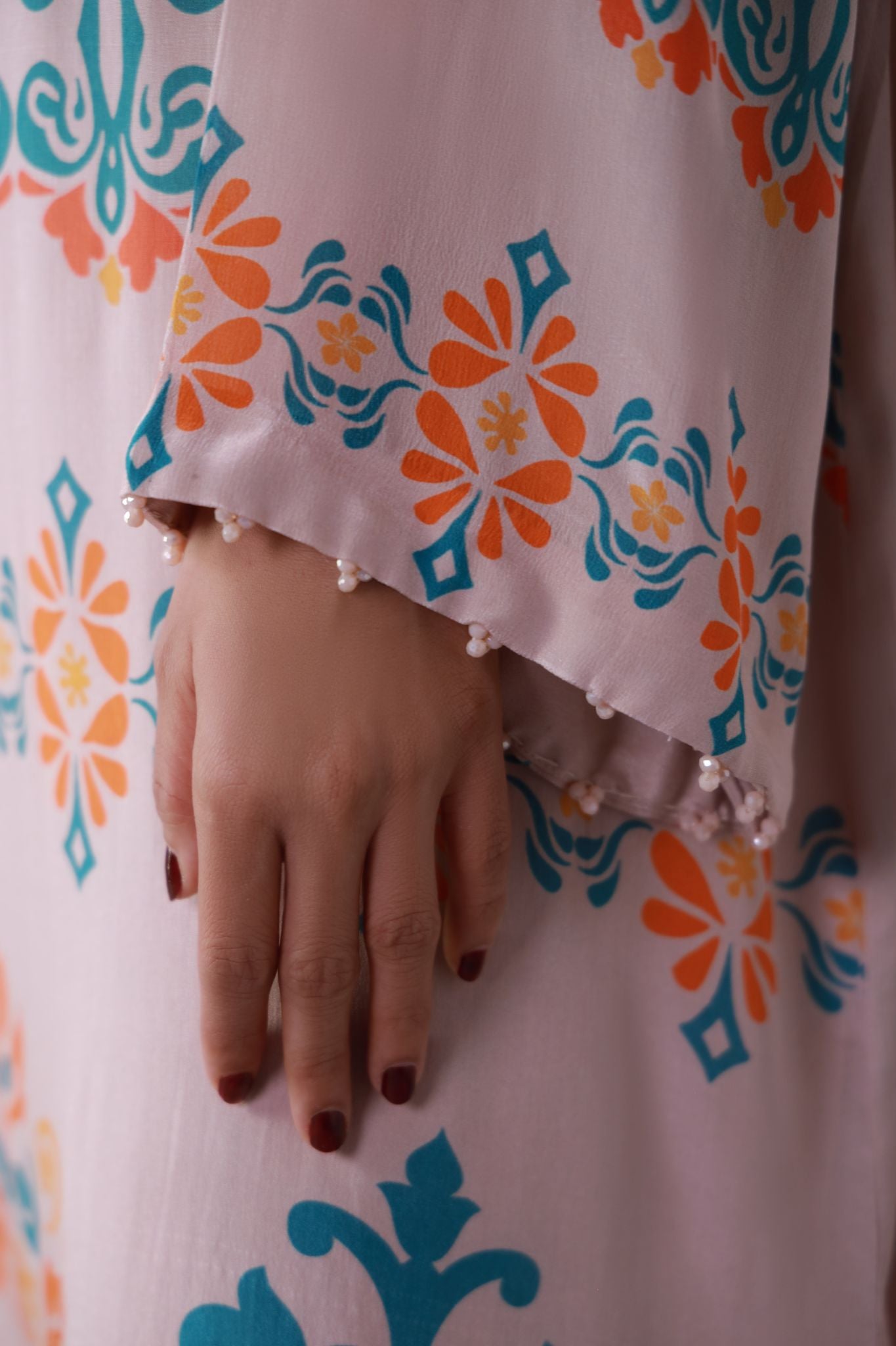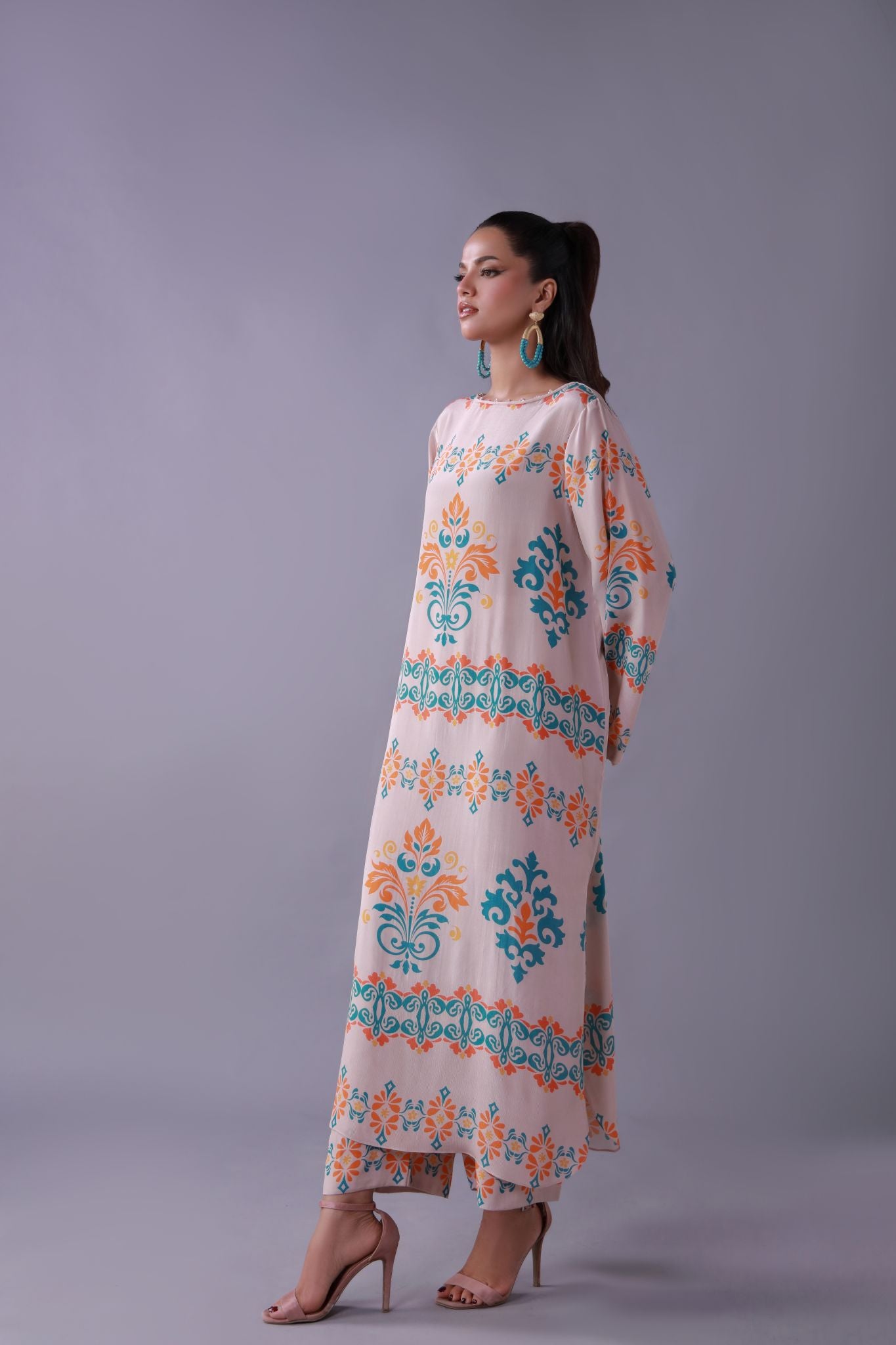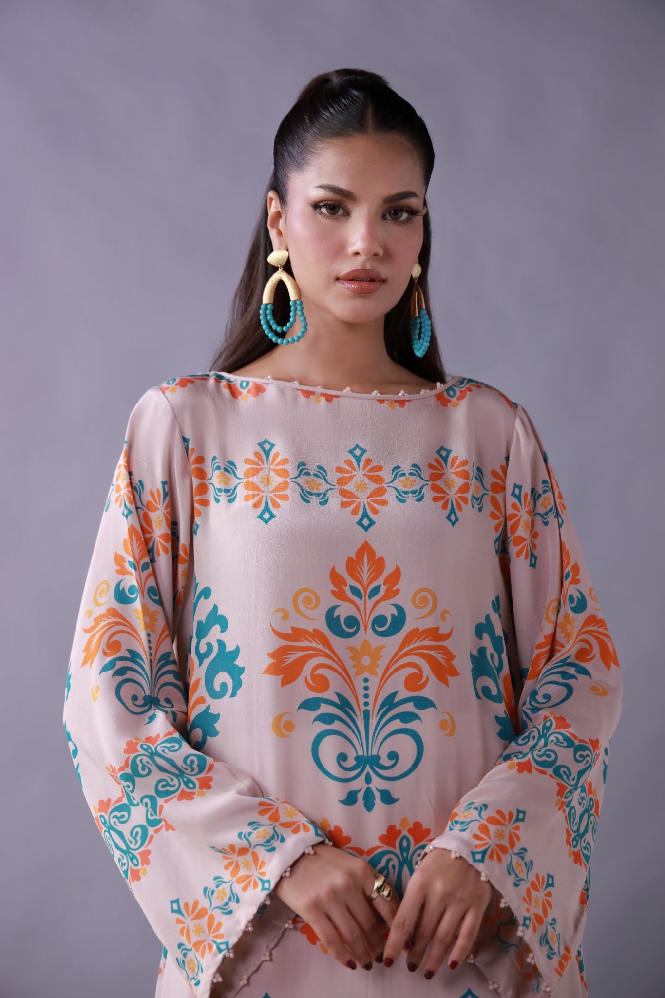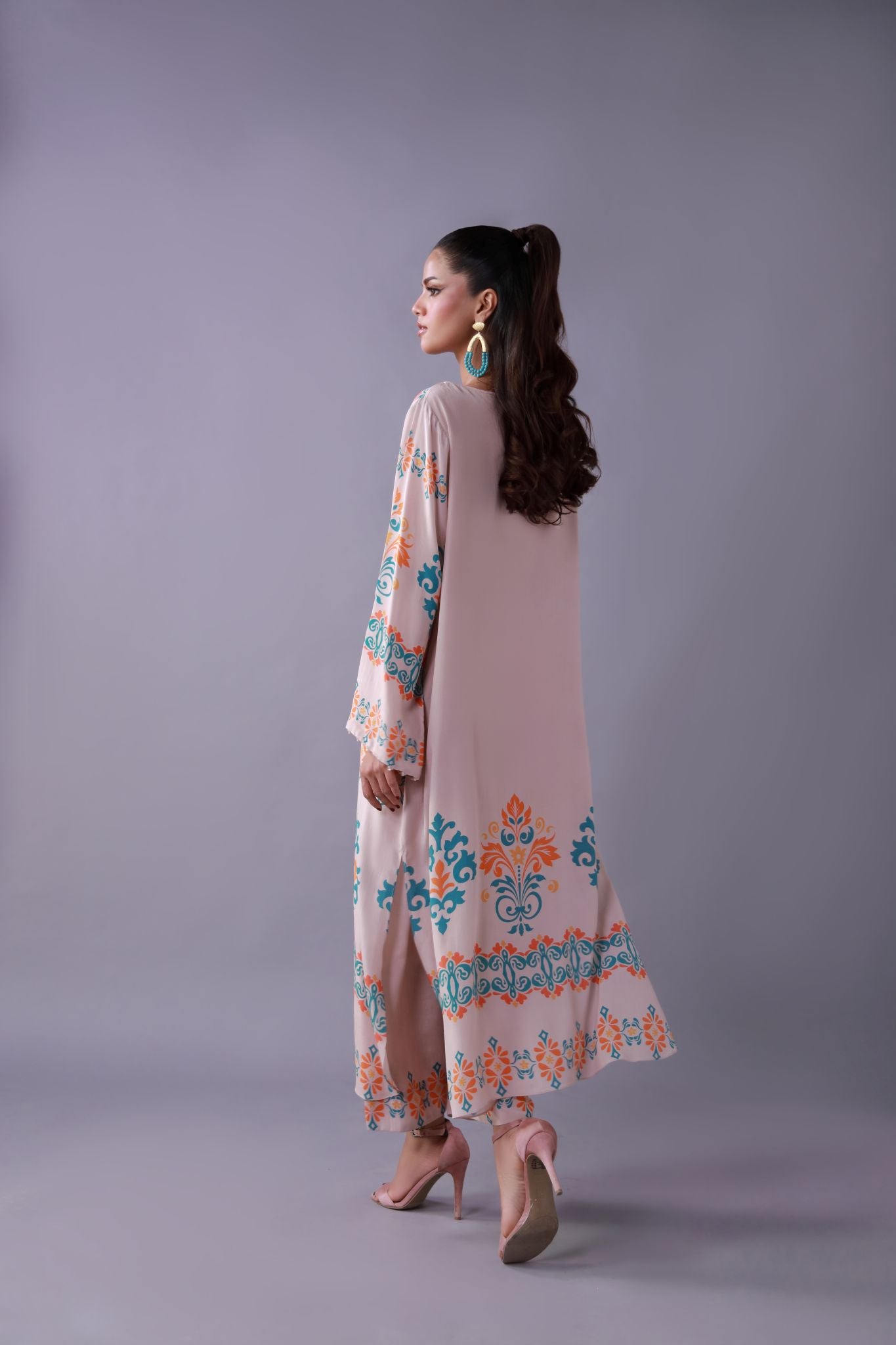 bursting with vibrant energy, naura plays with marigold and teal florals on a soft blush base. this pure crape silk set flows effortlessly with its airy silhouette, making it an elegant choice for summer soirées or day events with flair.