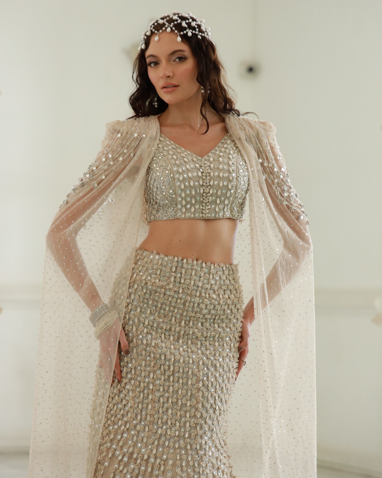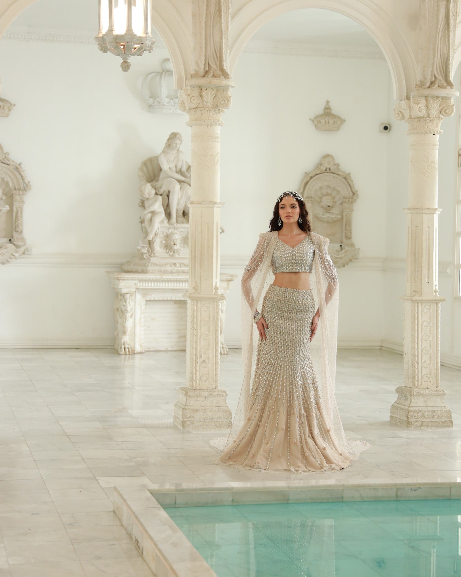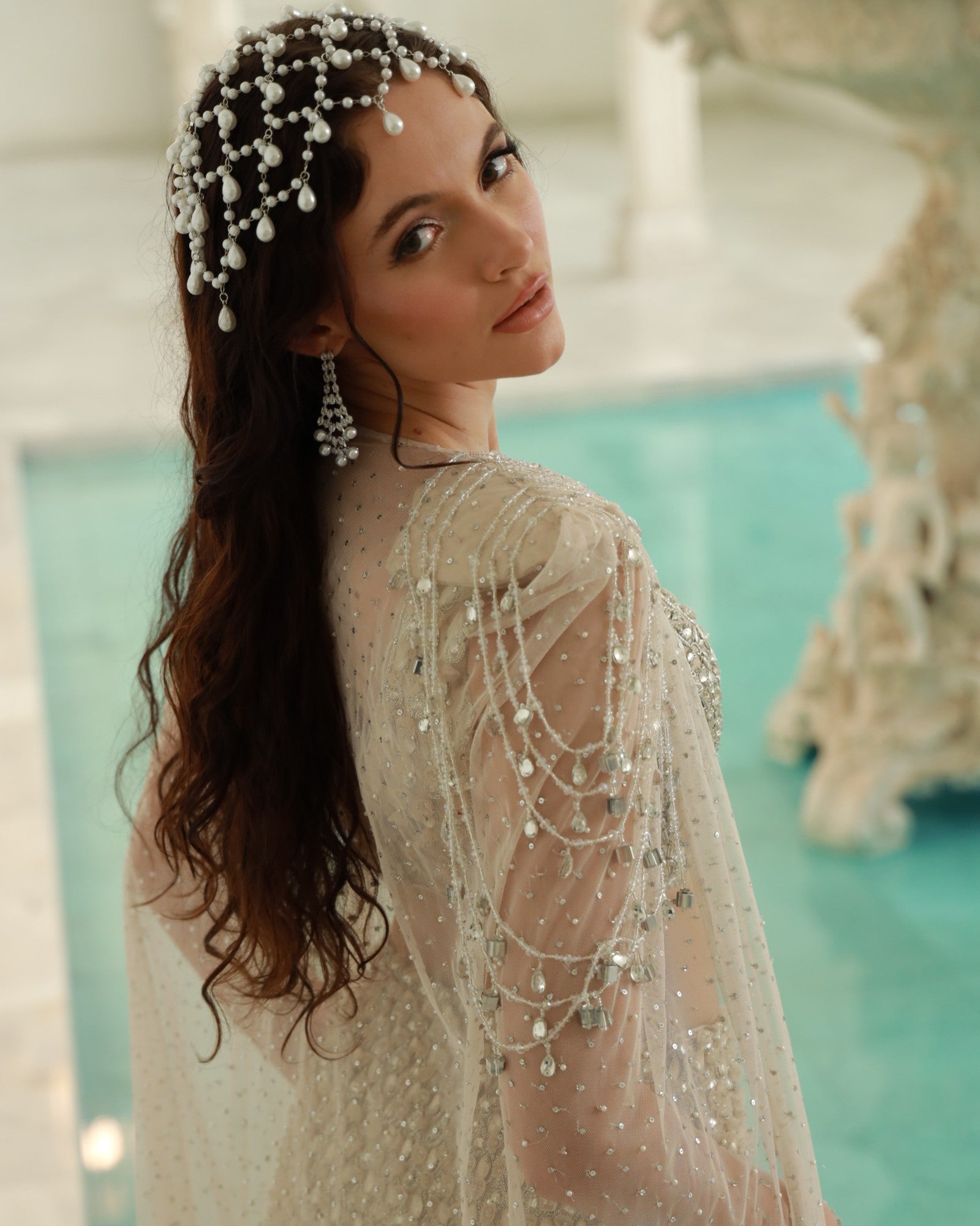 A sculpted mermaid silhouette adorned with pearls and crystals, Naurel embodies modern opulence with a regal edge.