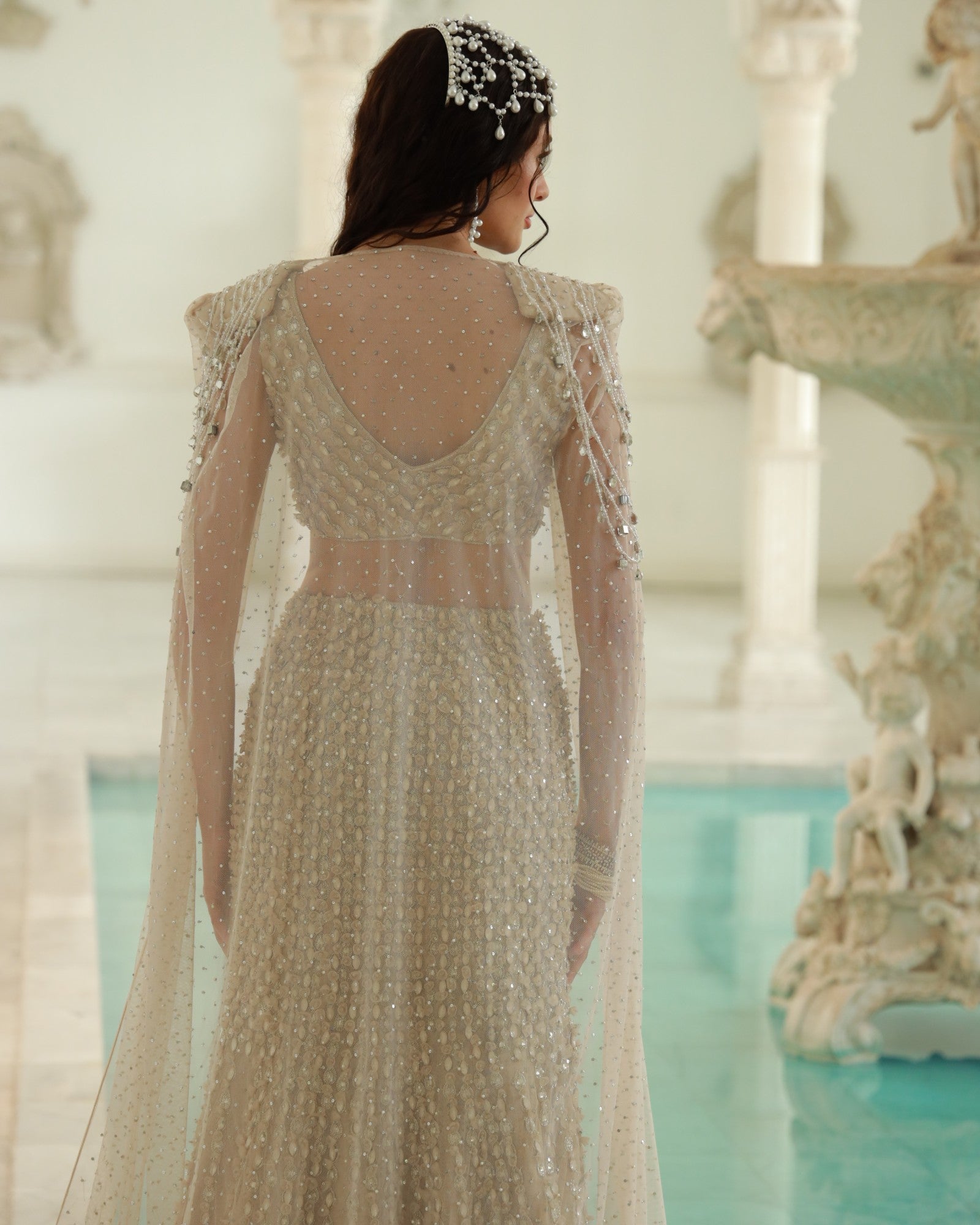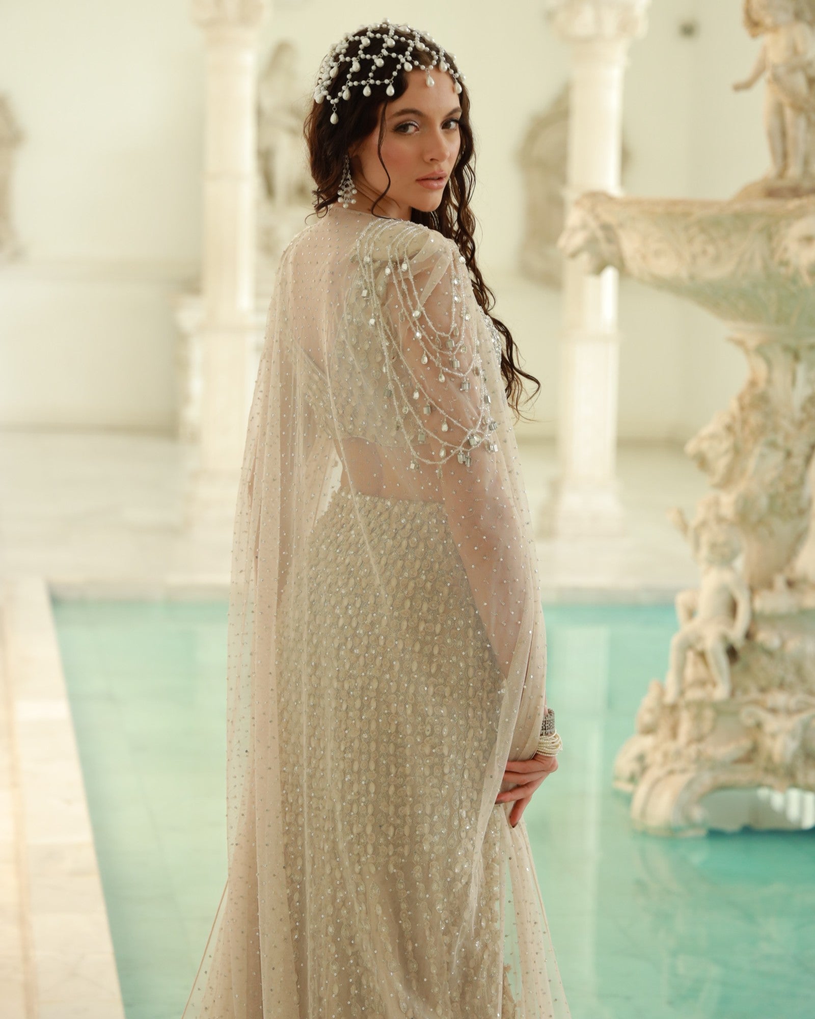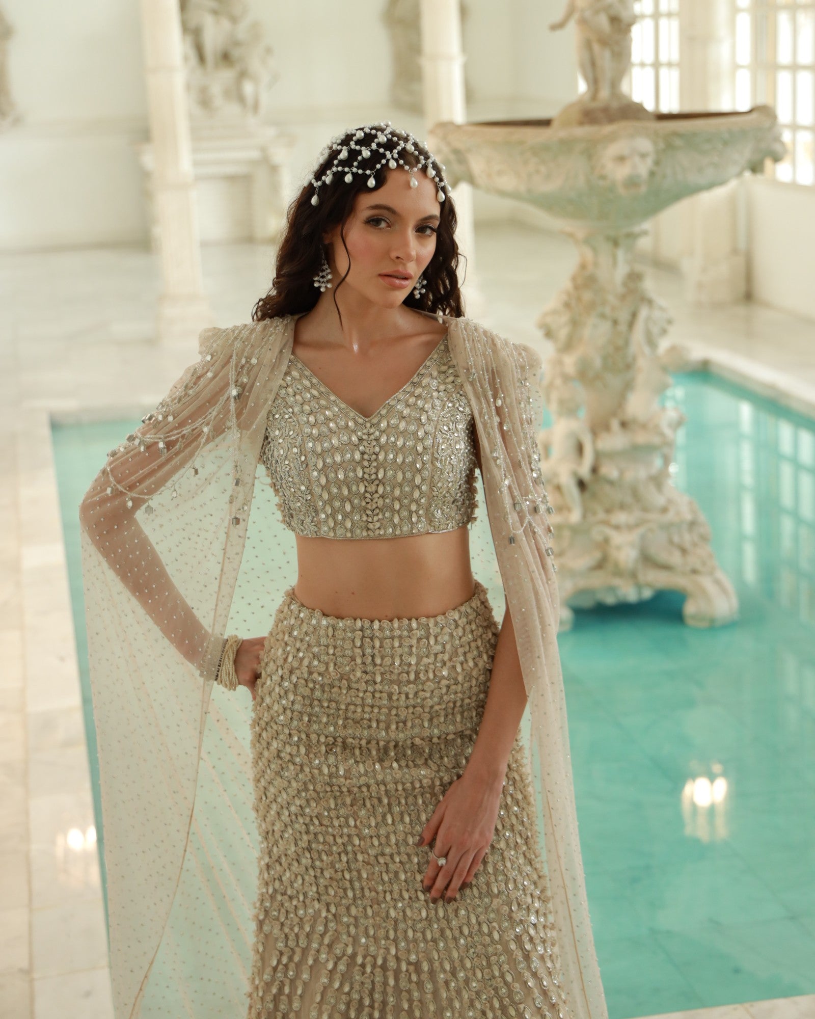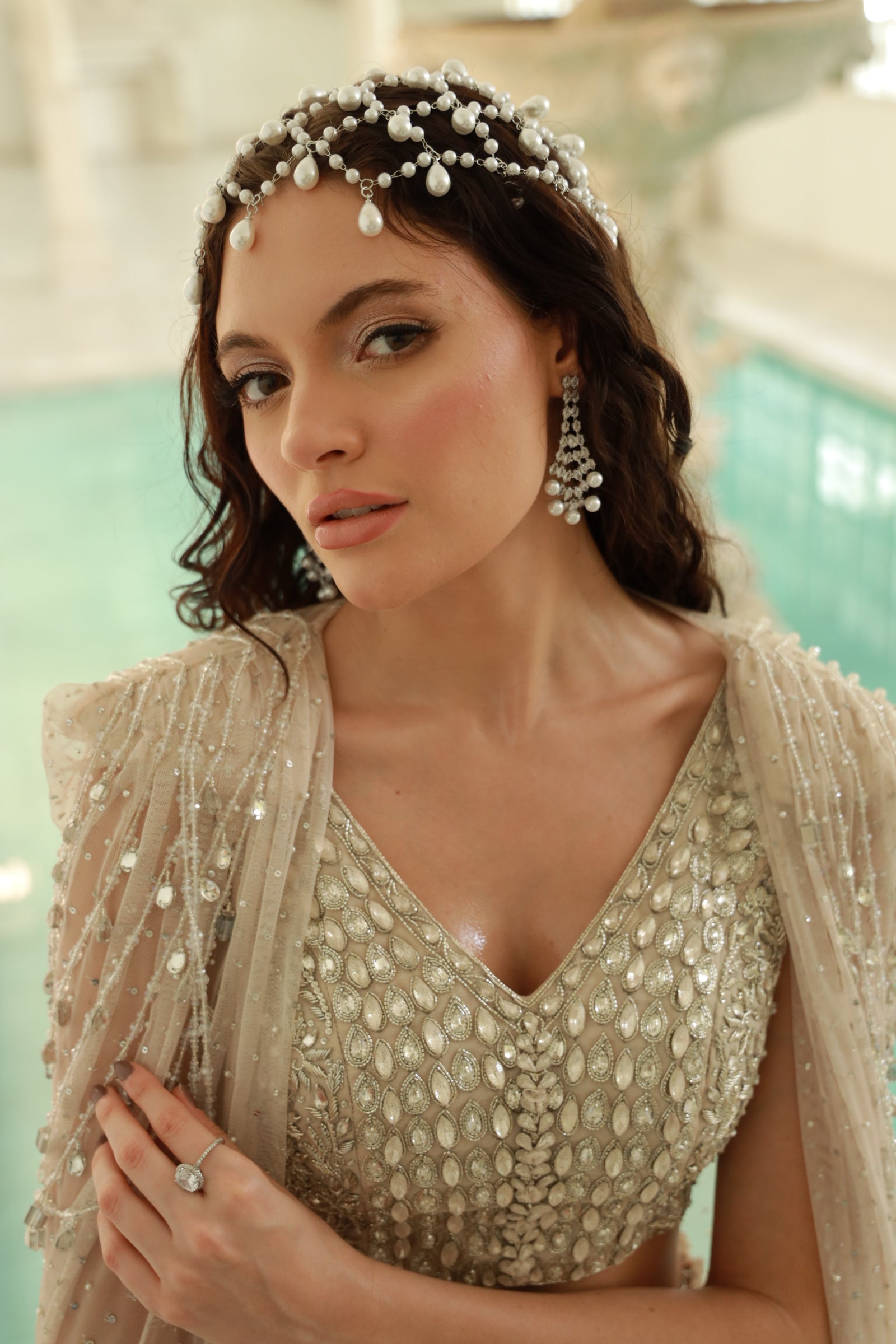A sculpted mermaid silhouette adorned with pearls and crystals, Naurel embodies modern opulence with a regal edge.