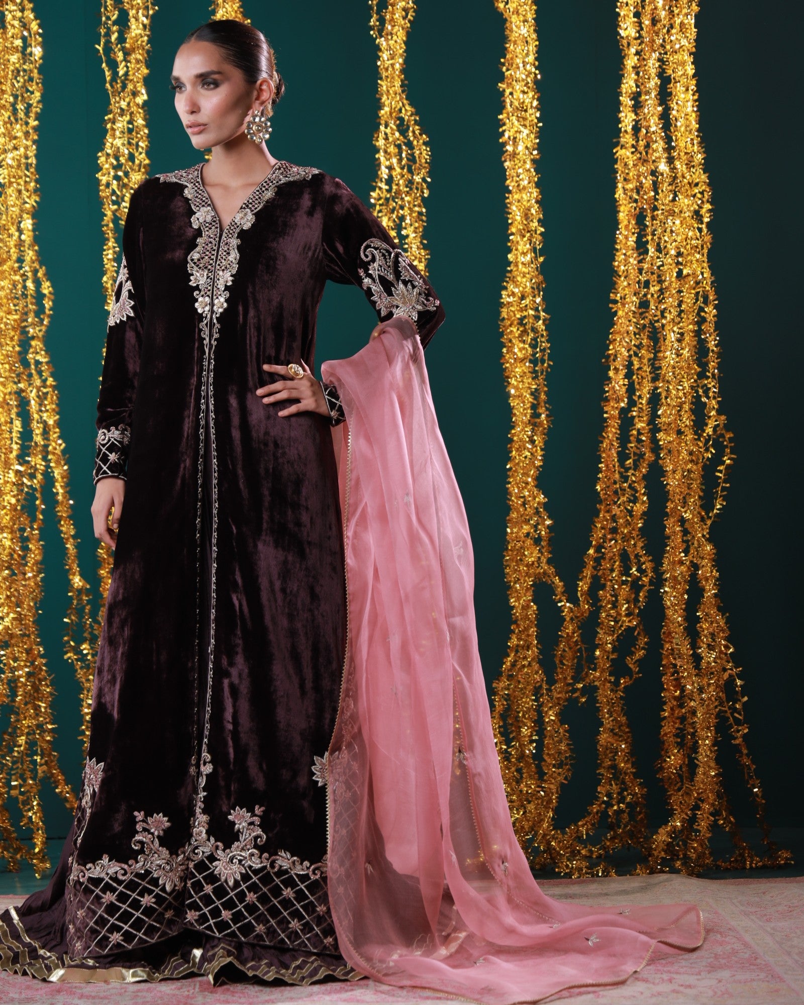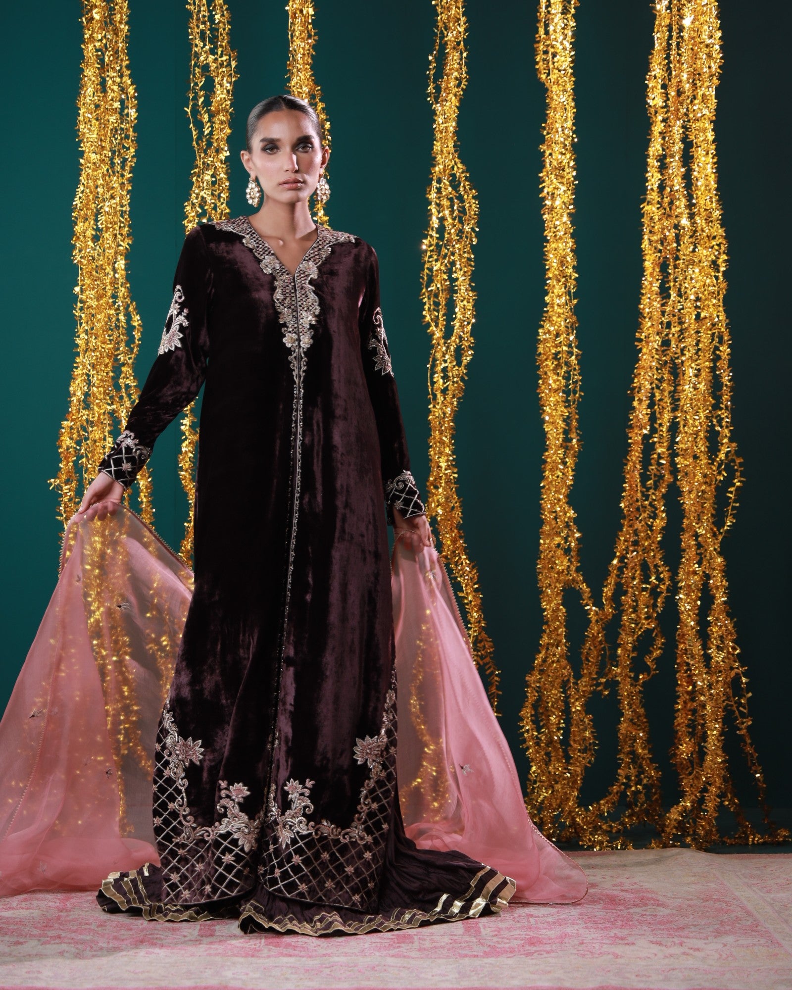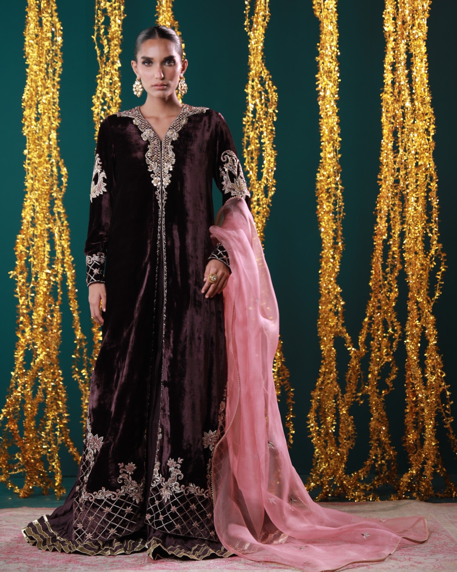 Zohra is an ode to celestial grace — a rich plum velvet peshwas adorned with delicate antique embroidery, accented with ornate sleeves and a scalloped hem. Paired with a blush pink dupatta, this look radiates quiet luxury, making it the perfect choice for intimate weddings, nikkah ceremonies, or regal winter soirées.