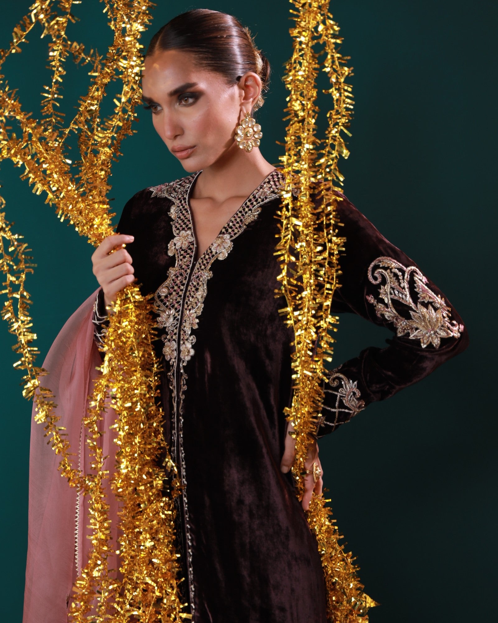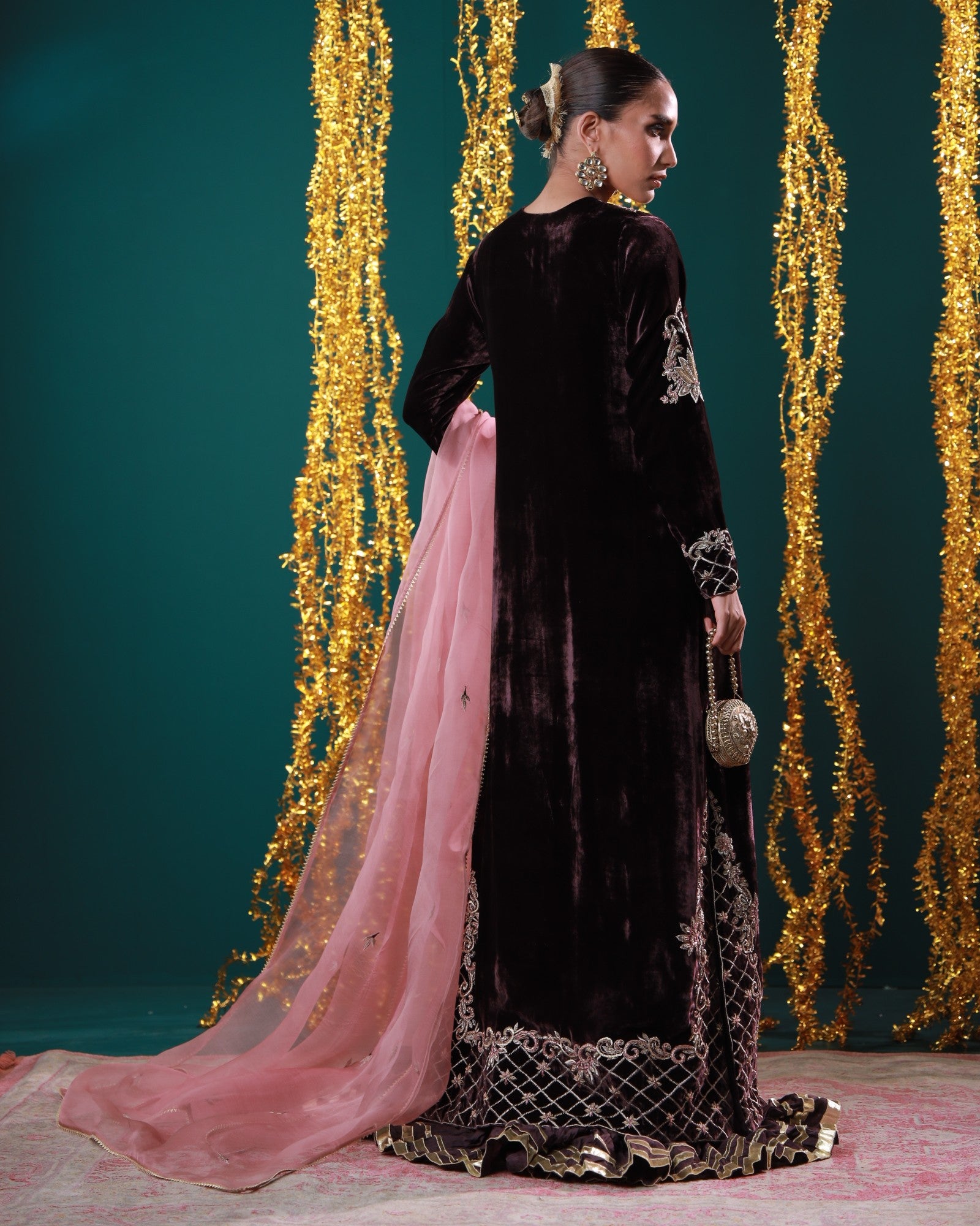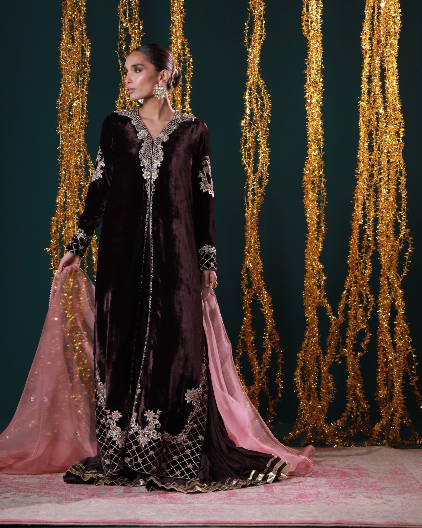 Zohra is an ode to celestial grace — a rich plum velvet peshwas adorned with delicate antique embroidery, accented with ornate sleeves and a scalloped hem. Paired with a blush pink dupatta, this look radiates quiet luxury, making it the perfect choice for intimate weddings, nikkah ceremonies, or regal winter soirées.